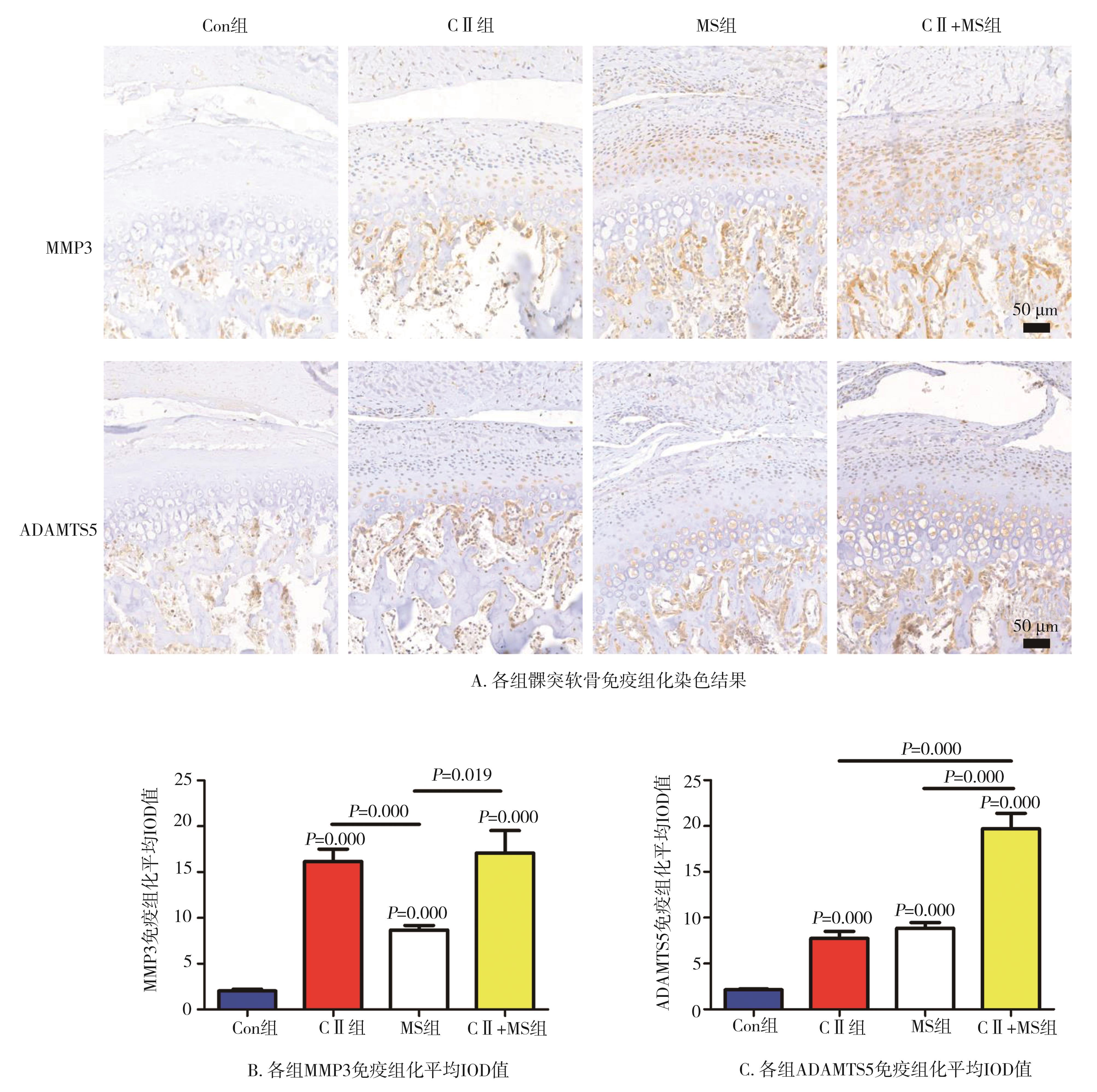 摘要:目的 研究异常机械负荷在大鼠颞下颌关节软骨退变中的作用。方法 36只8周龄雌性SD大鼠随机分为4组,分别为对照组(control group,Con组)、Ⅱ型胶原蛋白酶组(collagenase type Ⅱ group,CⅡ组)、大张嘴组(wide mouth opening group,MS组)和Ⅱ型胶原酶+大张嘴组(collagenase type Ⅱ+wide mouth opening group,CⅡ+MS组)。HE染色、番红O-固绿染色观测软骨组织病理学变化,免疫组化实验检测炎性因子基质金属蛋白酶3(matrix metalloproteinase 3,MMP3)和聚蛋白多糖酶5(a disintegrin and metalloproteinase with thrombospondin motifs 5,ADAMTS5)的表达。结果 与Con组相比,CⅡ、MS和CⅡ+MS组大鼠颞下颌关节软骨后区总厚度、钙化层厚度和番红O阳性面积比均显著降低(均P<0.05),CⅡ、MS和CⅡ+MS组中MMP3和ADAMTS5的阳性表达均显著增高(均P=0.000);与CⅡ和MS组相比,CⅡ+MS组软骨钙化层厚度显著降低(均P=0.000),ADAMTS5表达显著增高(均P=0.000);MS和CⅡ+MS组软骨后区潮线呈波浪状。结论 异常机械负荷促使髁突软骨后区退变及改建,这将有助于异常负荷致颞下颌关节骨关节炎的机制研究。