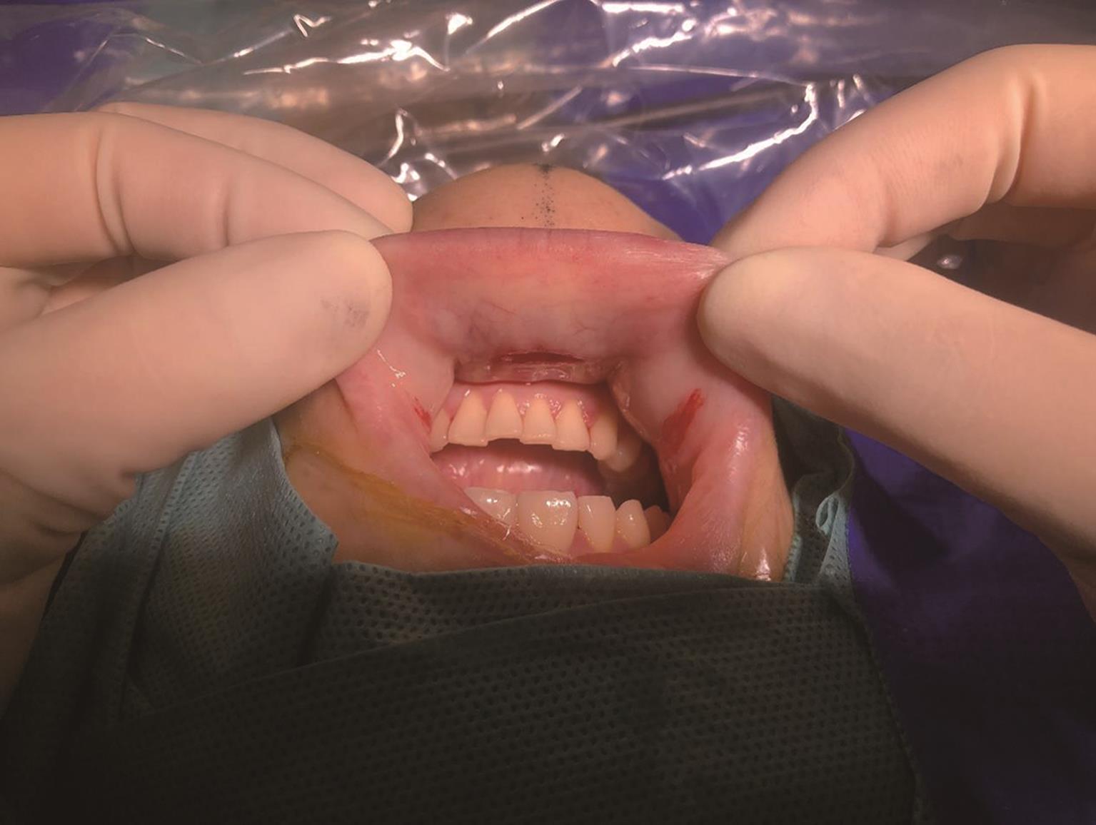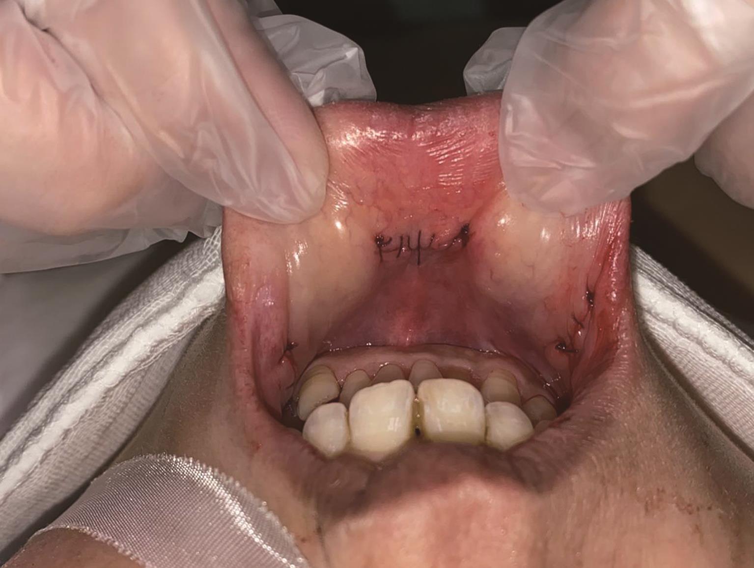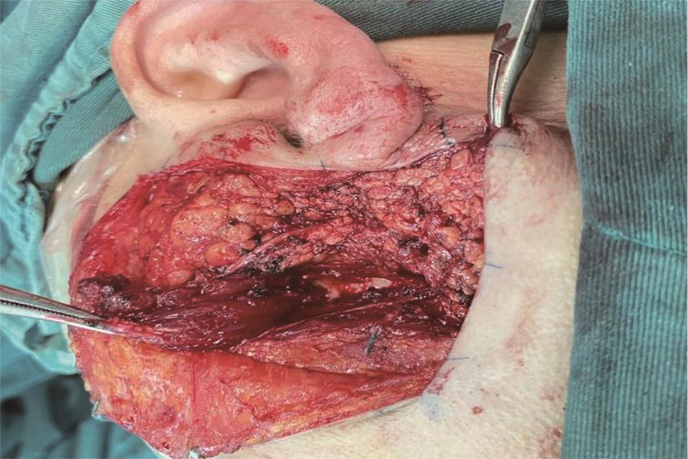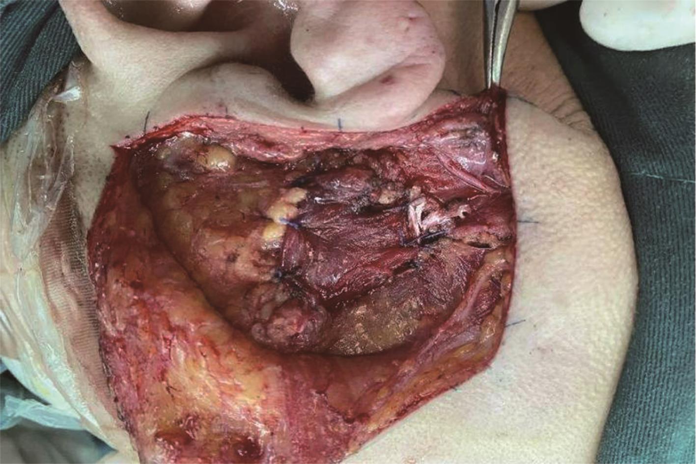 摘要:目的 分析咬肌瓣改善腮腺浅叶前缘良性肿瘤切除术后并发症的临床疗效。方法 回顾性分析2020年1月至2021年1月于重庆医科大学附属第一医院行腮腺浅叶前缘良性肿瘤切除术的患者共42 例,试验组18 例进行同期咬肌瓣旋转修复;对照组24 例不进行同期肌瓣的转移,仅拉拢缝合。随访收集分析以上所有患者术后半年内涎瘘、一年内味觉出汗综合征(Frey’s syndrome,FS)发生率及一年内凹陷畸形的主客观评分。结果 通过SPSS 25.0软件进行统计学分析,试验组和对照组凹陷畸形主客观评分有统计学意义(主观:1.33±0.84 vs. 2.46±0.78,P=0.000;客观:1.00±0.77 vs. 2.58±0.65,P=0.00);试验组与对照组涎瘘发生率(5.56% vs. 16.67%,P=0.370)与FS发生率(0.00% vs. 4.17%,P=1.000)无统计学意义。结论 咬肌瓣对腮腺浅叶前缘良性肿瘤术后的凹陷畸形修复有一定临床意义,可能是腮腺肿瘤术后缺损修复的新方法。
