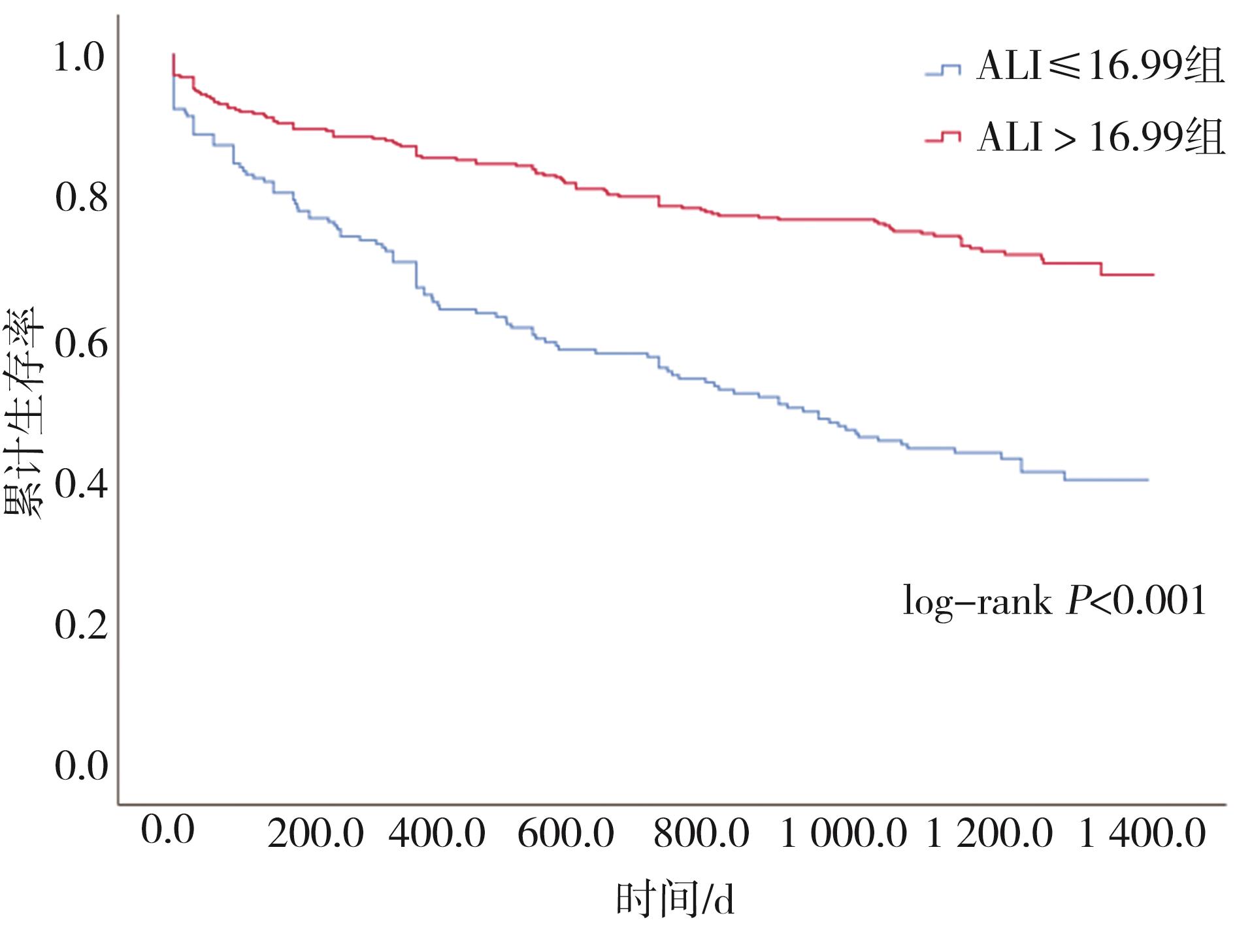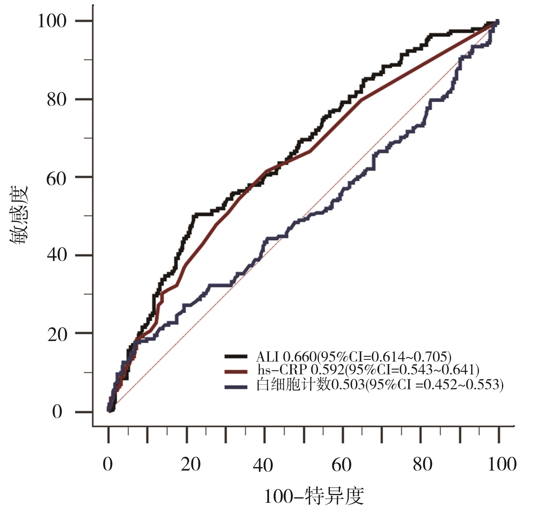 摘要:目的 探讨晚期肺癌炎症指数(advanced lung cancer inflammation index,ALI)对心房颤动(atrial fibrillation,AF)合并心力衰竭(heart failure,HF)患者全因死亡的预测价值。方法 收集重庆医科大学附属第一医院的AF合并HF(AF-HF)患者临床资料,使用受试者工作特征(receiver operating characteristic,ROC)曲线评估ALI对全因死亡预测的能力,采用约登指数算取ALI的截断值,根据患者入院时ALI值分组(ALI>16.99组,ALI≤16.99组),并用Kaplan-Meier曲线对2组生存时间进行检验,最后利用多因素Cox逐步回归,分析ALI对本人群全因死亡的影响,并将样本分为瓣膜性AF及非瓣膜性AF进行亚组分析。结果 共纳入614名AF-HF患者,其中失访49名,对剩余565患者进行统计分析,其中ALI>16.99组370例,ALI≤16.99组195例,ALI≤16.99组共出现全因死亡113例(57.9%),ALI>16.99组出现全因死亡104例(28.1%),ALI≤16.99组的年龄更大,脑钠肽(brain natriuretic peptide,BNP)、D-二聚体、中性粒细胞百分比、尿素氮、肌酐、超敏C反应蛋白(high sensitivity C-reactive protein,hs-CRP)、活化部分凝血活酶时间(activated partial thromboplastin time,APTT)、白细胞、纽约心脏病协会心功能分级(New York Heart Association,NYHA)及心房颤动抗凝治疗出血风险评分系统(HAS-BLED出血风险评分)评分更高,体质指数(body mass index,BMI)、血红蛋白、淋巴细胞计数、白蛋白(albumin,ALB)、总胆固醇、低密度脂蛋白、高密度脂蛋白更低,差异有统计学意义。ALI预测AF-HF患者发生全因死亡的曲线下面积为0.660(95%Cl=0.614~0.705,P<0.001)。多因素Cox回归分析中,ALI≤16.99、肌酐、年龄>65岁、原发性高血压是AF-HF患者全因死亡的独立危险因素。亚组分析中,ALI≤16.99为瓣膜性及非瓣膜性AF-HF患者全因死亡的独立危险因素。结论 ALI与AF-HF患者的全因死亡相关,ALI≤16.99是AF-HF患者全因死亡的独立危险因素。因此,ALI可能有助于评估AF-HF患者的预后。