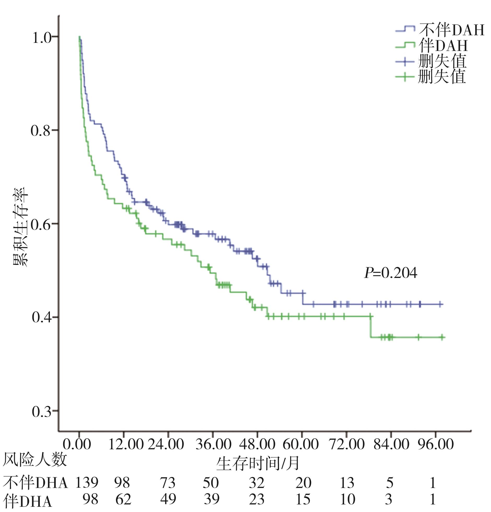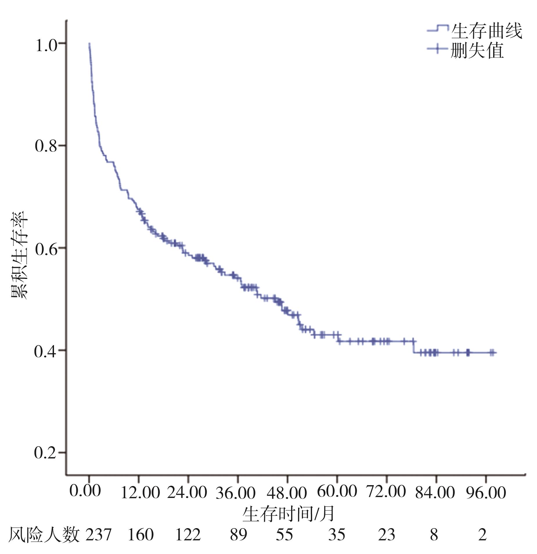 摘要:目的 探究显微镜下多血管炎(microscopic polyangiitis,MPA)肺受累的临床特征与预后因素分析。方法 回顾性分析2014年1月1日至2021年3月1日于重庆医科大学附属第一医院确诊及随访至2022年3月1日的237例MPA肺受累患者临床资料。采用Kaplan-Meier方法和Cox比例风险回归模型分析生存数据,得出累积生存率及预后因素。结果 MPA肺受累患者的平均年龄是65.18岁,中位随访时间为26.13个月。在纳入研究的237例患者中,MPA伴弥漫性肺泡出血(diffuse alveolar haemorrhage,DAH)患者98例(41.35%)。MPA肺受累患者1年、3年、5年累积生存率分别为67.50%、54.10%、43.00%。中位生存时间为45.03(0.10,97.73)个月。MPA伴DAH患者1年、3年、5年累积生存率分别为63.30%、49.40%、40.20%。Cox多因素回归分析显示年龄>65岁(HR=1.981,95%CI=1.244~3.154,P=0.004)、白细胞总数(white blood cell,WBC)>10×109个/L(HR=1.860,95%CI=1.170~2.956,P=0.009)、血清肌酐(serum creatinine,sCr)>250 μmol/L(HR=1.987,95%CI=1.217~3.243,P=0.006)、氧合指数<300 mmHg(HR=2.780,95%CI=1.696~4.557,P<0.001)、诊断时第三版伯明翰血管炎活动性评分(Birmingham vasculitis activity score version 3,BVASv.3)(HR=1.040,95%CI=1.006~1.075,P=0.020)是影响患者生存时间的独立预测因素(P<0.05)。结论 MPA肺受累患者生存率低下,年龄>65岁、WBC>10×109个/L、sCr>250 μmol/L、氧合指数<300 mmHg、诊断时BVASv.3是MPA肺受累预后不良的独立危险因素。