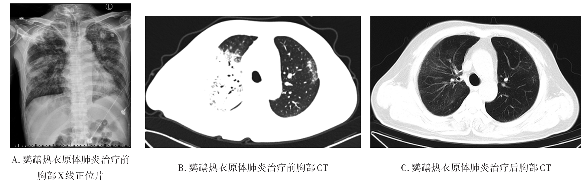 摘要:目的 探讨和分析少见鹦鹉热衣原体肺炎的临床特征、诊治及预后,以期提升临床相关学科领域对该病的认识。方法 回顾性研究赣南医学院第一附属医院2017年1月至2022年12月确诊的15例鹦鹉热衣原体肺炎患者的临床资料,总结并分析该病的临床特征、诊断与鉴别要点,同时检索国内外文献资料对鹦鹉热衣原体肺炎的最新诊疗进展予以系统性讨论。结果 纳入本研究的15例鹦鹉热衣原体肺炎患者中,男性10例(66.67%),女性5例(33.33%),年龄62(32~79)岁,禽类接触史14例(93.33%),基础疾病史8例(53.3%),转化为重症肺炎5例(33.33%)。15例患者中,白细胞计数(white blood cell count,WBC)正常8例(53.3%),WBC升高5例(33.3%),WBC减低2例(13.3%);血红蛋白(hemoglobin,HGB)正常9例(60.0%),减低6例(40.0%);中性粒细胞百分比(neutrophils,NE)升高13例(86.7%);所有患者(100.0%)C反应蛋白(C-reactive protein,CRP)均显著升高;13例(86.67%)患者降钙素原(procalcitonin,PCT)升高;12例(80.0%)患者乳酸脱氢酶(lactate dehydrogenase,LDH)升高;11例(73.33%)肝功能异常;8例(53.33%)肾功能异常;6例(40.0%)凝血功能异常;13例(86.7%)电解质紊乱。此外,11例(73.33%)患者动脉血气分析显示不同程度血氧分压降低,8例(53.33%)氧合指数(oxygenation index,OI)低于300 mmHg,4例(26.67%)患者无明显呼吸困难,未进行动脉血气分析检查。本研究所有患者均已完善经支气管镜检查,并获取支气管肺泡灌洗液(bronchoalverolar lavage fluid,BALF)行宏基因组二代测序(metagenomic next-generation sequencing,mNGS)检测,检出的病原体除鹦鹉热衣原体外,所有患者均合并多种病原体感染。15例患者均已完善肺部电子计算机断层扫描(computed tomography,CT)等影像学检查,单侧肺部实变7例(46.67%),双侧实变8例(53.33%);9例(60.0%)患者伴有胸腔积液,部分患者可以表现出多种影像学表现,包括实变影、磨玻璃影、团块样实变影、反晕征、纵隔和肺门淋巴结肿大等。15例鹦鹉热衣原体肺炎患者在确诊后均予规范抗感染治疗,其中5例重症肺炎患者中2例患者予体外膜肺氧合(extracorporeal membrane oxygenation,ECMO)辅助治疗,所有患者均未见治疗相关不良反应或不良事件,平均住院日为13.9 d。本研究所有患者未见死亡,均好转出院。结论 鹦鹉热衣原体肺炎临床特征及表现缺乏特异性,易出现重症化,经支气管肺泡灌洗液予mNGS检测可精准确诊,早期予四环素类及喹诺酮类抗生素可最大程度改善患者预后。