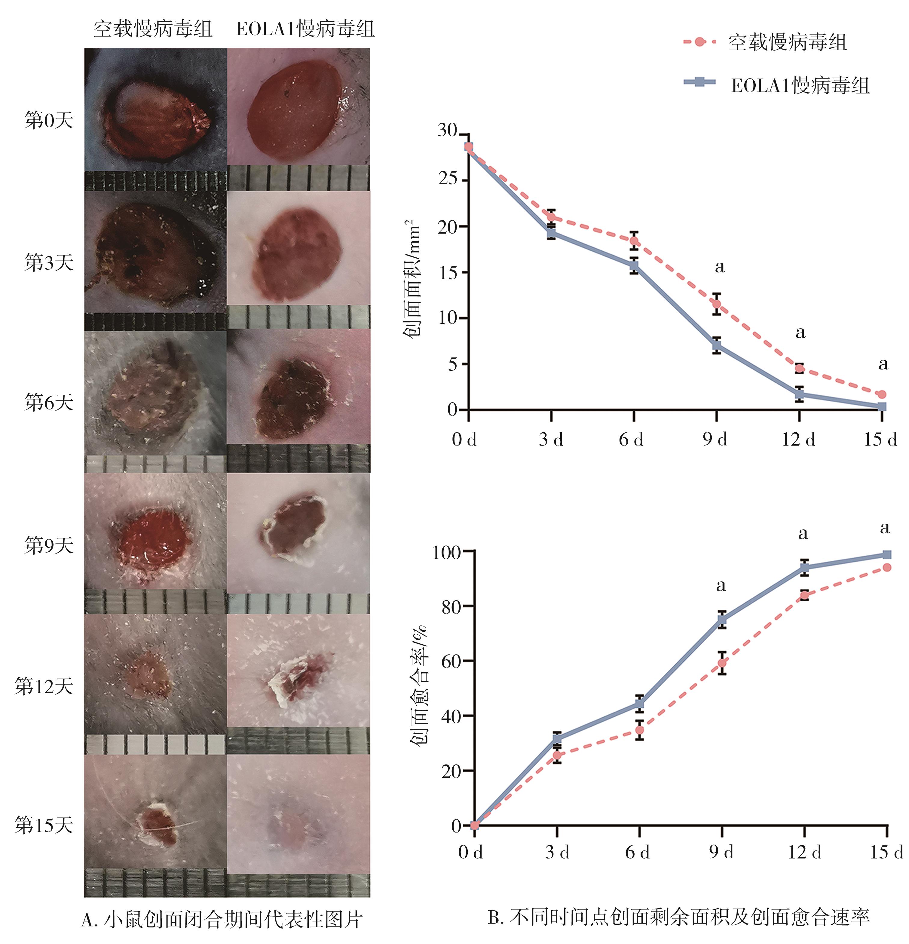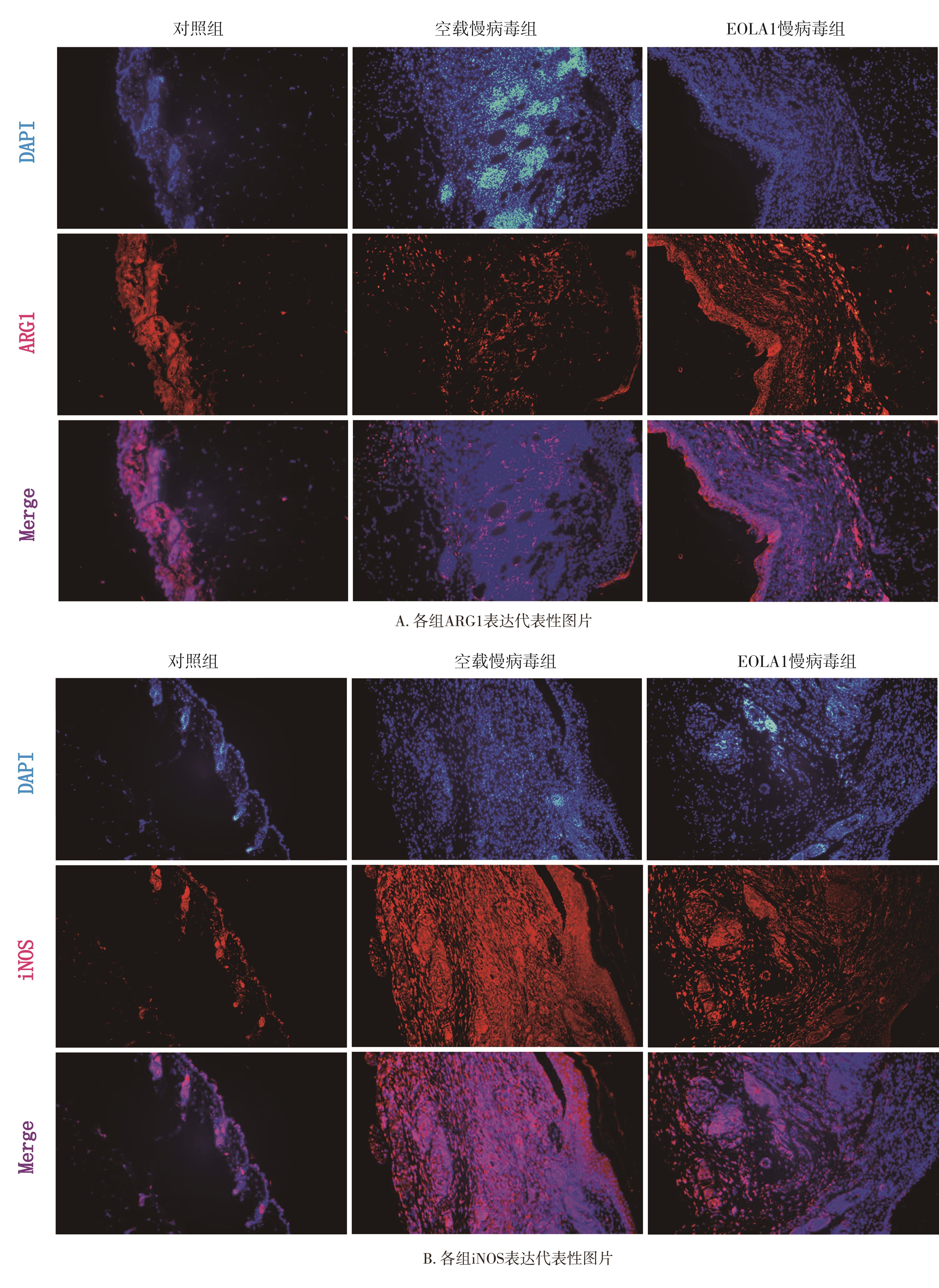 摘要:目的 探讨内皮高表达脂多糖相关因子1(endothelial-overexpressed lipopolysaccharide-associated factor 1,EOLA1)对2型糖尿病小鼠皮肤创面促愈合效果及机制。方法 选取SPF级6周龄db/db糖尿病小鼠,构建全层皮肤创面模型,在创口周边注射EOLA1高表达慢病毒。小鼠分为正常对照组、空载体慢病毒组、EOLA1慢病毒组。除正常对照组外,拍照记录不同时期小鼠创口愈合情况,造模第15天取创口及周边皮肤,HE染色观察创面肉芽组织及炎性浸润,Masson染色观察创面胶原纤维沉积,免疫荧光检测ARG1、iNOS观察巨噬细胞分型,Western blot及Real-time PCR检测NF-κB信号通路IκB-α、p-IκB-α、p65蛋白表达和EOLA1、TLR4、TNF-α、IL-1β基因表达水平。结果 与空载慢病毒组相比,EOLA1慢病毒组小鼠皮肤伤口愈合速度加快,肉芽组织及胶原纤维形成增多。EOLA1慢病毒组M2型巨噬细胞标志物ARG1表达升高,M1型巨噬细胞标志物iNOS表达降低。EOLA1慢病毒组IκB-α蛋白表达升高,p-IκB-α蛋白表达降低,TNF-α、IL-1β基因表达水平下调。结论 EOLA1可抑制糖尿病小鼠皮肤创面局部炎症,加速创面愈合,其机制可能为通过上调巨噬细胞内IκB-α表达,封闭p65活性,从而抑制炎症因子TNF-α、IL-1β的释放,巨噬细胞的表型也表现为从促炎症的M1型向促愈合的M2型转变。提示EOLA1在糖尿病创面具有抗炎促愈的潜力。
