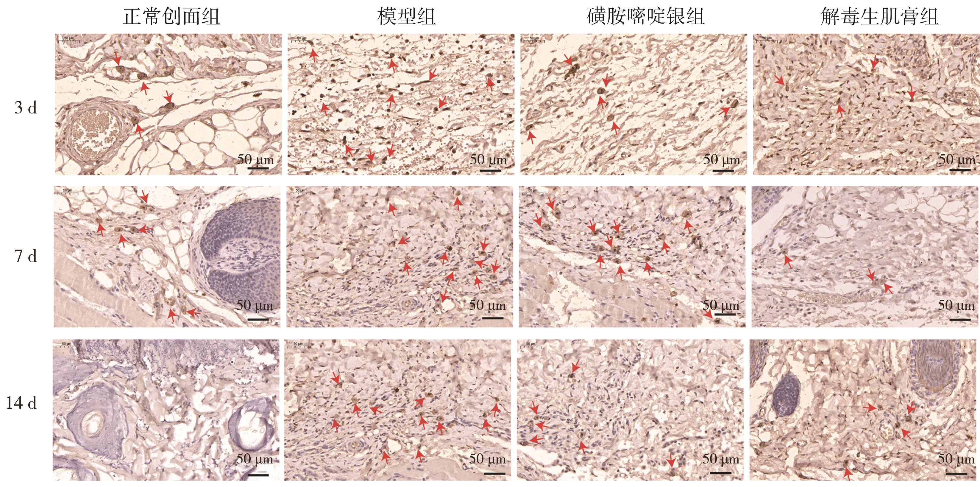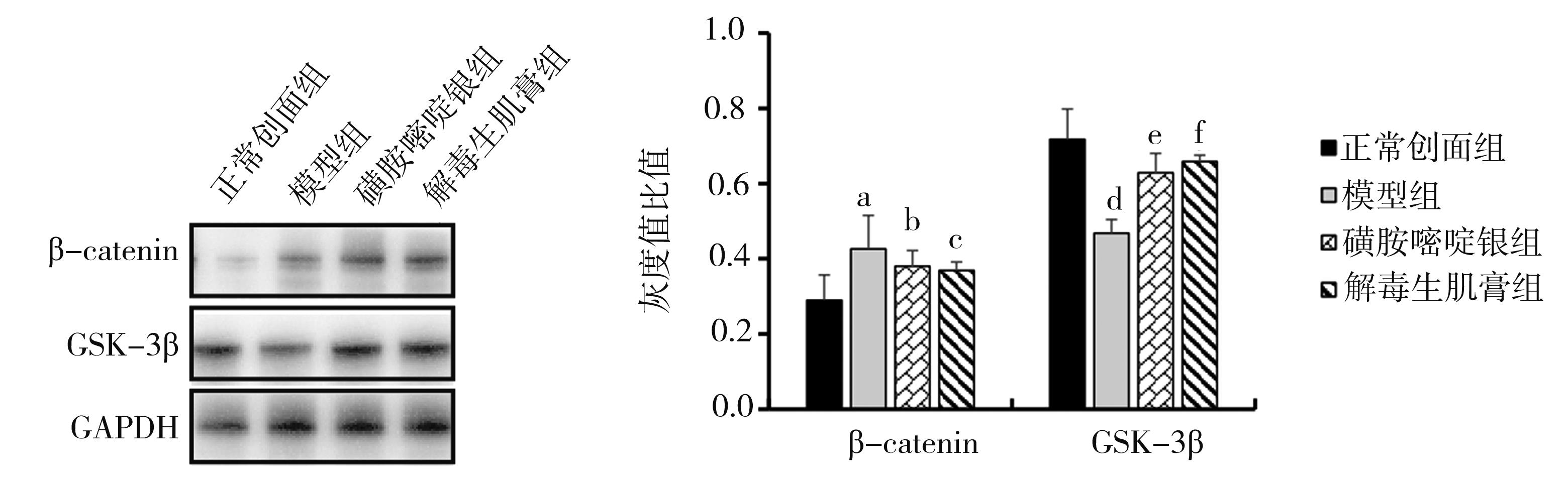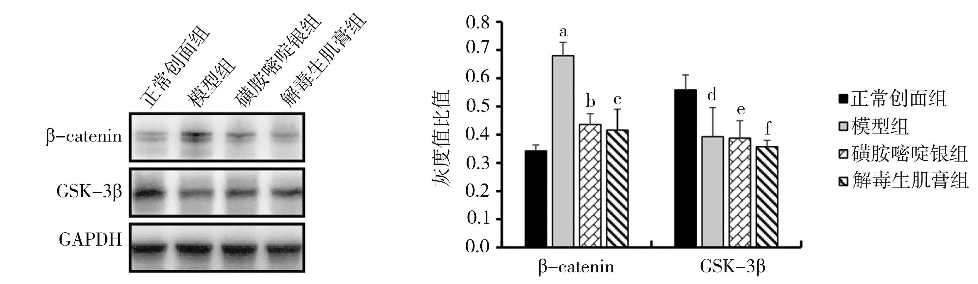 摘要:目的 从GSK-3β/β-catenin角度探讨炎症反应对糖尿病SD大鼠慢性创面修复的影响。方法 使用高脂饲料喂养联合腹腔注射链脲霉素(Streptozocin,STZ)及手术制备全层皮肤缺损的方法建立糖尿病SD大鼠创面模型,成模后随机分为模型组(n=15),磺胺嘧啶银组(n=15)及解毒生肌膏组(n=15),并设立正常创面组(n=15)。磺胺嘧啶银组创面和解毒生肌膏组创面予以磺胺嘧啶银软膏和解毒生肌膏外敷,每日1次,模型组与正常创面组不予干预。给药后第3天、7天和14天肉眼观察各组大鼠的创面愈合情况,计算创面愈合率;HE观察组织基本形态;Masson检测胶原生成情况;超微电镜观察内质网结构差异;免疫组织化学法检测肿瘤坏死因子-α(Tumor necrosis factor-α,TNF-α)和白细胞介素-6(Interleukin-6,IL-6)表达;蛋白质免疫印迹法检测糖原合成酶激酶-3β(glycogen synthase kinase-3β,GSK-3β)蛋白和β-连环蛋白(β-catenin)蛋白表达。结果 给药后3天解毒生肌膏组创面愈合率高于模型组(P<0.05);给药后14天解毒生肌膏组创面愈合率高于磺胺嘧啶银组(P<0.05)。HE结果 给药后3、7天解毒生肌膏组创面较其他组肿胀程度较小,毛细血管数量丰富;14天,解毒生肌膏组和正常创面组出现皮肤附属器新生,组织结构完整度好。Masson结果 解毒生肌膏组较其他各组胶原纤维分布均匀,排列结构较为整齐,新生胶原纤维更为粗壮,分布均匀,排列整齐。电镜结果:解毒生肌膏组内质网丰富,数量较多,形态结构趋于正常。免疫组织化学法结果:与模型组相比,各组TNF-α、IL-6表达水平明显降低;解毒生肌膏组TNF-α表达水平低于正常创面组;解毒生肌膏组TNF-α、IL-6表达低于磺胺嘧啶银组。Western blot法结果显示:与正常创面组相比,各组β-catenin表达量均上调(P<0.05),解毒生肌膏组上调表达量最少;与正常创面组相比,各组GSK-3β蛋白表达含量明显下调(P<0.05);给药后7天,磺胺嘧啶银组和解毒生肌膏组GSK-3β蛋白表达含量上调(P<0.05),但仍低于正常创面组。结论 解毒生肌膏作用糖尿病大鼠创面修复机制通过调控GSK-3β和β-catenin表达,使炎症因子IL-6和TNF-α表达下调,最终达到糖尿病大鼠慢性创面愈合。