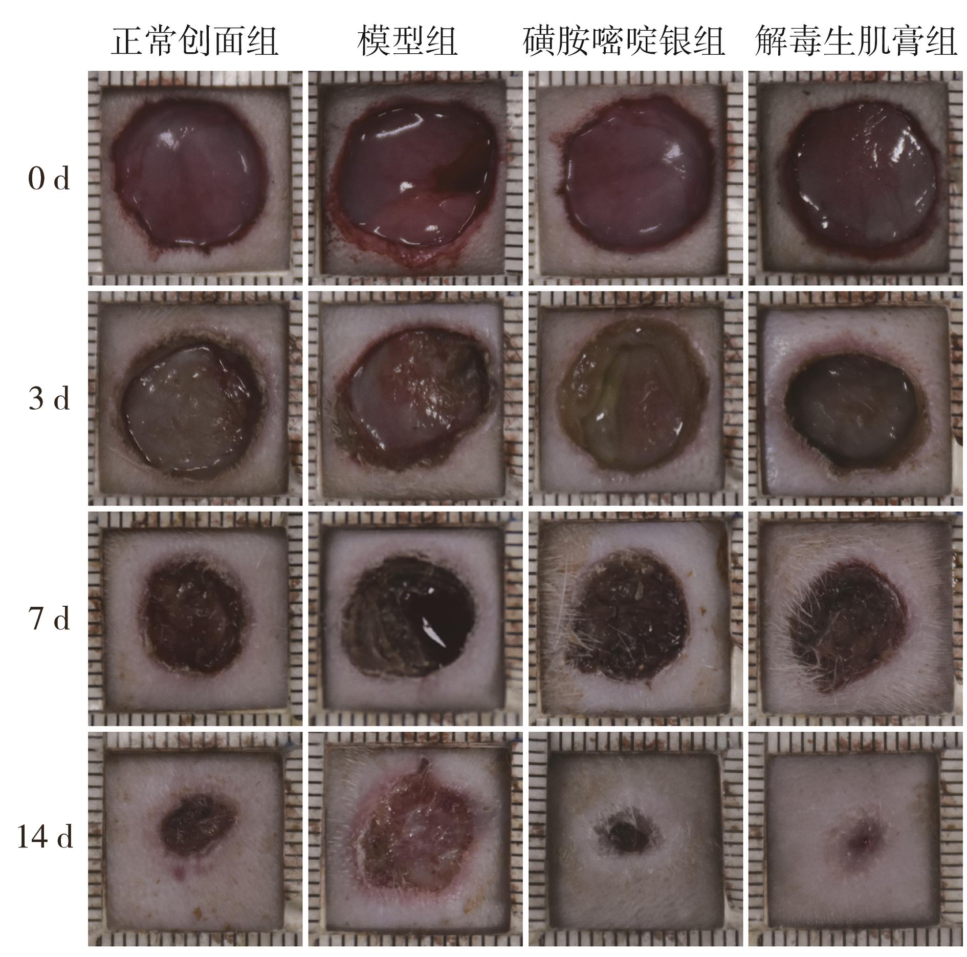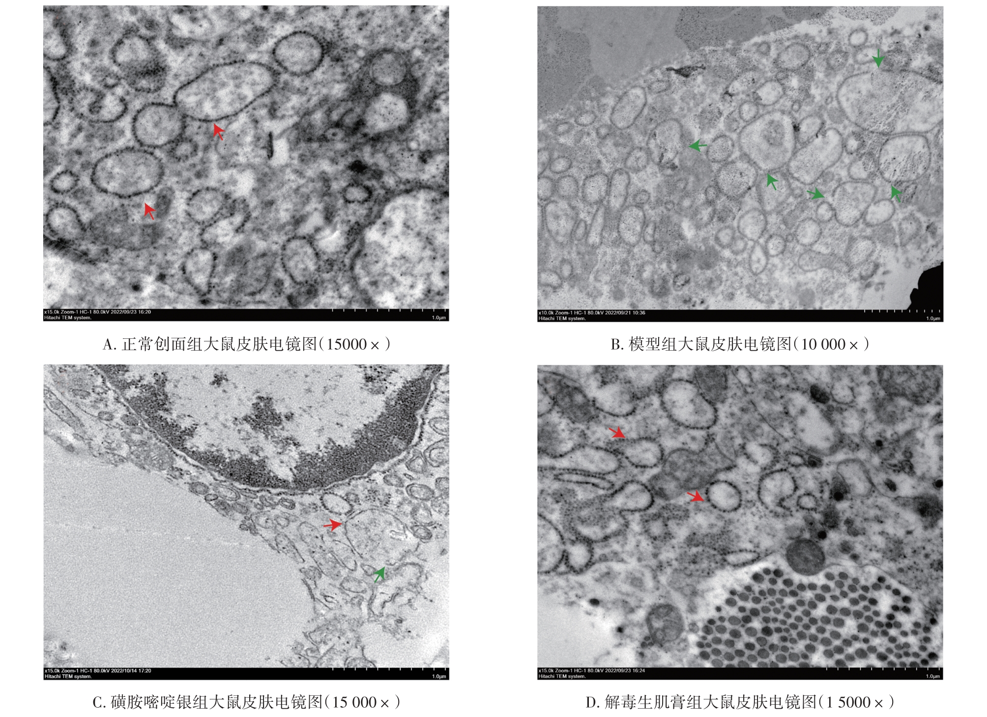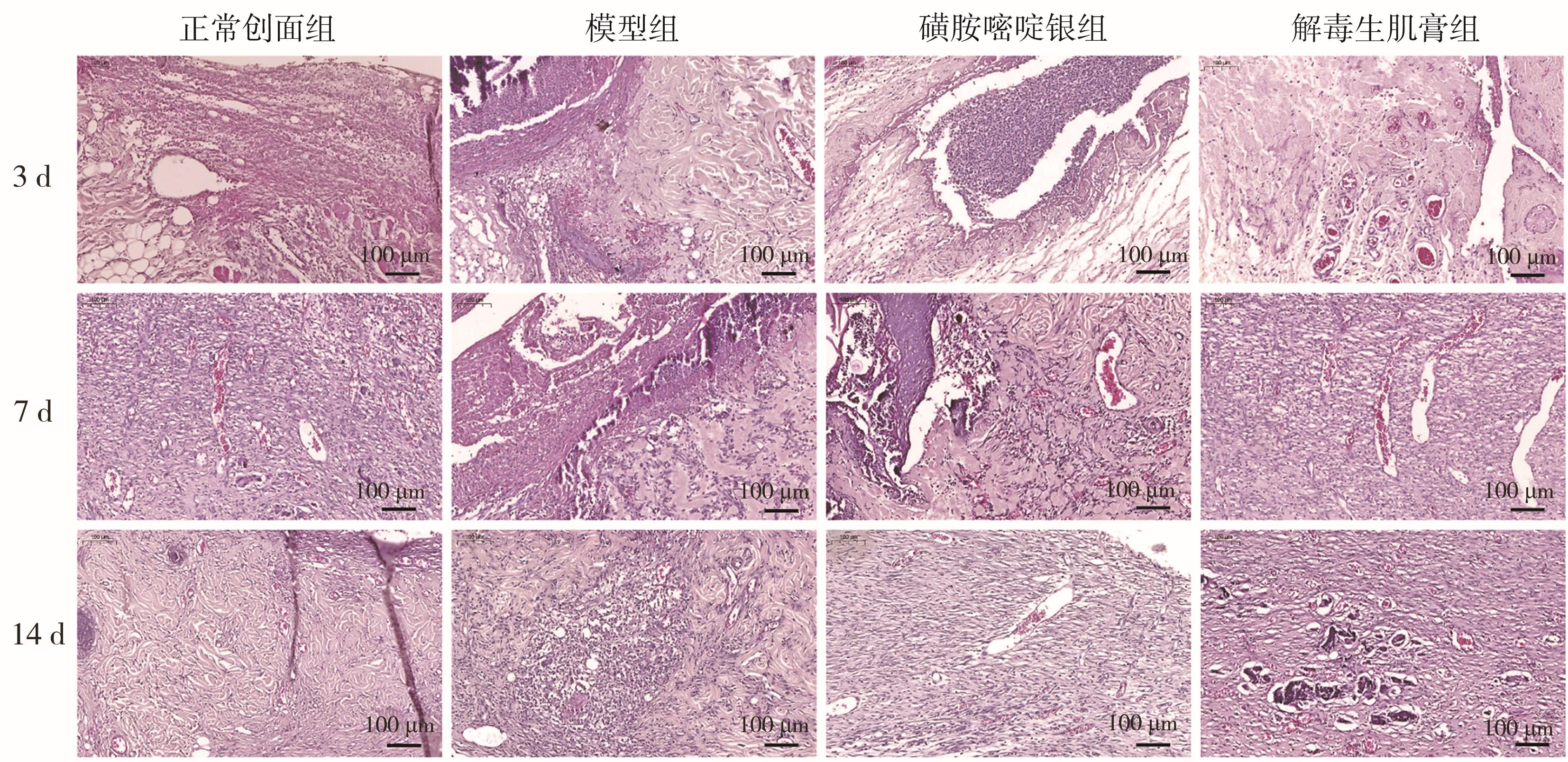 摘要:目的 从GSK-3β/β-catenin角度探讨炎症反应对糖尿病SD大鼠慢性创面修复的影响。方法 使用高脂饲料喂养联合腹腔注射链脲霉素(Streptozocin,STZ)及手术制备全层皮肤缺损的方法建立糖尿病SD大鼠创面模型,成模后随机分为模型组(n=15),磺胺嘧啶银组(n=15)及解毒生肌膏组(n=15),并设立正常创面组(n=15)。磺胺嘧啶银组创面和解毒生肌膏组创面予以磺胺嘧啶银软膏和解毒生肌膏外敷,每日1次,模型组与正常创面组不予干预。给药后第3天、7天和14天肉眼观察各组大鼠的创面愈合情况,计算创面愈合率;HE观察组织基本形态;Masson检测胶原生成情况;超微电镜观察内质网结构差异;免疫组织化学法检测肿瘤坏死因子-α(Tumor necrosis factor-α,TNF-α)和白细胞介素-6(Interleukin-6,IL-6)表达;蛋白质免疫印迹法检测糖原合成酶激酶-3β(glycogen synthase kinase-3β,GSK-3β)蛋白和β-连环蛋白(β-catenin)蛋白表达。结果 给药后3天解毒生肌膏组创面愈合率高于模型组(P<0.05);给药后14天解毒生肌膏组创面愈合率高于磺胺嘧啶银组(P<0.05)。HE结果 给药后3、7天解毒生肌膏组创面较其他组肿胀程度较小,毛细血管数量丰富;14天,解毒生肌膏组和正常创面组出现皮肤附属器新生,组织结构完整度好。Masson结果 解毒生肌膏组较其他各组胶原纤维分布均匀,排列结构较为整齐,新生胶原纤维更为粗壮,分布均匀,排列整齐。电镜结果:解毒生肌膏组内质网丰富,数量较多,形态结构趋于正常。免疫组织化学法结果:与模型组相比,各组TNF-α、IL-6表达水平明显降低;解毒生肌膏组TNF-α表达水平低于正常创面组;解毒生肌膏组TNF-α、IL-6表达低于磺胺嘧啶银组。Western blot法结果显示:与正常创面组相比,各组β-catenin表达量均上调(P<0.05),解毒生肌膏组上调表达量最少;与正常创面组相比,各组GSK-3β蛋白表达含量明显下调(P<0.05);给药后7天,磺胺嘧啶银组和解毒生肌膏组GSK-3β蛋白表达含量上调(P<0.05),但仍低于正常创面组。结论 解毒生肌膏作用糖尿病大鼠创面修复机制通过调控GSK-3β和β-catenin表达,使炎症因子IL-6和TNF-α表达下调,最终达到糖尿病大鼠慢性创面愈合。