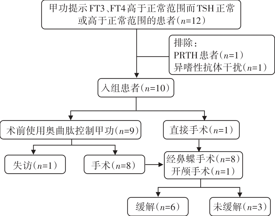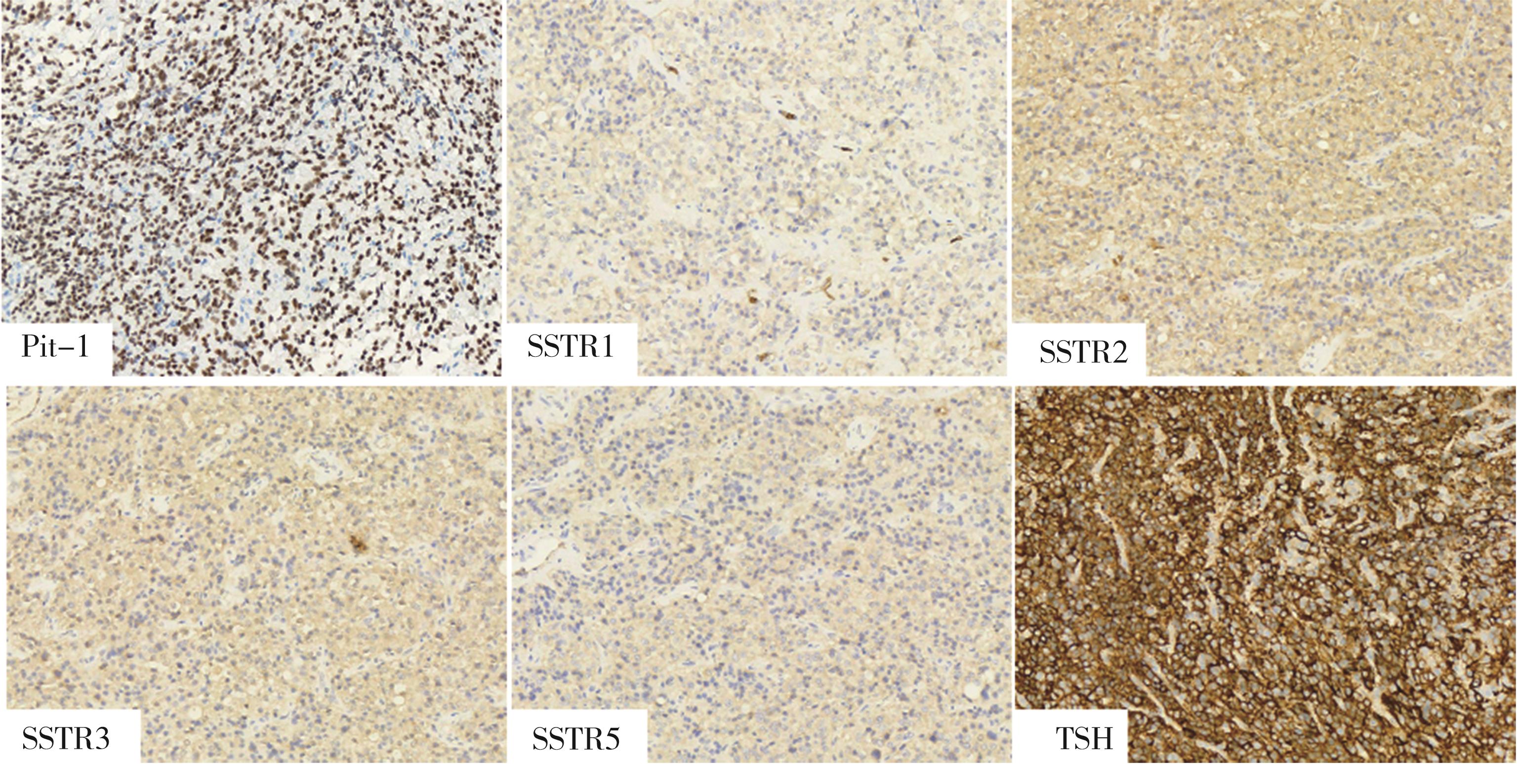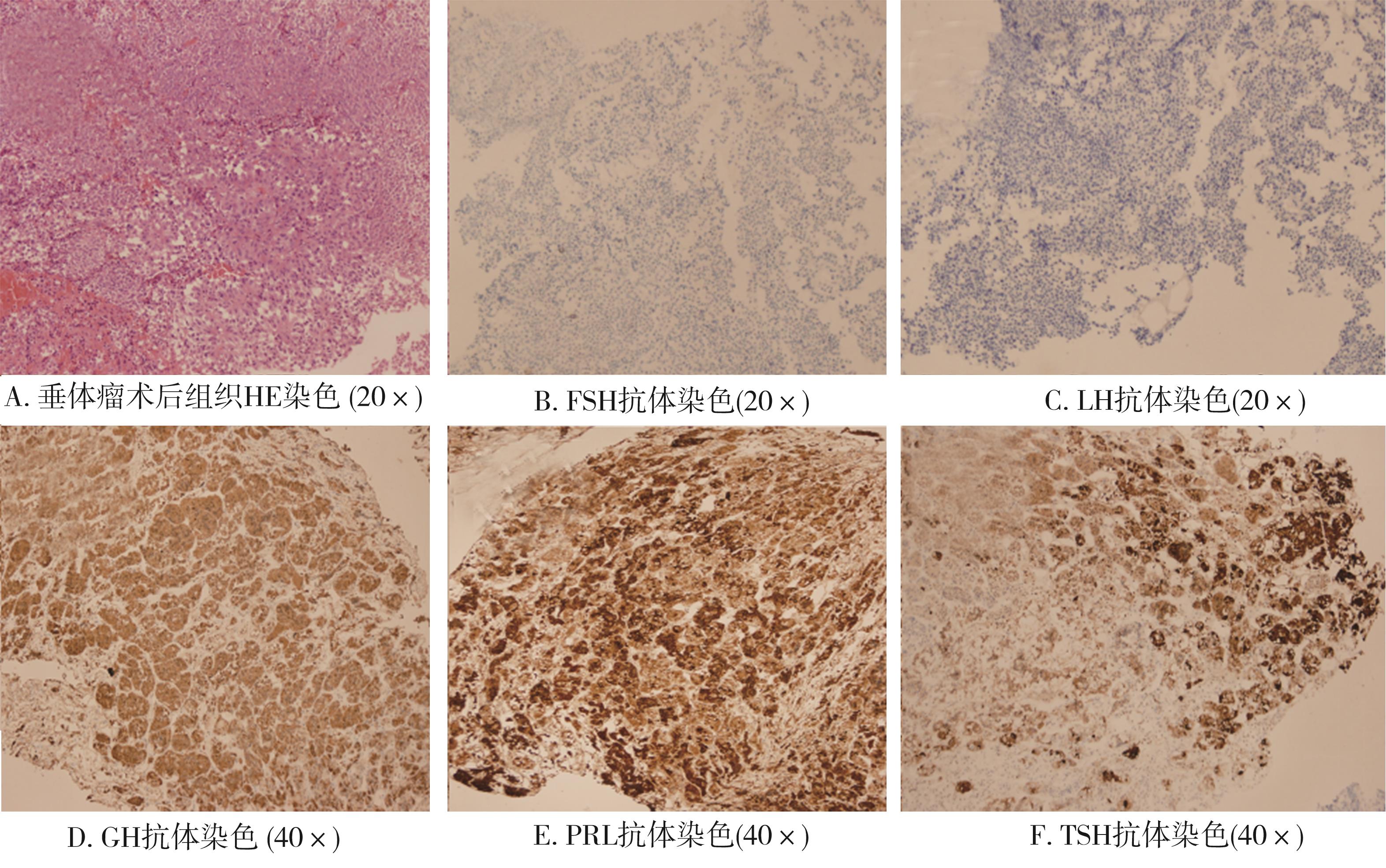 摘要:目的 加强对于同时产生生长激素(growth hormone,GH)和促甲状腺激素(thyroidstimulatinghormone,TSH)的垂体腺瘤的认识,防止误诊、漏诊、延诊,并探讨其治疗。方法 回顾性分析5例在四川大学华西医院确诊为垂体GH+TSH 瘤患者的临床表现、激素生化检查、影像学检查、治疗方式以及预后情况。结果 ①5例GH+TSH瘤占四川大学华西医院同期诊断的垂体瘤的2.9%(4/172);其中2例患者病理提示:TSH+GH+PRL为阳性,另外3例病理提示:TSH+GH为阳性。②鞍区MRI扫描5例均为大腺瘤(直径≥1 cm),无小腺瘤。③术前4例患者(病例2、3、4、5)GH基线水平明显升高(随机值>2.5 ng/mL),其中2例不被高糖抑制,2例患者未行高糖抑制实验;病例1因既往已多次反复治疗,目前GH已完全生化缓解。4例患者(病例1、2、4、5)FT4升高且TSH不被抑制,其中2例患者存在甲状腺毒症;2例患者性腺轴水平下降。5例患者中4例为经鼻内镜鞍区占位切除术,其术后大部分GH、TSH、FT4均明显下降(其中2例恢复到正常范围,另有1例GH水平有下降,但未完全缓解,TSH、FT4水平恢复正常,另1例GH、TSH、FT4均无明显变化)。余病例1既往伽玛刀治疗后给予药物治疗,第3次复发采用手术治疗后GH水平缓解,但TSH、FT4仍未得到缓解;术后性激素结果提示:2例患者性腺功能减退患者性腺功能未立即恢复正常。5例患者术前、术后垂体-肾上腺轴功能均正常。结论 垂体GH+TSH混合瘤临床发病率低,起病隐匿,多因甲状腺毒症而被误诊,易错过最佳治疗时机,手术治疗仍是该病的一线治疗方式。