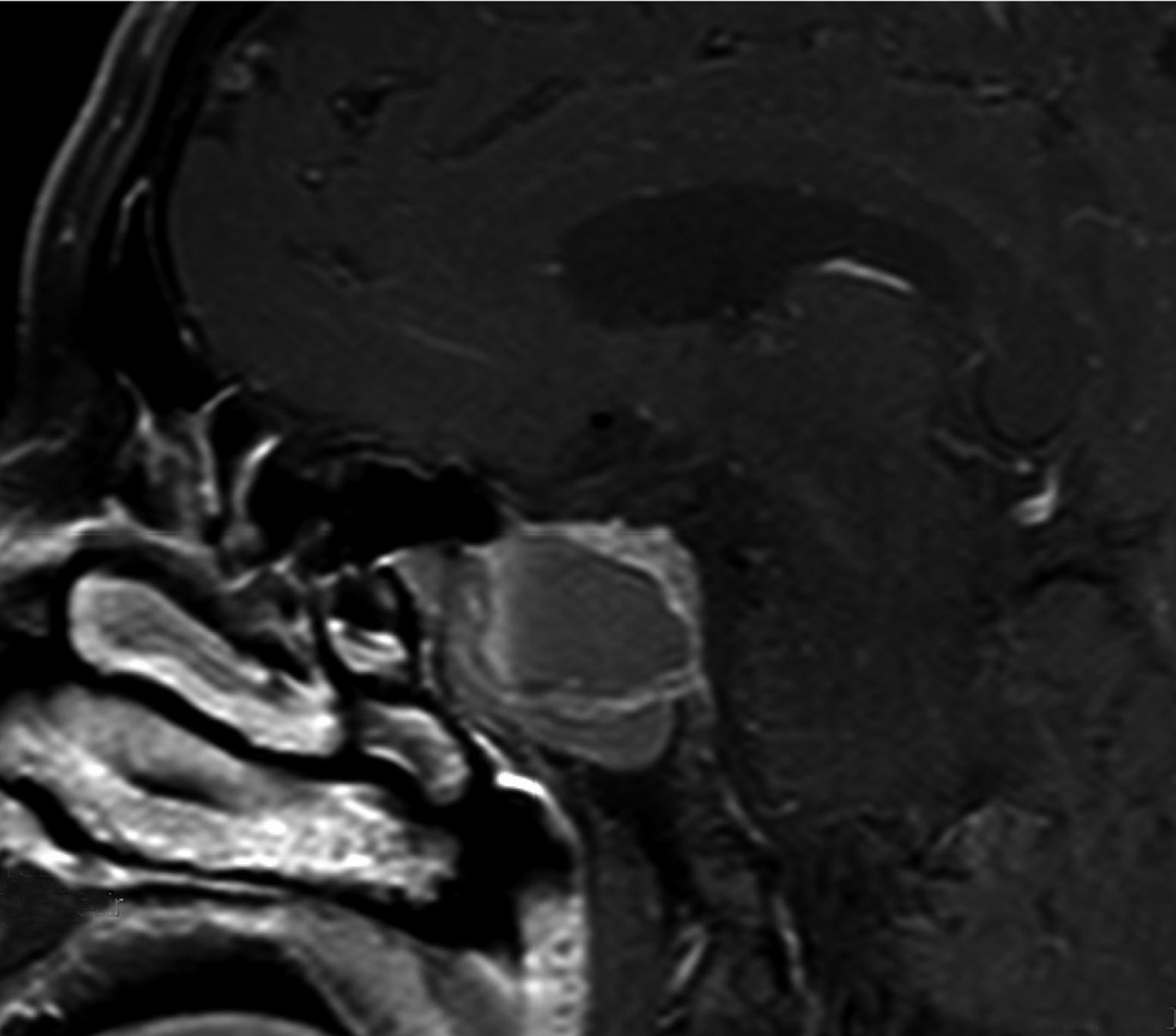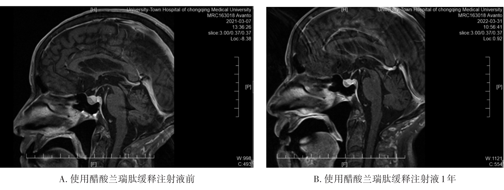 摘要:目的 探讨垂体卒中(pituitary apoplexy,PA)患者的症状、内分泌和影像学特点、临床转归及预后。方法 回顾性分析四川大学华西医院2015年1月1日—2021年12月31日期间诊断为“垂体卒中”患者资料。PA的诊断基于临床、影像学和病理组织学报告。总结其临床症状和体征、神经影像学、病理学和内分泌学结果,并分析临床转归及预后。结果 一共46名PA患者,其中20名男性(43.5%),平均年龄为47.05(15.81)岁,女性26名,平均年龄为31.96(14.78)岁。大多数人出现头痛(n=38,82.6%)和不同程度激素缺乏,其中最常见的垂体-性腺轴受累(28例,60.9%),其次是垂体-甲状腺轴受累(21例,45.7%);垂体-肾上腺轴受累(19例,41.3%);生长激素(growth hormone,GH)/胰岛素样生长因子-1(insulin-like growth factor 1,IGF-1)轴受累5例(10.9%);垂体后叶受累(尿崩症)8例(17.4%)。所有垂体卒中患者都有核磁共振成像(magnetic resonance imaging,MRI)上的特征性改变,部分卒中患者的垂体MRI存在典型的液平。9例(19.6%)接受抗血栓治疗,12例接受手术治疗的患者随访中的7例存在垂体腺瘤复发,但无患者在急性病程中死亡。在随访期间(5.2±1.9)年,大部分患者存在垂体-靶腺激素低下,均予以激素替代治疗。结论 PA属于神经内分泌危急重症,症状早期认识和及时治疗,尤其是内分泌紊乱的纠正对于避免严重并发症至关重要。临床医师需要重视PA的垂体前叶功能减退,以避免潜在的风险。