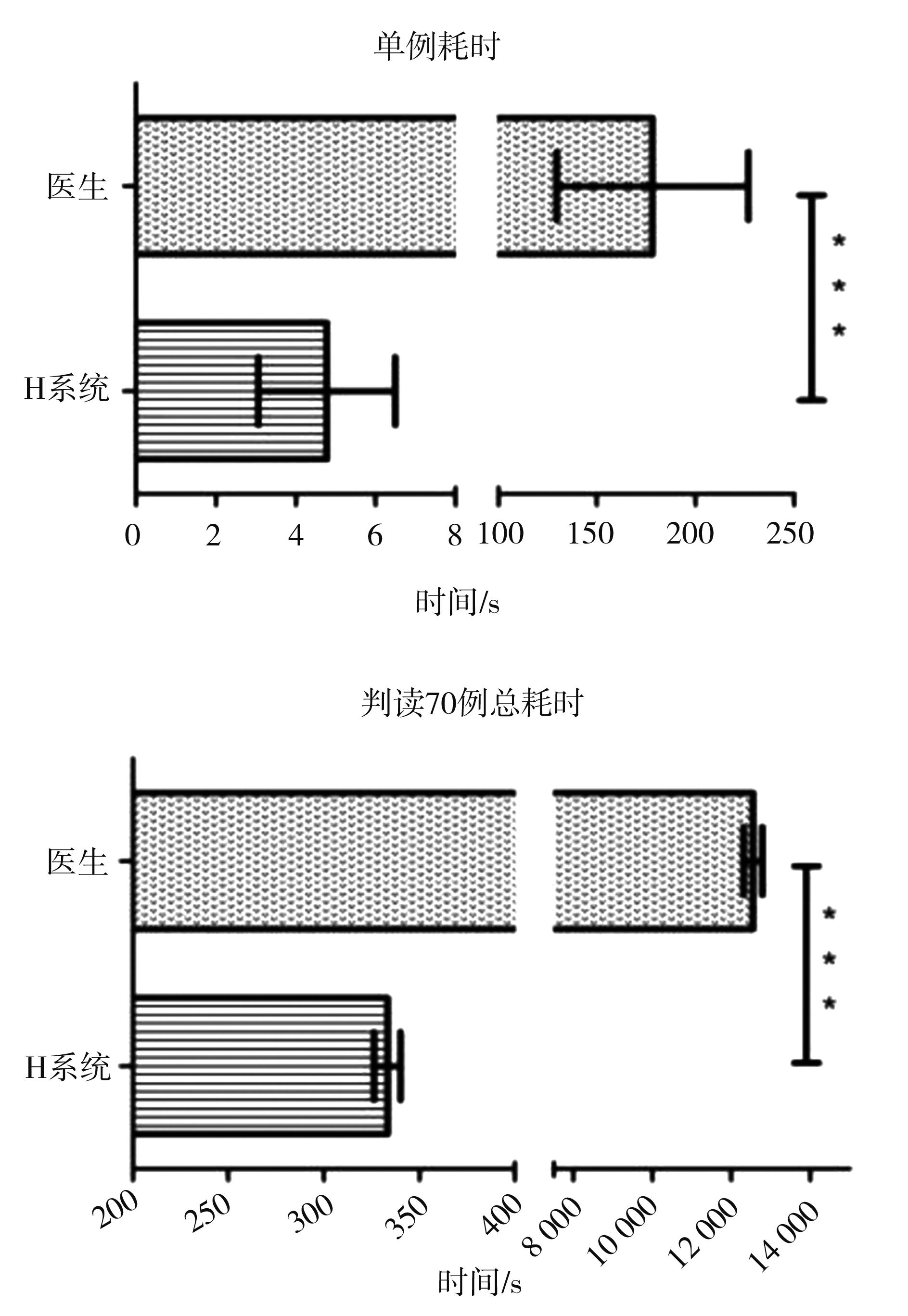 摘要:目的 构建基于人工智能的高血压性脑出血医疗文本信息自动识别系统,快速识别和分析患者临床信息,高效地输出正确的诊疗方案。方法 基于国内外最新高血压性脑出血诊疗指南,经多位高年资神经外科医生和专业人工智能团队共同讨论,构建基于语言表征模型和专家模块的高血压性脑出血医疗文本信息自动识别及决策系统(即H系统)。随后将收集到的高血压性脑出血病例分为训练集、测试集和验证集,以数据库中病例的真实治疗方案为金标准,先总体评价H系统的准确性,再将其与神经外科医生进行对比,分析H系统的判读效率。结果 在测试集中,H系统所输出的治疗方案的准确率为94.0%(91.5%~96.5%),特异度为91.8%(86.3%~97.3%),灵敏度为95.5%(89.3%~98.2%),曲线下面积(area under the curve,AUC)值为0.936(0.922~0.950)(P=0.000);在验证集中,H系统所输出的治疗方案的准确率为93.3%(89.5%~97.1%),特异度为 89.9%(83.4%~96.4%),灵敏度为95.8%(92.3%~99.3%),AUC值为0.928(0.891~0.966)(P=0.000)。在处理同样的70例病例时,H系统用时(334.60±4.46)s,而神经外科医生用时(12 550.28±95.45)s;在50 min内,H系统处理的病例数为(383±3)例,而神经外科医生处理的病例数为(11±4)例。结论 本研究所构建的H系统能够对高血压性脑出血患者的急诊病例进行自动识别和分析,并快速输出准确的诊疗方案,可协助医生对高血压脑出血进行急诊诊疗。