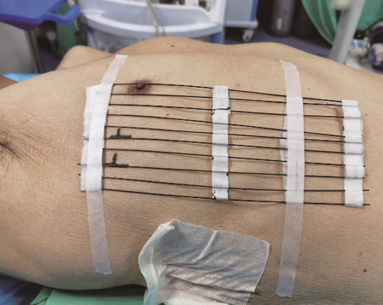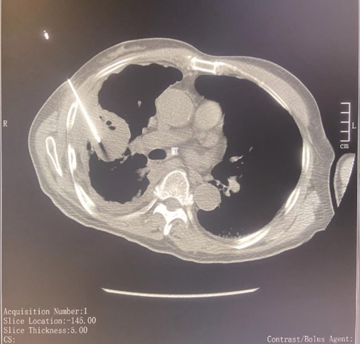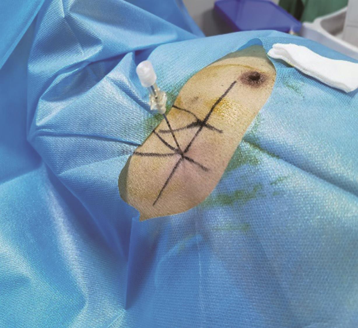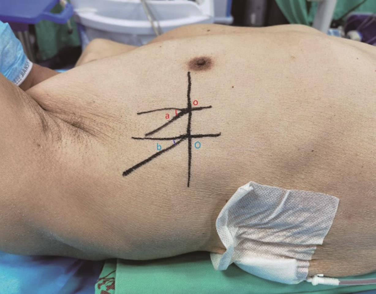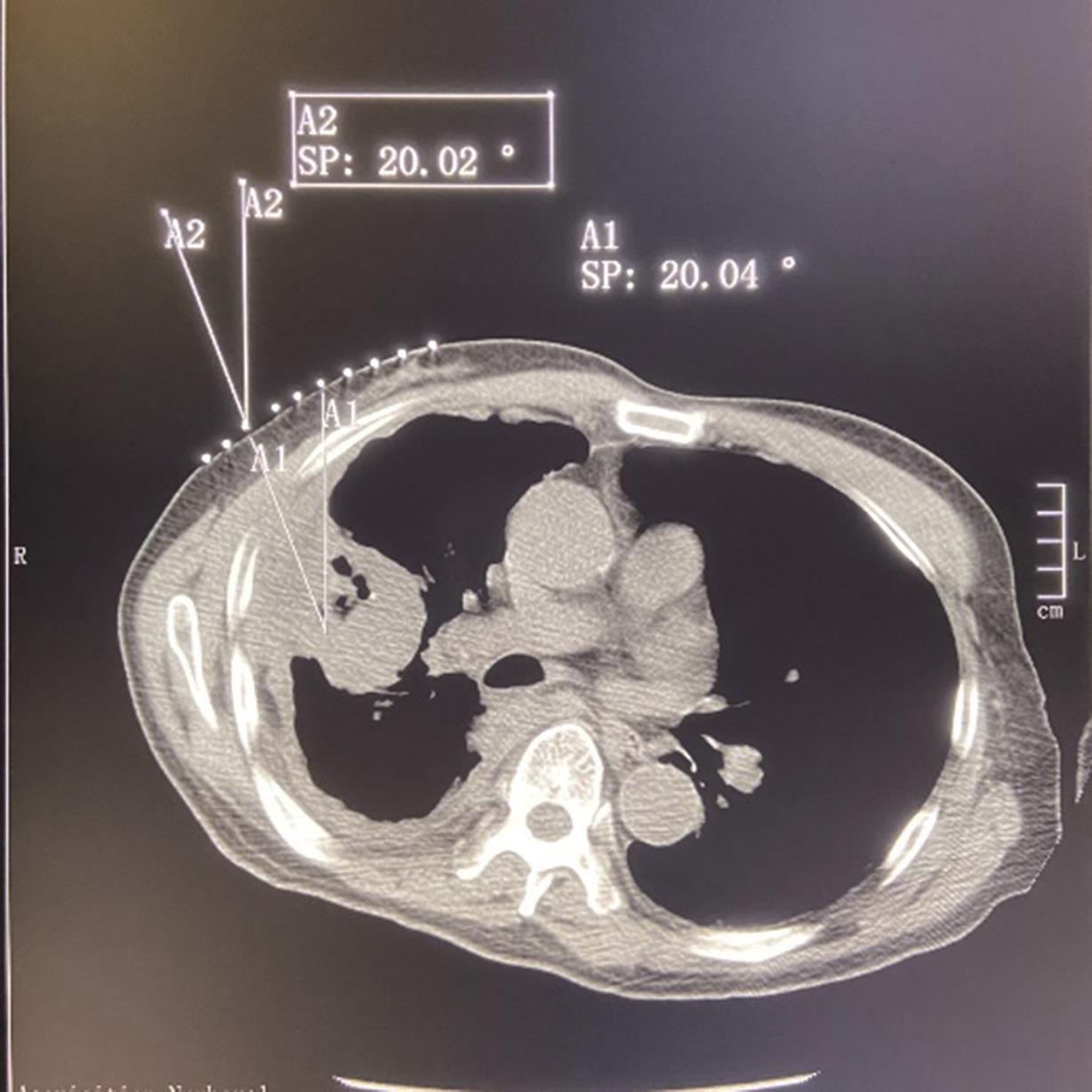 摘要:目的 旨在探讨靶点靶线体表描记法在CT引导经皮肺穿刺活检术中的技术要点及应用价值。方法 选取2021年8月至2022年4月进行肺穿刺活检的病例152例,随机分为A组(77例,采用靶点靶线体表描记法穿刺)和B组(75例,常规穿刺法),比较2组首次进针成功率、CT扫描次数、诊断准确率、术后并发症及手术时间以评估2种手术方法效果。结果 2组均穿刺成功并取得标本,穿刺成功率均为100%。首次进针成功:A组64例,B组62例,2组间无统计学差异(χ2=0.005,P=0.941);CT扫描次数超标:A组18例,B组54例,2组间有统计学差异(χ2=36.030,P<0.05);诊断准确:A组70例,B组68例,2组间无统计学差异(χ2=0.003,P=0.959);咯血:A组12例,B组9例,2组间无统计学差异(χ2=0.410,P=0.522);气胸:A组10例,B组11例,2组间无统计学差异(χ2=0.090,P=0.764);手术时间:A组平均(19.88±4.47) min,B组平均(32.23±4.95) min,2组间有统计学差异(t检验,P<0.05)。结论 CT引导肺穿刺术中应用靶点靶线体表描记法简单易行,能准确指导CT引导肺穿刺术中穿刺角度的把握,减少术中CT扫描次数,值得在临床中推广。