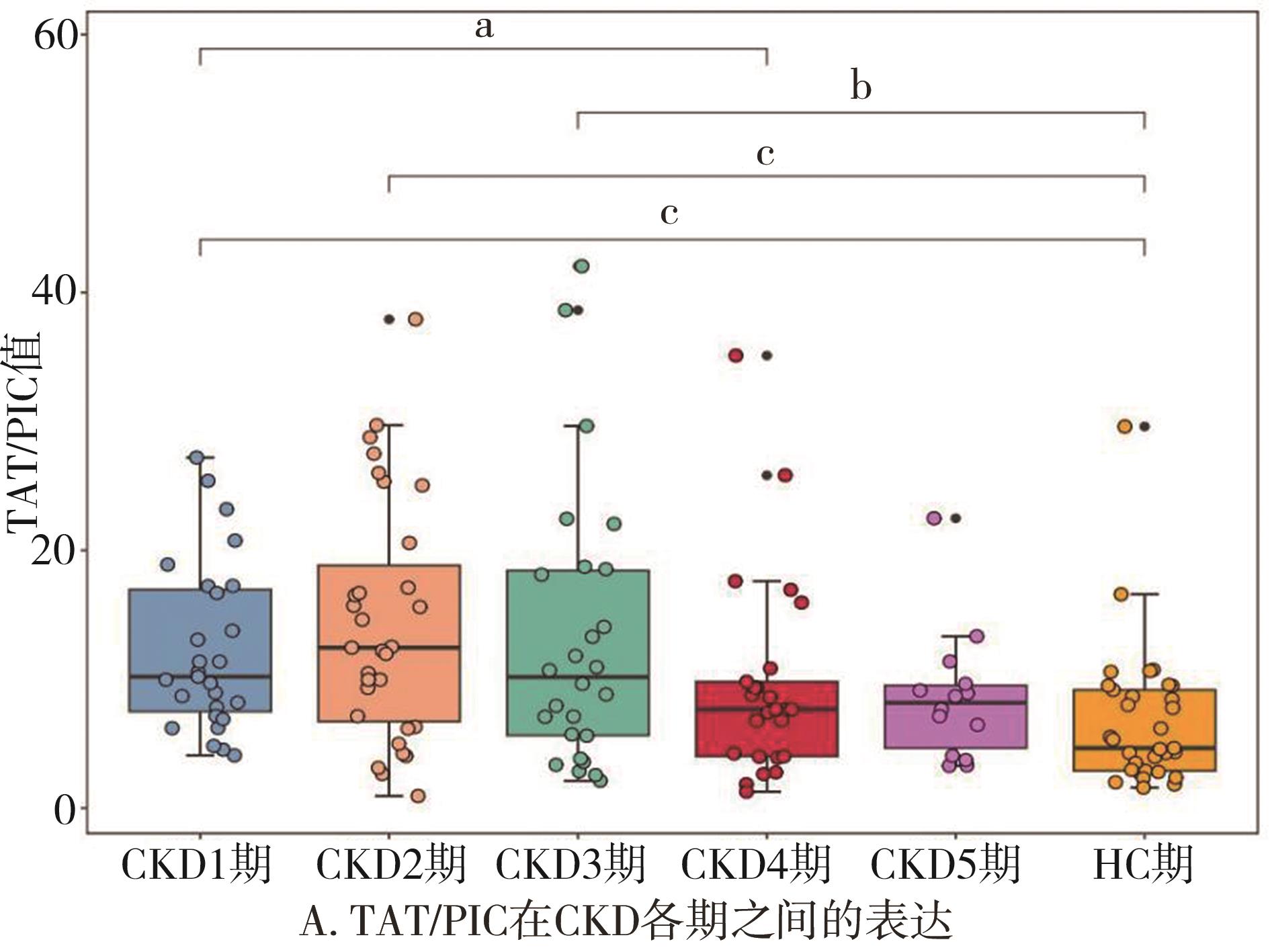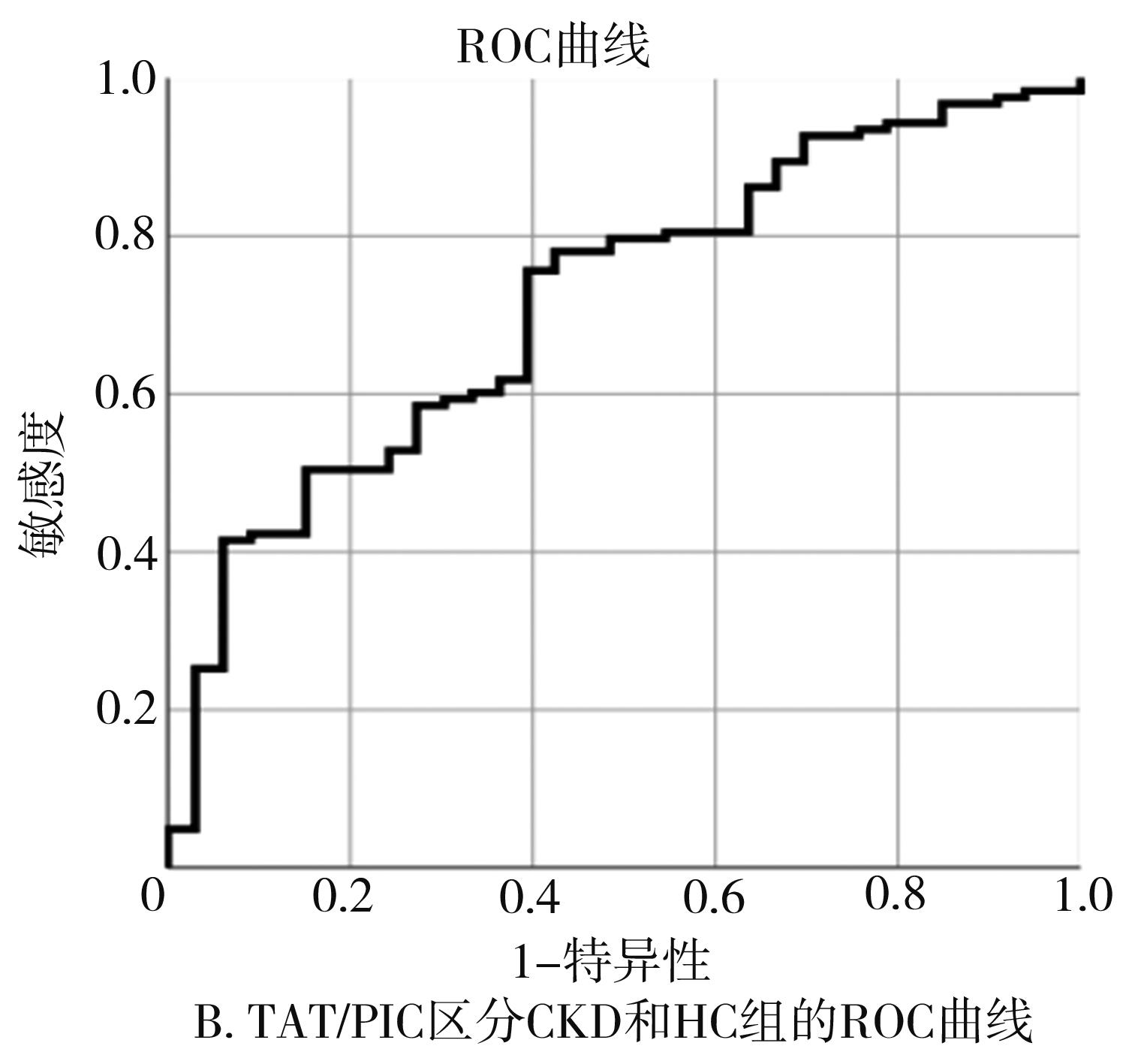 摘要:目的 分析慢性肾病(chronic kidney disease,CKD)患者血浆凝血、纤溶标志物的表达变化趋势,为CKD相关凝血性疾病的诊断和治疗提供依据。方法 从2021年5月到2022年5月就诊于陕西省中医医院的CKD患者和体检人员中根据纳入标准获得CKD患者123名,依据肾小球滤过率(estimated glomerular filtration rate,eGFR)分组,健康体检者40名设为对照组(health control,HC组),分别检测凝血酶调节蛋白(thrombomodulin,TM)、凝血酶-抗凝血酶复合物(thrombin-antithrombin complex,TAT)、纤溶酶-α2抗纤溶酶复合物(plasmin-α2-antiplasmin complex,PIC)、组织型纤溶酶原激活物抑制剂-1复合物(tissue plasminogen activator inhibitor complex,t-PAIC)、凝血酶原时间(prothrombin time,PT)、活化部分凝血酶原时间(activated partial thromboplastin time,APTT)、凝血酶时间(thrombin time,TT)、纤维蛋白原(fibrinogen,FIB)、纤维蛋白降解产物[fibrin(-ogen) degradation products,FDP]、D-二聚体(D-dimer,DD)水平以及白蛋白、血肌酐(serum creatinine,SCr a)及尿素氮(blood urea nitrogen,BUN)的表达水平。结果 PT、APTT和TT在各组间的差异无统计学意义(P>0.05),CKD组中FIB、DD和TAT高于HC组(P<0.001);DD在CKD5期高于CKD1、2期(P<0.05);FDP在CKD2-5期均高于HC组(P<0.05)且CKD5期高于CKD1、2期;PIC在CKD 3-5期高于HC组,CKD4期高于CKD1、2期(P<0.001);tPAIC在CKD1-4期高于HC组(P<0.05);TM在CKD2-5期高于HC组,CKD4-5期高于其他分期(P<0.001);CKD各组TAT/PIC比值高于HC组,CKD1-3组与HC组的差异有统计学意义(P<0.001),TAT/PIC对CKD和HC的鉴别进行受试者工作曲线(receiver operating characteristic curve,ROC)分析,曲线下面积(area under curve,AUC)为0.716。结论 CKD患者体内普遍存在高凝状态,新凝血标志物反映凝血功能变化的能力更优秀。