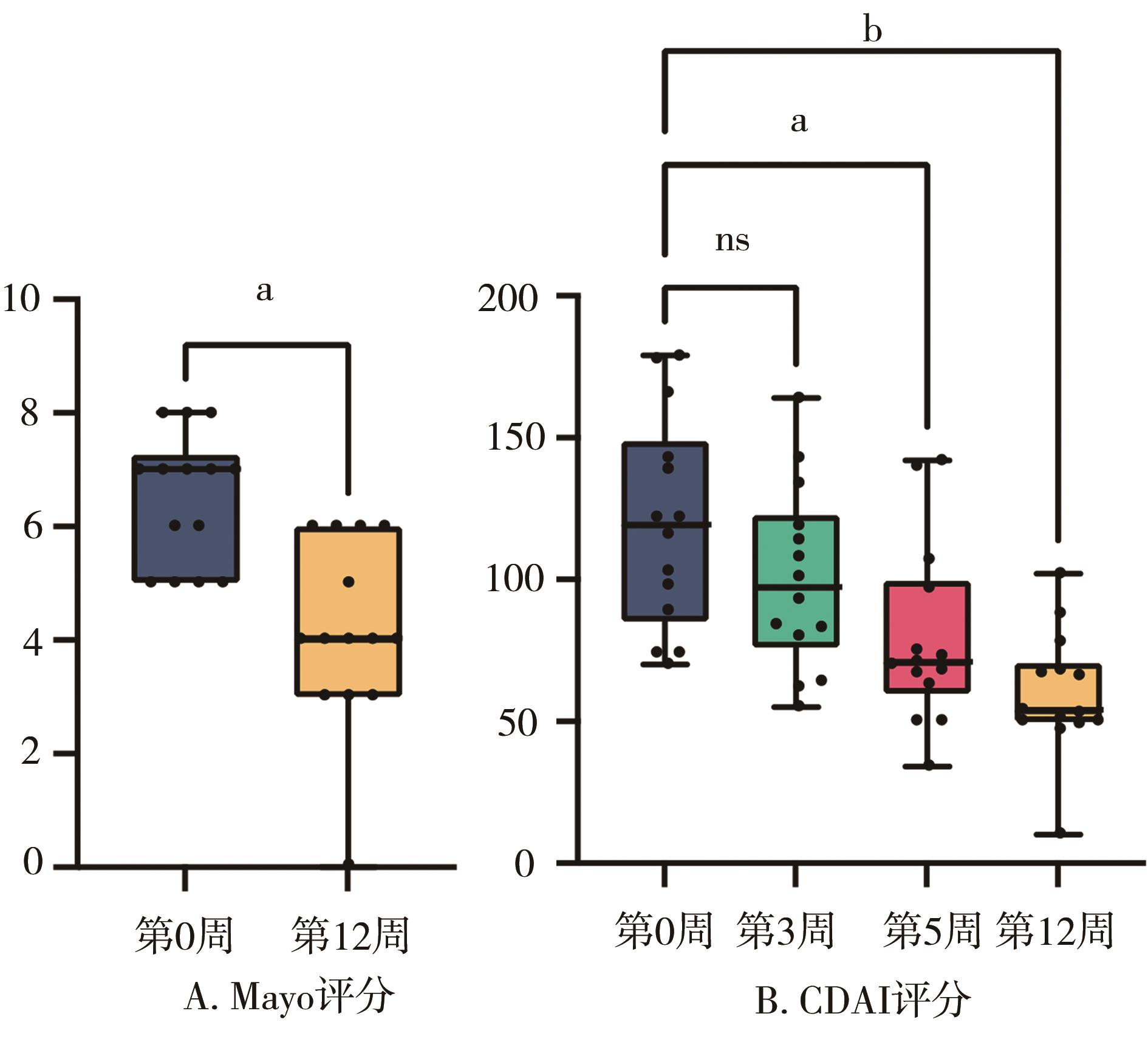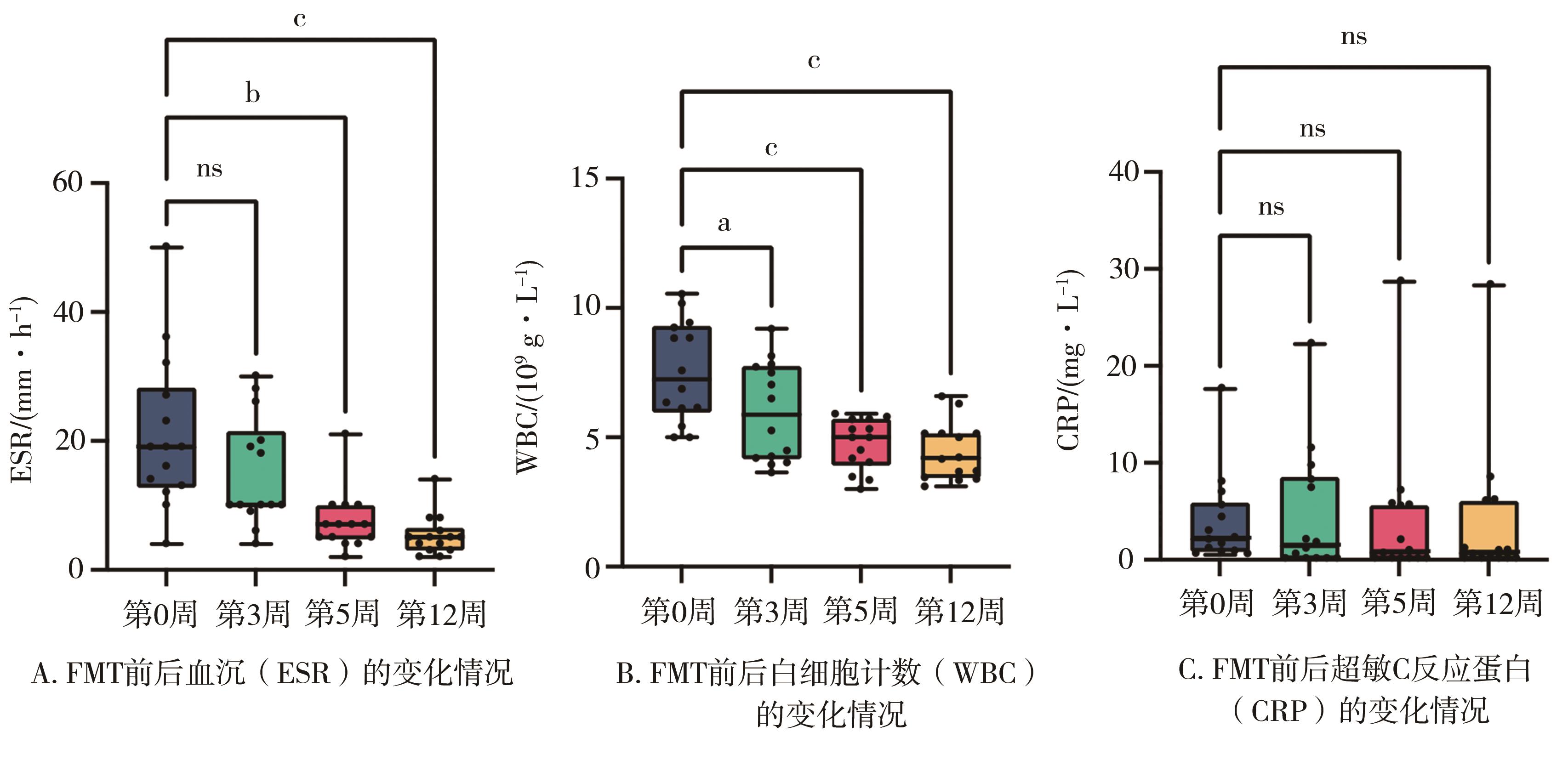 摘要:目的 观察肠菌移植治疗炎症性肠病的安全性和有效性,评价对治疗后炎症指标、疾病评分及肠道菌群组成的影响。方法 选取2018年12月至2021年12月于医院肛肠科行肠菌移植治疗炎症性肠病的14例患者,比较治疗前后患者炎症指标、疾病评分及治疗效果,16s rDNA检测肠道菌群变化。结果 经肠菌移植后,第15周临床有效率为85.71%(13/15);患者炎症指标、Mayo及疾病评分、肠道菌群多样性及相对丰度较前改善,差异具有统计学意义(P<0.05)。结论 肠菌移植治疗炎症性肠病疗效显著,不良反应少,安全性高,值得临床推广应用。