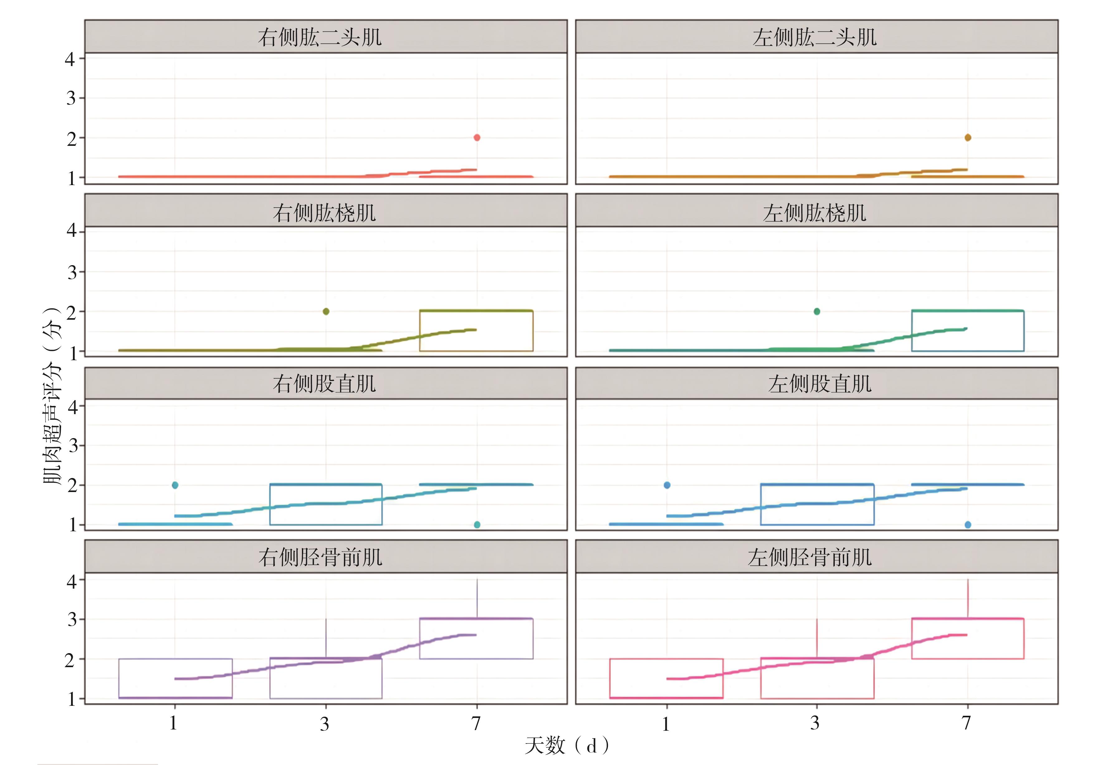 摘要:目的 探讨重症监护病房(intensive care unit,ICU)获得性肌无力(ICU acquired weakness,ICUAW)患者肌肉超声回声与血浆炎性因子的相关性,以及其对ICUAW的诊断价值和预后的预测价值。方法 选择重庆市急救医疗中心ICU住院患者,分别在第1、3、7天使用床旁超声检测患者肌肉回声,获得的总体肌肉回声评分(global muscle echogenicity score,GEM),测定血清白细胞介素-6(interleukin-6,IL-6)和降钙素原(procalcitonin,PCT)浓度,采用医学研究理事会肌力评分法(medical research council scales,MRC-ss)评估肌肉力量。根据患者入ICU第7天MRC-ss评分将患者分为ICUAW组和非ICUAW组,分析比较2组患者GEM、IL-6、PCT的差异及各指标的相关性。利用受试者工作特征(receiver operator characteristic,ROC)曲线分析以上参数对ICUAW诊断效能,分析GEM、IL-6、PCT对ICUAW患者的预测预后价值。结果 ICUAW组第3天GEM、第7天IL-6浓度、GEM高于非ICUAW组(P<0.05)。GEM与第7天IL-6水平呈正相关(r=0.221),第7天GEM与MRC-ss评分呈负相关(r=-0.581)。ROC曲线分析显示,第7天GEM对ICUAW有诊断预测价值,ROC曲线下面积(area under the curve,AUC)为0.838,使用GEM、IL-6、PCT联合诊断,AUC=0.885(P<0.05)。ICUAW组Barthel指数评分(Barthel index,BI)低于非ICUAW组,ICUAW组中总体肌肉超声回声评分(global muscle echogenicity score,GEM)高的患者BI低于GEM低的患者(P<0.05)。结论 ICU住院患者GEM与IL-6、PCT浓度相关,其对ICUAW具有一定的诊断价值,并能够预测ICUAW患者的预后。