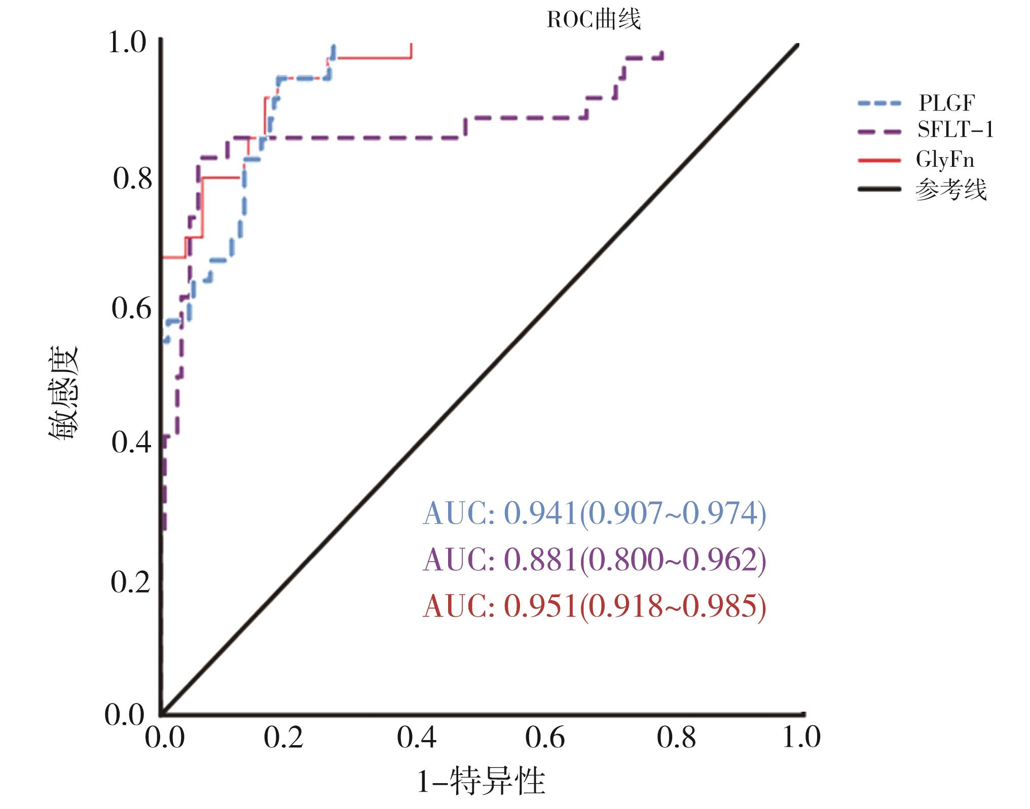 摘要:目的 探讨胎盘生长因子(placental growth factor,PLGF)、可溶性fms样酪氨酸激酶-1(soluble fms-like tyrosine kinase-1,SFLT-1)和糖基化纤连蛋白(glycosylated fibronectin,GLYFN)检测对子痫前期的预测价值。方法 选择在无锡市妇幼保健院就诊的188例孕妇,分154例正常孕妇(对照组)和34例子痫前期患者(子痫组),应用免疫荧光法分别检测其在孕16~18周血清中PLGF、SFLT-1和GLYFN的浓度,比较子痫前期组和对照组各标志物的水平,并使用受试者操作特征曲线(receiver operating characteristic,ROC)对3种标志物的预测价值进行效能评估。结果 在妊娠中期,子痫前期组血清PLGF浓度低于对照组,SFLT-1及GLYFN浓度均高于对照组,3种标志物的差异均有统计学意义(3指标P=0.000)。95%置信区间的ROC曲线下面积(areas under the ROC curve,AUC)为,PLGF为0.941(0.907~0.974),SFLT-1为0.881(0.800~0.962),GLYFN为0.951(0.918~0.985),联合指标SFLT-1和GLYFN、3项指标联合检测在ROC曲线下面积(areas under the ROC curve,AUC)分别为0.968、0.986。结论 PLGF、SFLT-1、GLYFN 3种标志物水平在对照组和子痫前期组均存在明显差异,对子痫前期的发病具有一定的预测价值,SFLT-1联合PLGF、SFLT-1联合GLYFN、3项指标联合检测对子痫前期的预测价值高于任一单项指标。