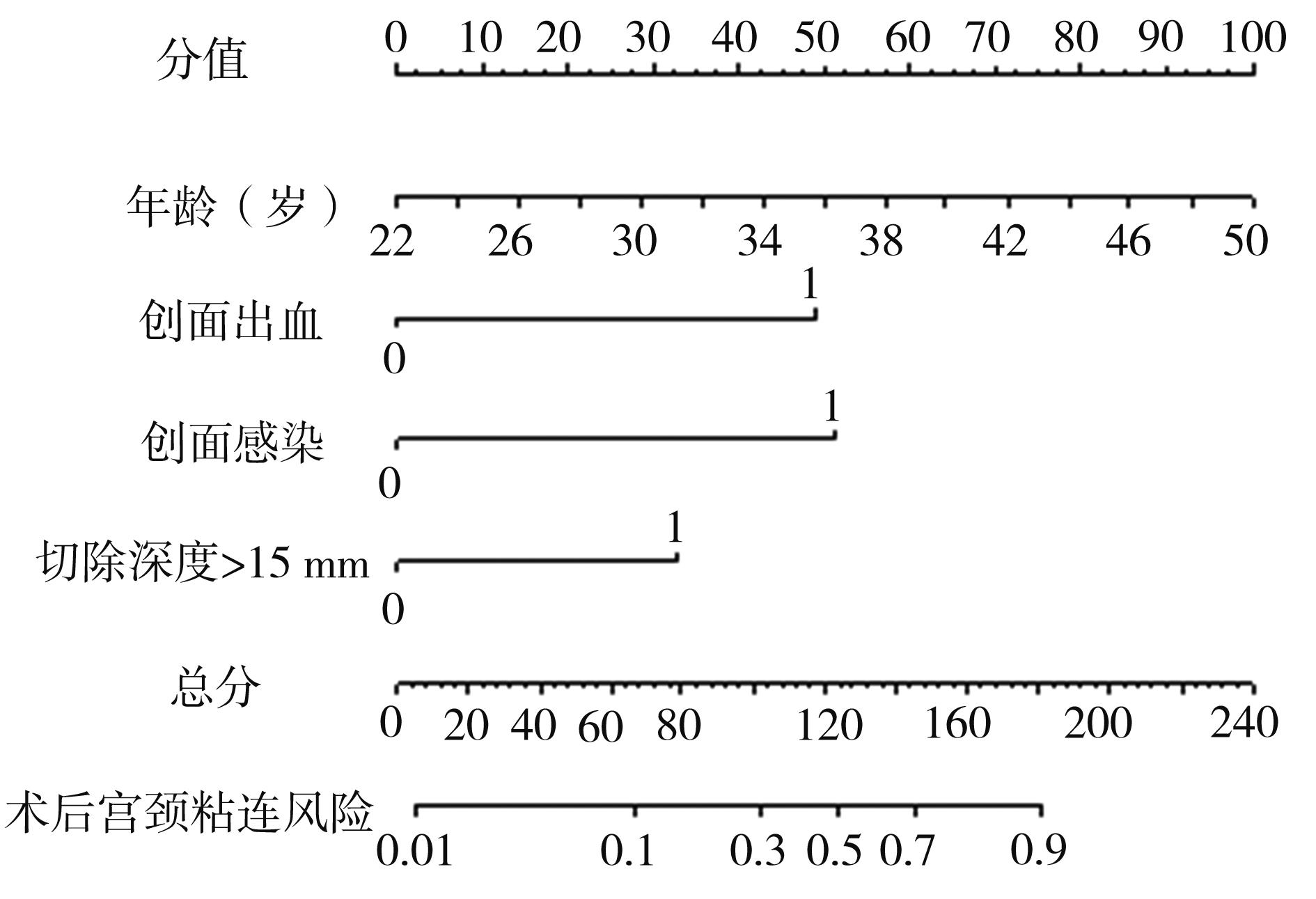 摘要:目的 分析子宫颈环形电切术(loop electrosurgical excision procedure,LEEP)术后发生宫颈管粘连的危险因素,建立并验证风险预测模型。方法 本研究前瞻性选取2021年9月至2022年4月遵义市第一人民医院子宫颈鳞状上皮内病变(cervical squamous intraepithelial lesion,SIL)且行LEEP治疗的200例患者作为研究对象。根据LEEP术后有无发生宫颈管粘连分为粘连组(n=45)和未粘连组(n=155),采用单因素和多因素logistic回归分析LEEP术后发生宫颈管粘连的影响因素,基于筛选得到的危险因素建立列线图模型,并对模型的精准度进行验证。结果 年龄(OR=1.152,95%CI=1.063~1.249)、创面出血(OR=6.602,95%CI=2.652~16.436)、创口感染(OR=6.288,95%CI=2.357~16.772)、切除深度(OR=3.383,95%CI=1.367~8.373)是宫颈管粘连发生的独立危险因素。验证结果:一致性指数(concordance index,CI)为0.904;Hosmer-Lemeshow提示该列线图模型预测LEEP术后发生宫颈管粘连的风险预测值与实际观测值比较,差异未显示统计学意义(χ2=1.810,P=0.840);列线图模型预测LEEP术后发生宫颈管粘连的校正曲线趋近于理想曲线,验证前后的平均绝对误差为0.033;列线图模型预测LEEP术后发生宫颈管粘连的校正曲线和受试者工作特征(receiver operating characteristic curve,ROC)曲线下的面积(area under the curve,AUC)为0.904(95%CI=0.858~0.950),灵敏度为0.933,特异度为0.768。结论 本研究构建的SIL行LEEP术后患者宫颈管粘连发生风险预测模型效果良好,可以有效预测宫颈管粘连的发生,可为早期对患者采取预防性干预措施提供参考。