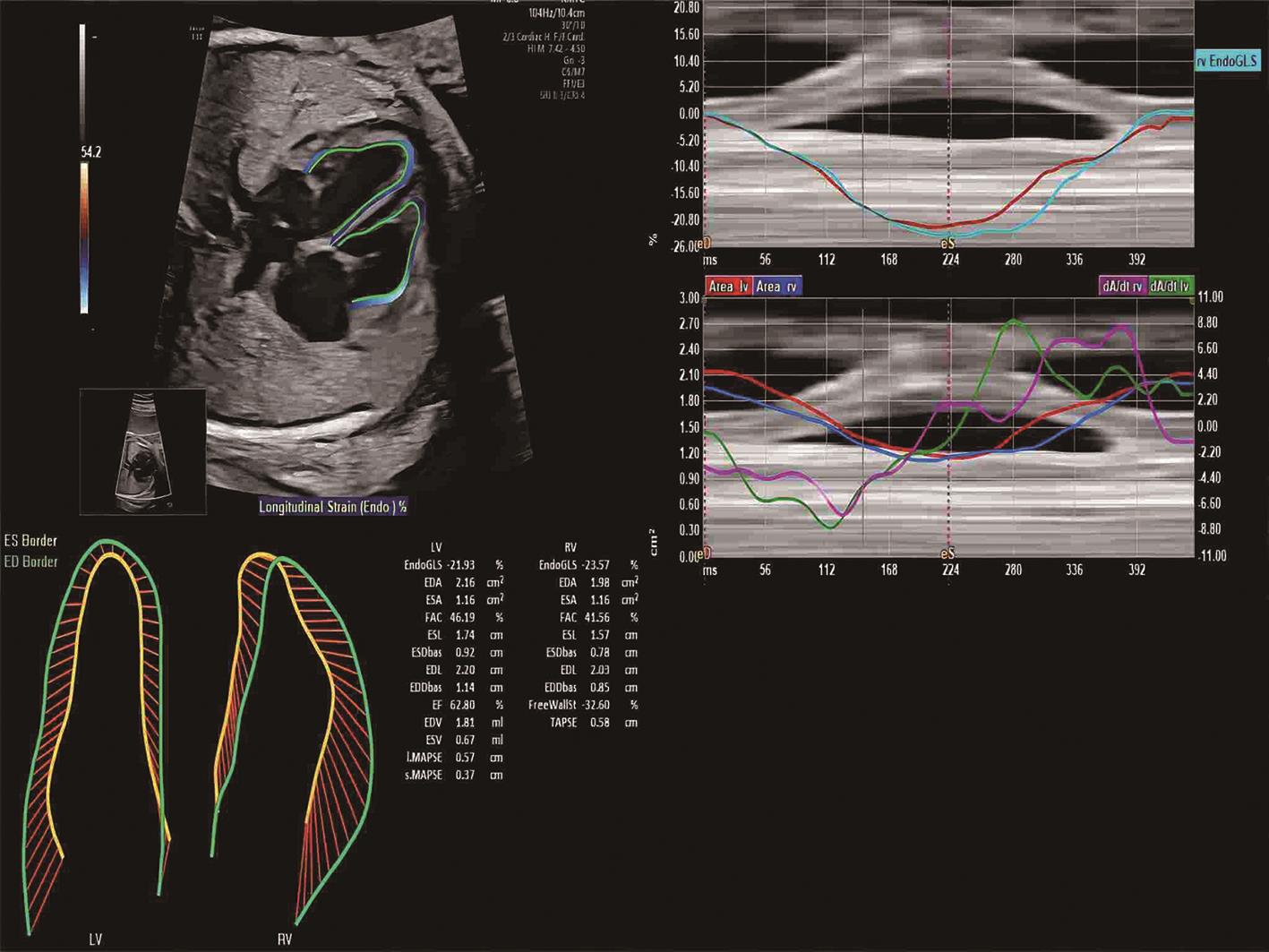 摘要:目的 探讨妊娠期肝内胆汁淤积症(intrahepatic cholestasis of pregnancy,ICP)对胎儿心室收缩功能的影响,为临床早期发现ICP胎儿心功能异常提供依据。方法 选取2022年7月至2023年4月于川北医学院附属医院就诊孕妇67例,孕周27~40周,其中ICP孕妇29例(ICP组),正常孕妇38例(对照组)。应用胎儿心脏定量分析(fetal heart quantification,Fetal HQ)软件测量胎儿心室收缩功能,包括纵向收缩功能:左、右心室整体纵向应变(global strain,GLS)、间隔壁应变(sept wall strain,SWS)、侧壁应变(free wall strain,FWS);横向收缩功能:左、右心室24节段短轴缩短率(fractional shortening,FS);整体收缩功能:左、右心室面积变化分数(fetal area change,FAC)、左心室射血分数(ejection fraction,EF)。结果 ICP组纵向收缩功能指标左、右心室GLS、SWS、FWS均低于对照组,差异有统计学意义(P<0.05);两组间横向收缩功能指标左、右心室24节段FS比较,差异均无统计学意义(P>0.05);ICP组整体收缩功能指标左、右心室FAC均低于对照组,差异有统计学意义(P<0.05),而两组间左心室EF比较,差异无统计学意义(P>0.05)。结论 在宫内高胆汁酸环境下,ICP胎儿心脏左、右心室整体及纵向收缩功能明显受损,横向收缩功能未见明显改变;并且与传统心脏功能评价指标左心室EF相比,FAC可以更加敏感地反映胎儿心脏整体功能的改变。