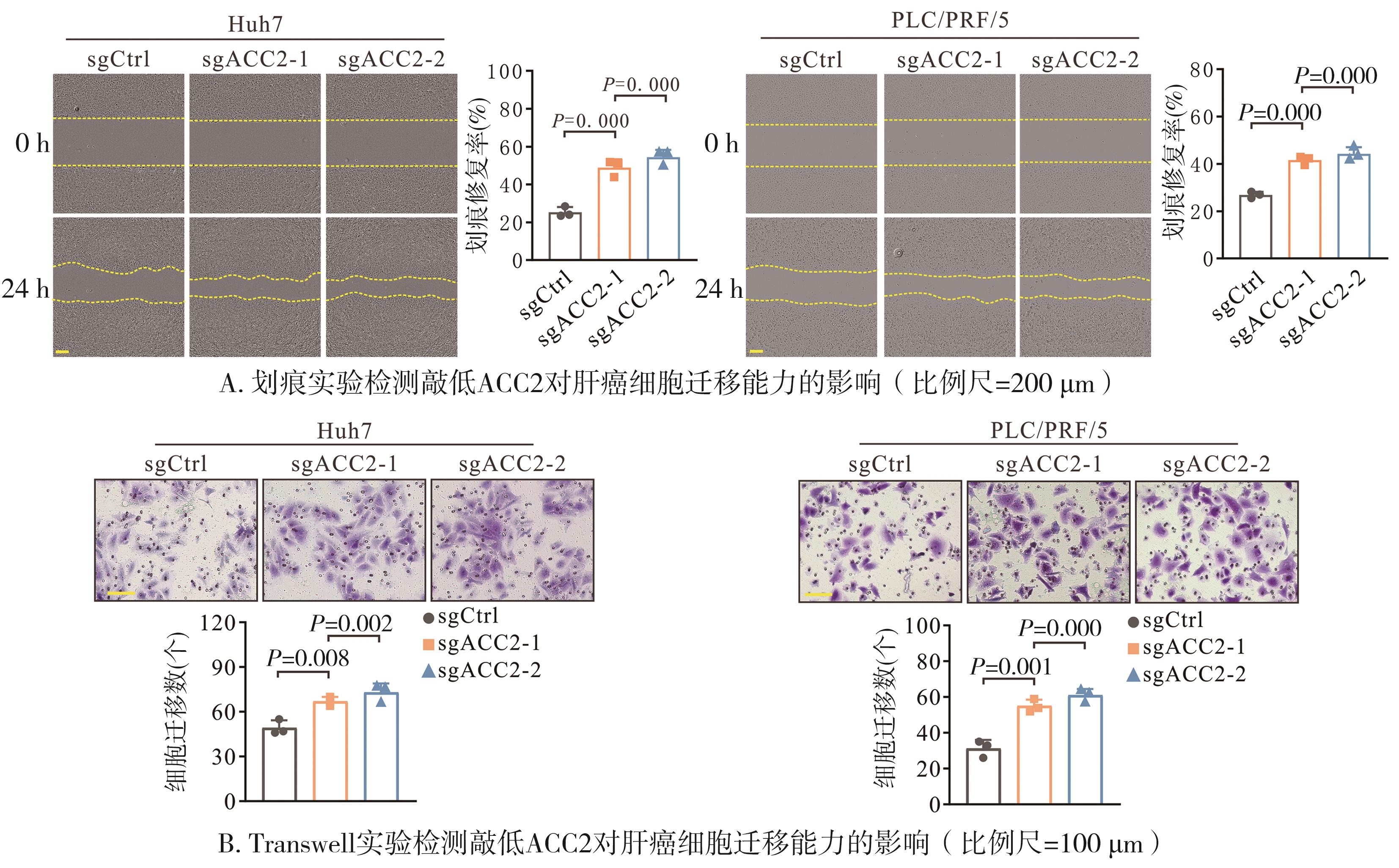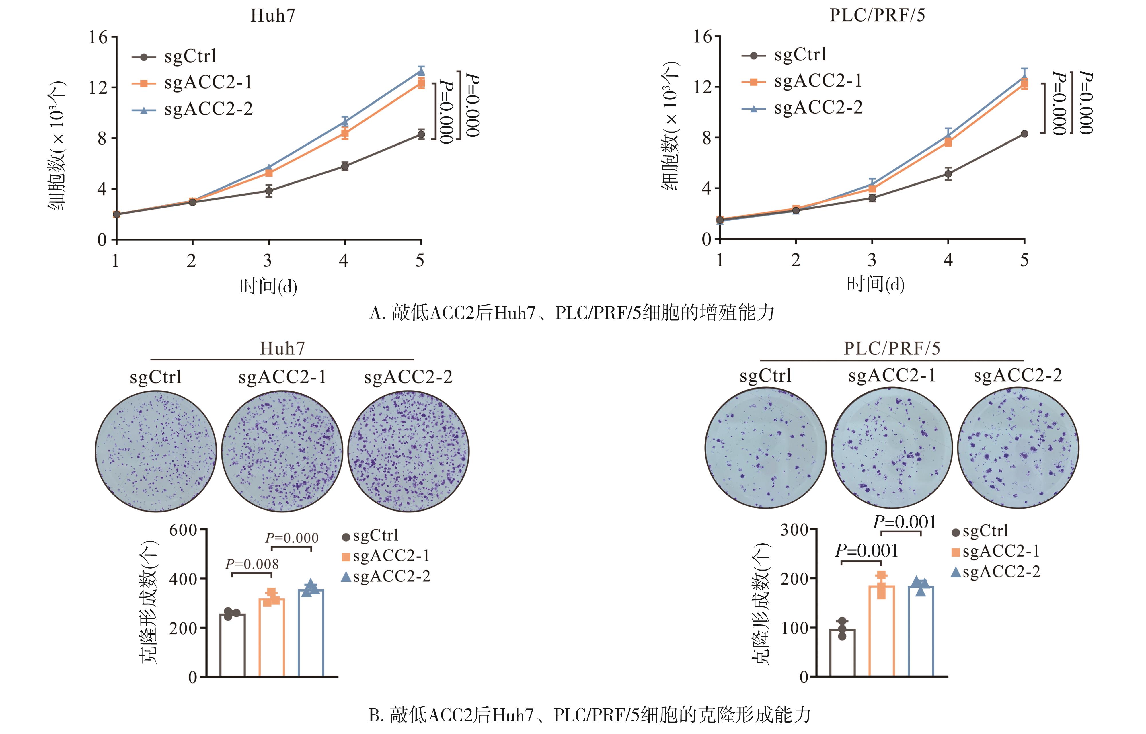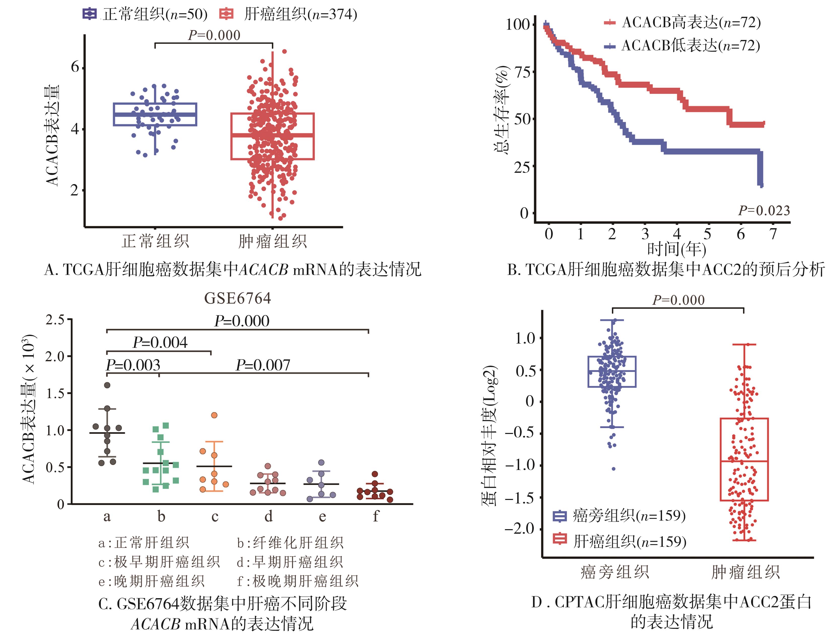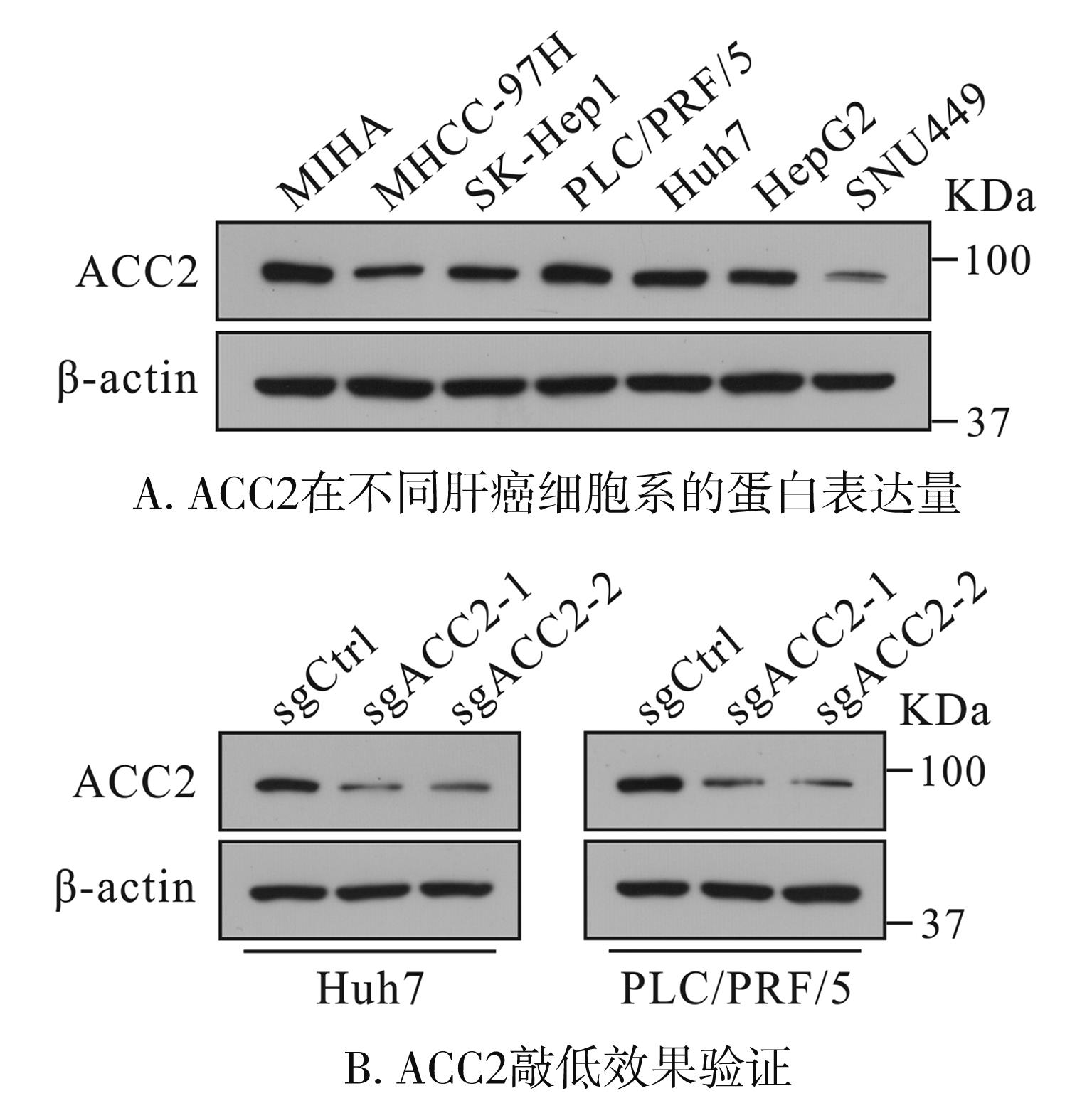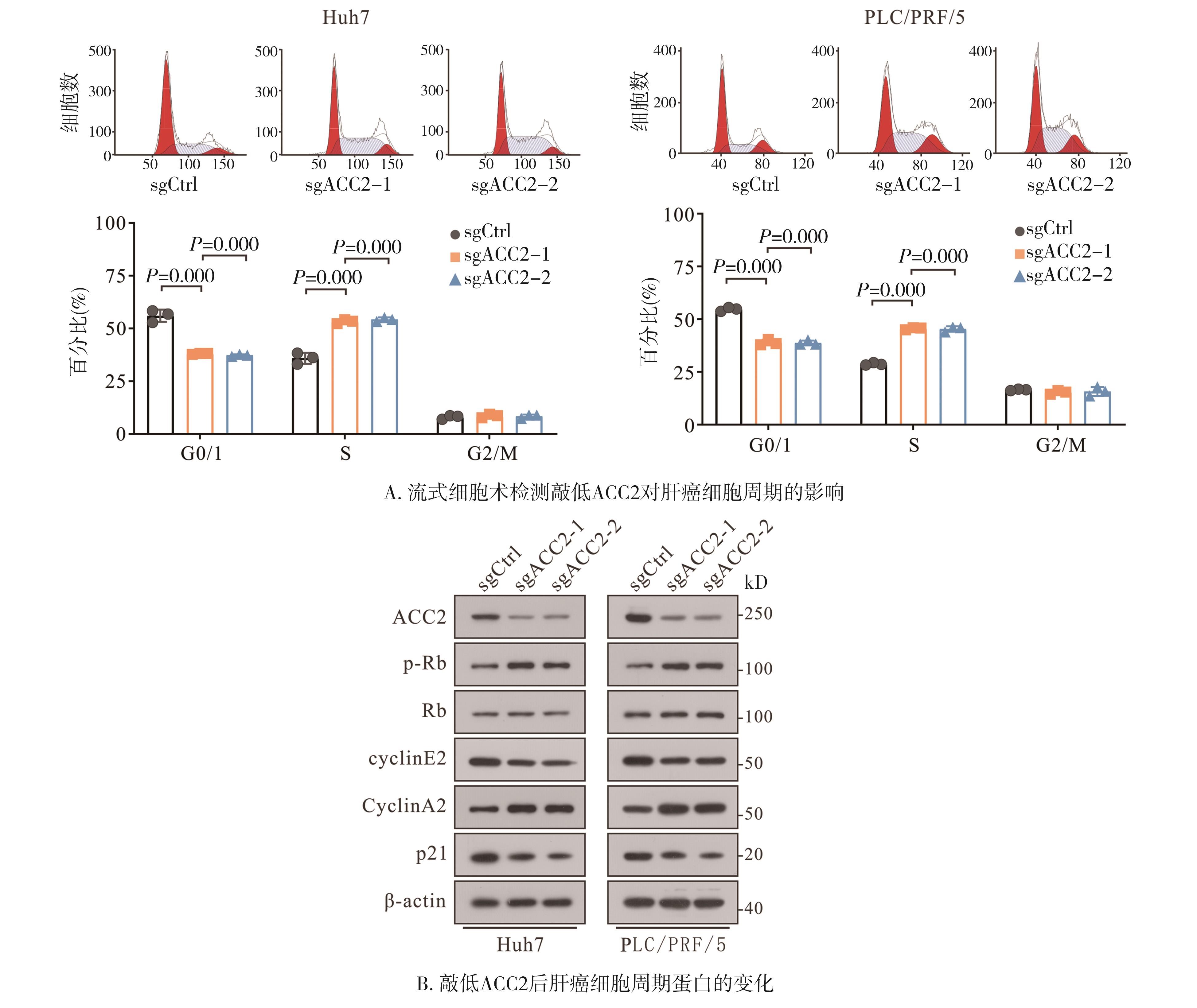 摘要:目的 研究乙酰辅酶A羧化酶2(acetyl-co carboxylase 2,ACC2)对肝癌细胞增殖、迁移能力的影响以及其潜在的作用机制。方法 通过TCGA、GEO、CPTAC数据库对ACC2在肝癌(hepatocellular carcinoma,HCC)患者肝脏组织中的表达和预后价值进行分析。采用CRISPR-Cas9系统构建了ACC2敲低肝癌细胞系,观察肝癌细胞增殖、迁移能力以及细胞周期的变化,Western blot实验检测细胞周期相关蛋白的表达。结果 ACC2在肝癌组织中低表达(P<0.05)且与预后不良相关(P<0.05)。体外细胞功能学实验表明降低ACC2表达显著促进肝癌细胞增殖、迁移能力(P<0.05)。细胞周期流式分析显示敲低ACC2促进肝癌细胞周期G1/S期的转变(P<0.05),细胞周期相关蛋白中CyclinE2和p21的表达降低,而CyclinA2和p-RB的表达升高。结论 ACC2可以促进肝癌细胞增殖和迁移的能力,对细胞增殖的促进作用是通过加速肝癌细胞周期G1向S期的转化实现的。