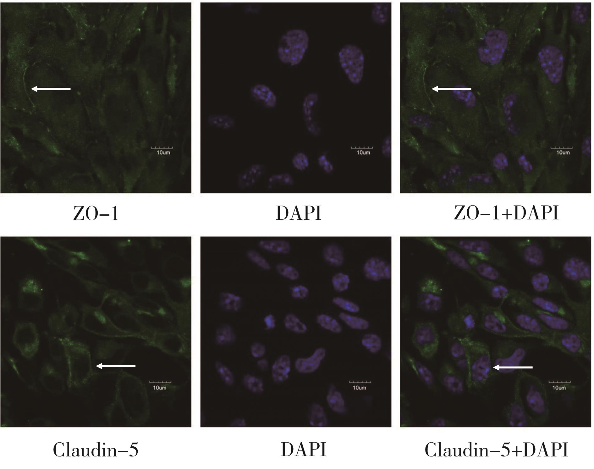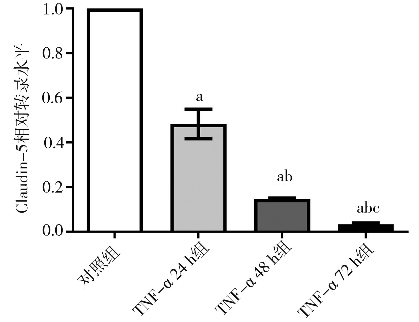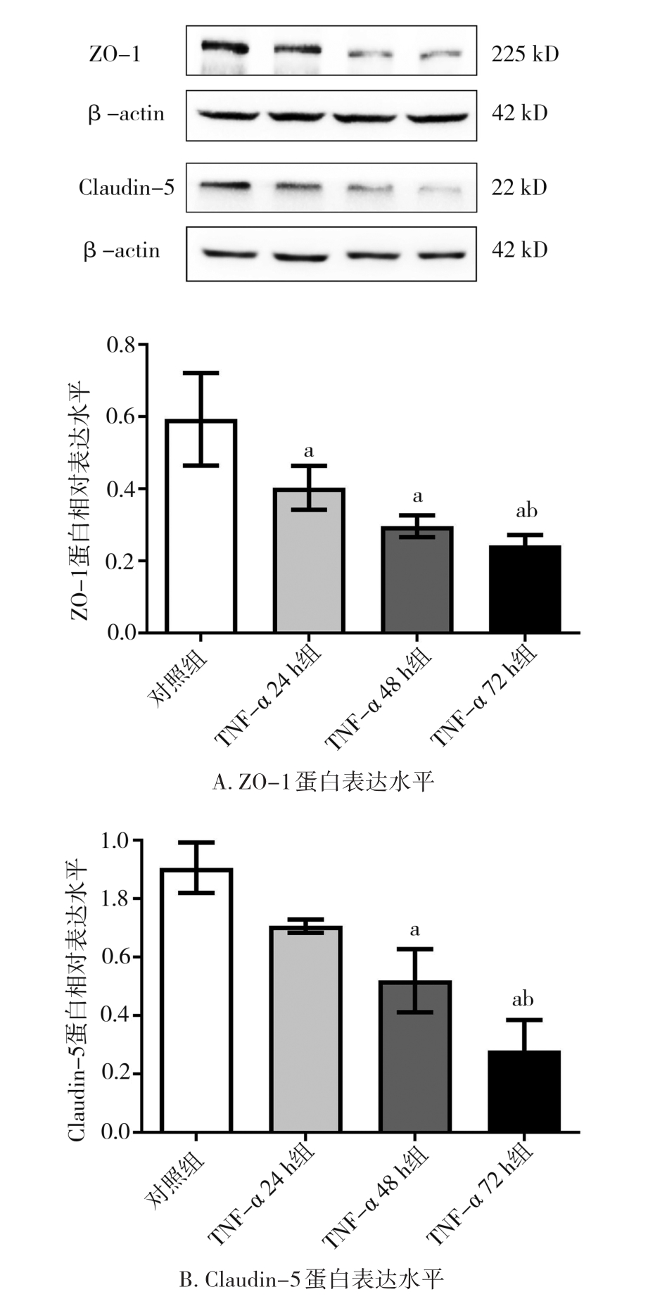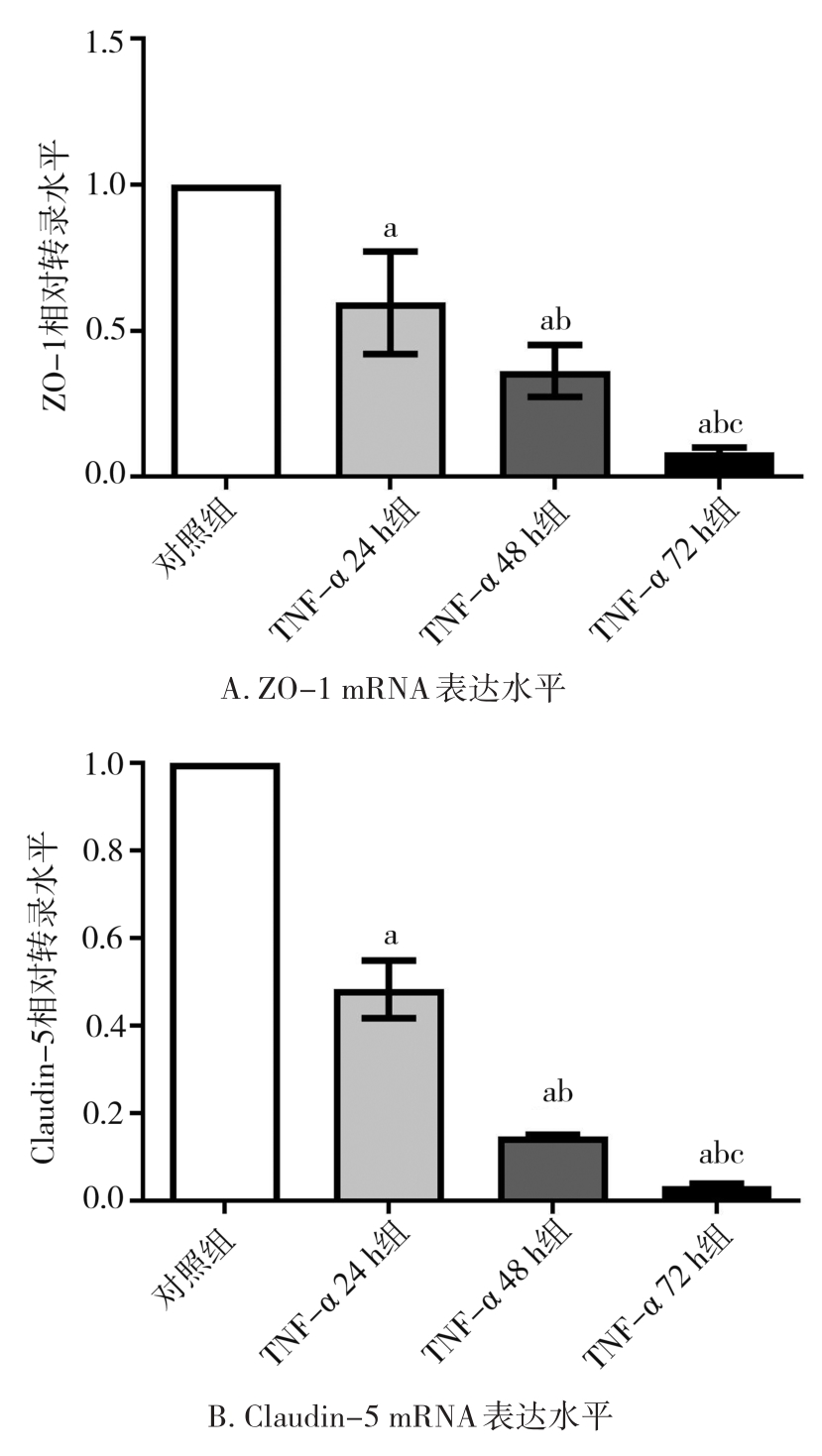 摘要:目的 研究肿瘤坏死因子-α(tumor necrosis factor-α,TNF-α)对大鼠肺微血管内皮细胞紧密连接蛋白1(zonula occludens-1,ZO-1)、Claudin-5表达的影响,探讨TNF-α对大鼠肺血管屏障的损伤机制。方法 将体外培养的大鼠肺微血管内皮细胞分为对照组、TNF-α 24 h、48 h和72 h组(TNF-α 10 mg/L)。透射电镜观察大鼠肺微血管内皮细胞超微结构。MTT法及流式细胞仪分别测定各组细胞的增殖抑制率及凋亡率。免疫荧光法测定ZO-1及Claudin-5的分布。RT-qPCR及Western blot测定各组细胞ZO-1及Claudin-5的mRNA及蛋白表达。结果 对照组内皮细胞含有大量的线粒体及内质网等结构,结构正常。TNF-α各组细胞线粒体数量减少,线粒体肿胀,嵴溶解,核固缩,凋亡细胞增多,细胞增殖抑制率及凋亡率较对照组增加(均P<0.05),呈时间依赖性。ZO-1及Claudin-5呈线状荧光分布于内皮细胞间连接部位。与对照组比较,TNF-α各组细胞ZO-1的转录及表达水平均降低(均P<0.05)。TNF-α各组Claudin-5的转录水平较对照组明显降低(均P<0.05),TNF-α 48 h、72 h组Claudin-5的蛋白表达水平较对照组降低(均P<0.05),TNF-α 24 h组与对照组比较差异无统计学意义(P>0.05)。结论 TNF-α下调大鼠微血管内皮细胞ZO-1及Claudin-5的表达,诱导细胞损伤及凋亡,破坏肺屏障,导致肺损伤。