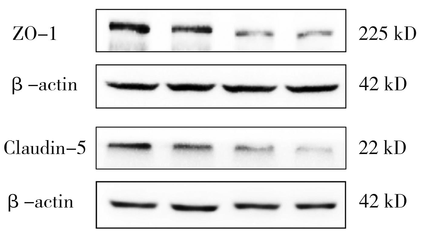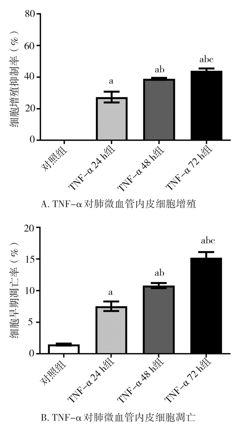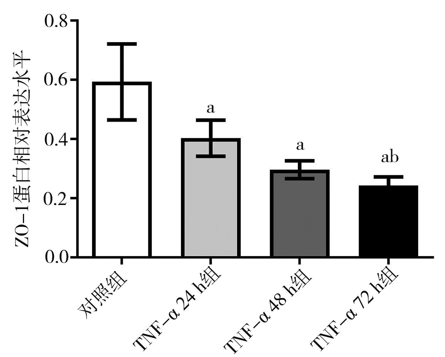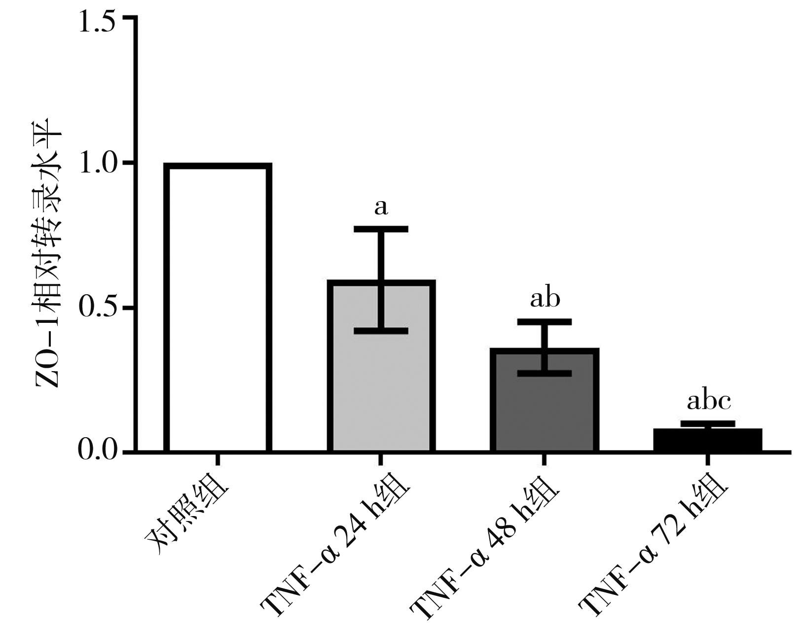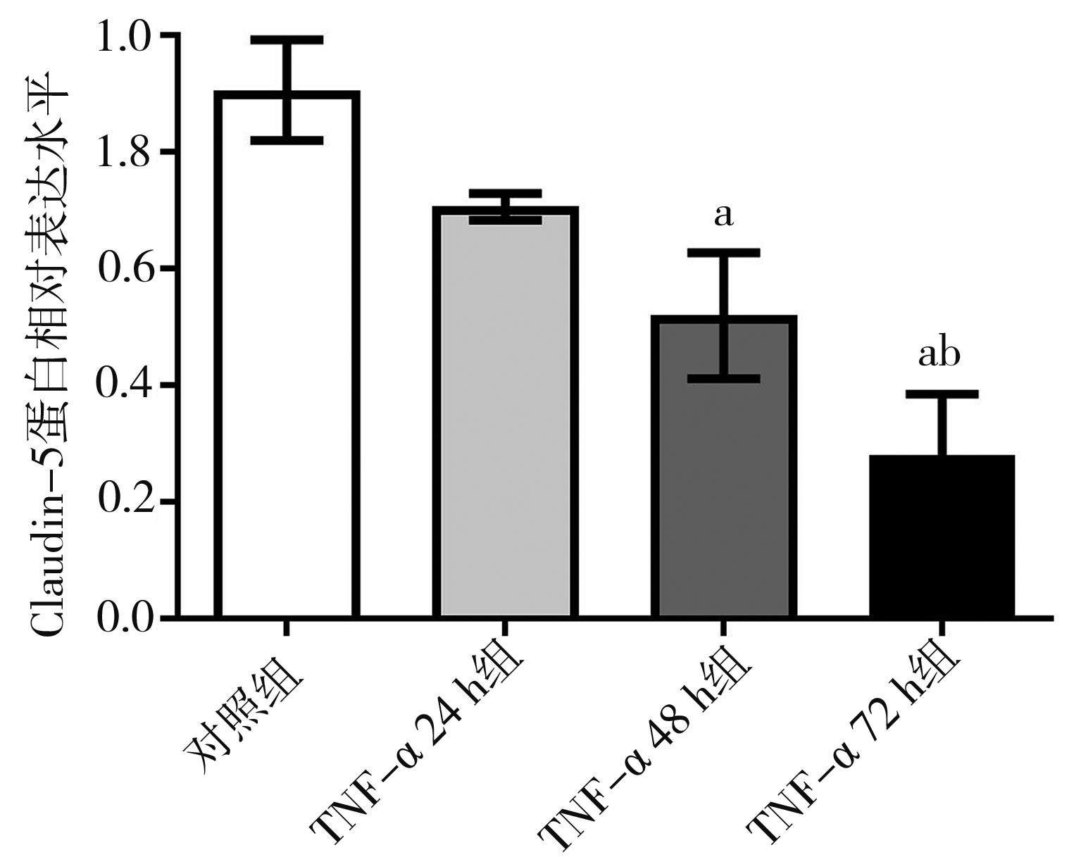 摘要:目的 研究肿瘤坏死因子-α(tumor necrosis factor-α,TNF-α)对大鼠肺微血管内皮细胞紧密连接蛋白1(zonula occludens-1,ZO-1)、Claudin-5表达的影响,探讨TNF-α对大鼠肺血管屏障的损伤机制。方法 将体外培养的大鼠肺微血管内皮细胞分为对照组、TNF-α 24 h、48 h和72 h组(TNF-α 10 mg/L)。透射电镜观察大鼠肺微血管内皮细胞超微结构。MTT法及流式细胞仪分别测定各组细胞的增殖抑制率及凋亡率。免疫荧光法测定ZO-1及Claudin-5的分布。RT-qPCR及Western blot测定各组细胞ZO-1及Claudin-5的mRNA及蛋白表达。结果 对照组内皮细胞含有大量的线粒体及内质网等结构,结构正常。TNF-α各组细胞线粒体数量减少,线粒体肿胀,嵴溶解,核固缩,凋亡细胞增多,细胞增殖抑制率及凋亡率较对照组增加(均P<0.05),呈时间依赖性。ZO-1及Claudin-5呈线状荧光分布于内皮细胞间连接部位。与对照组比较,TNF-α各组细胞ZO-1的转录及表达水平均降低(均P<0.05)。TNF-α各组Claudin-5的转录水平较对照组明显降低(均P<0.05),TNF-α 48 h、72 h组Claudin-5的蛋白表达水平较对照组降低(均P<0.05),TNF-α 24 h组与对照组比较差异无统计学意义(P>0.05)。结论 TNF-α下调大鼠微血管内皮细胞ZO-1及Claudin-5的表达,诱导细胞损伤及凋亡,破坏肺屏障,导致肺损伤。