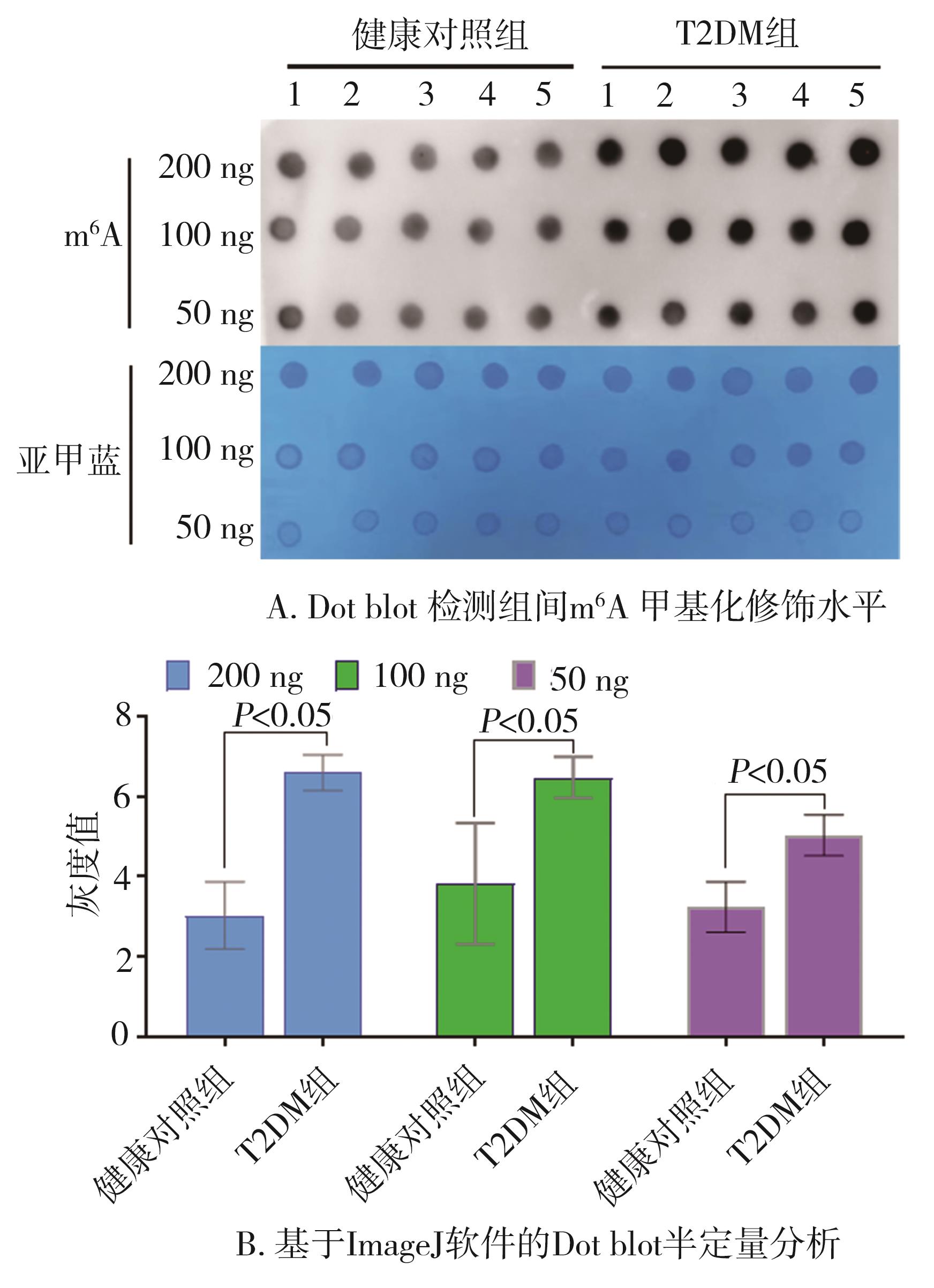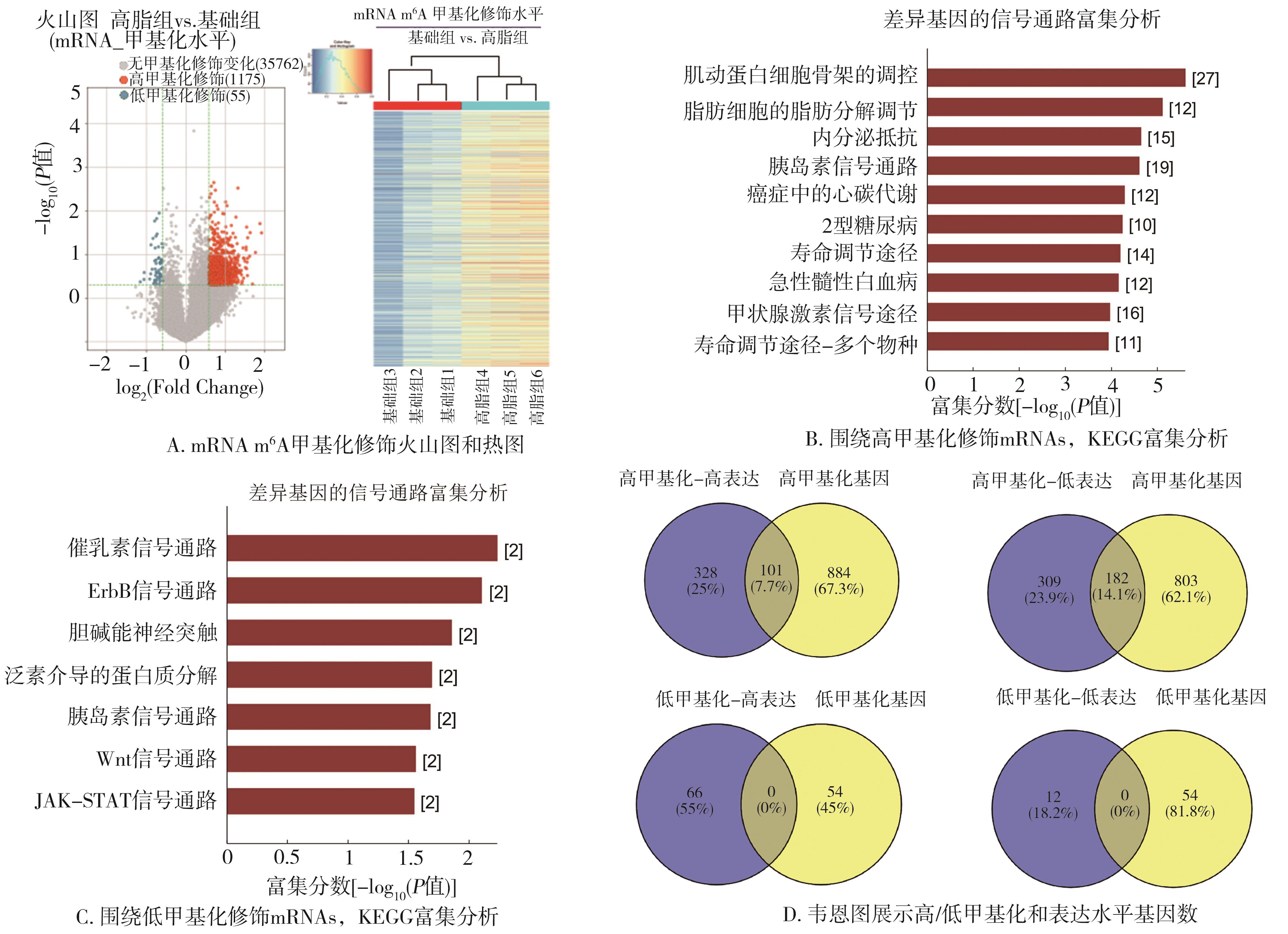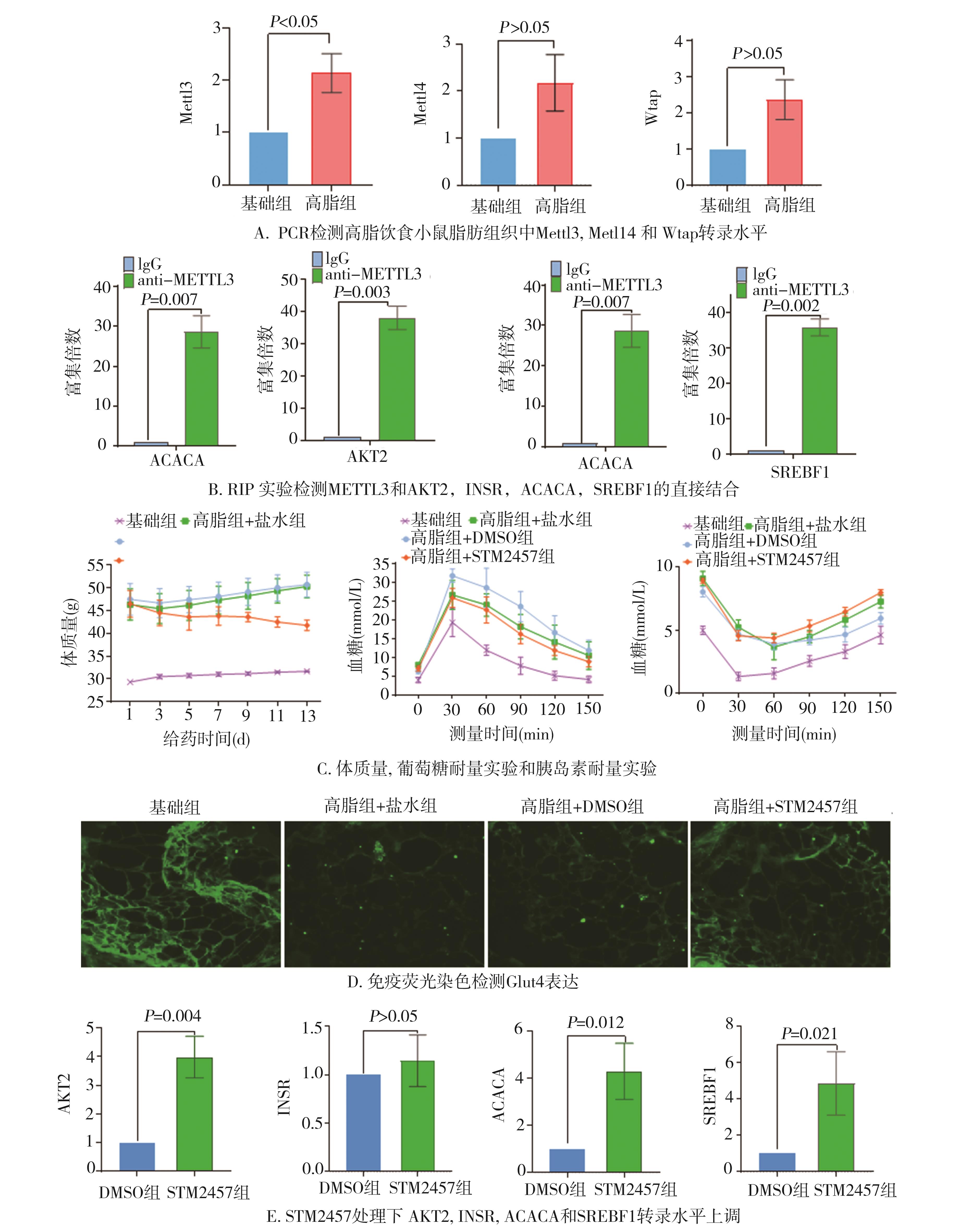 摘要:目的 探讨RNA m6A甲基化修饰在脂肪细胞胰岛素抵抗中的作用及机制。方法 收集2型糖尿病患者术中赘余皮下脂肪组织,以非2型糖尿病患者同样组织为对照,检测组间RNA m6A水平。高脂饮食诱导C57BL/6J小鼠构建胰岛素抵抗(insulin resistance,IR)模型(HFD组,n=5,60%高脂饲料喂养16周),对照组10%低脂饲料喂养16周(CD组,n=5)。模型构建成功后,取附睾周围脂肪组织行表观转录组学m6A甲基化修饰芯片检测,并借助MeRIP-qPCR实验、RT-qPCR以及RNA结合蛋白免疫沉淀测定(RNA Binding Protein Immunoprecipitation Assay,RIP)实验验证胰岛素信号转导相关基因变化;进一步观察METTL3小分子抑制剂STM2457对高脂饮食诱导下小鼠胰岛素信号转导基因的影响。结果 2型糖尿病患者和小鼠IR模型脂肪组织中总体m6A修饰水平均升高(患者200 ng RNA t=-8.375,P<0.001;患者100 ng RNA t=-3.722,P=0.006;患者50 ng RNA t=-4.937;P=0.001;小鼠100 ng RNA t=-3.590,P=0.023;小鼠50 ng RNA t=-2.760,P=0.025)。表观转录组学检测证实IR的脂肪组织中1 175个基因发生高m6A修饰,55个基因发生低m6A修饰,同时有182个基因呈现高m6A修饰且低表达,包括AKT2、INSR、PIK3R1、ACACA、SREBF1等5个胰岛素信号转导关键基因,其中AKT2、INSR、ACACA、SREBF1等4个基因被确证并证实其与METTL3存在直接结合,其m6A修饰水平受METTL3正向调控。STM2457作用下,胰岛素敏感性提高,且AKT2、INSR、ACACA、SREBF1转录水平上调,提示IR表型改善明显。结论 高脂饮食通过METTL3诱导脂肪细胞胰岛素信号转导基因AKT2、INSR、ACACA、SREBF1发生m6A高甲基化修饰,诱导其低表达,阻滞胰岛素信号转导,进而参与诱发IR。