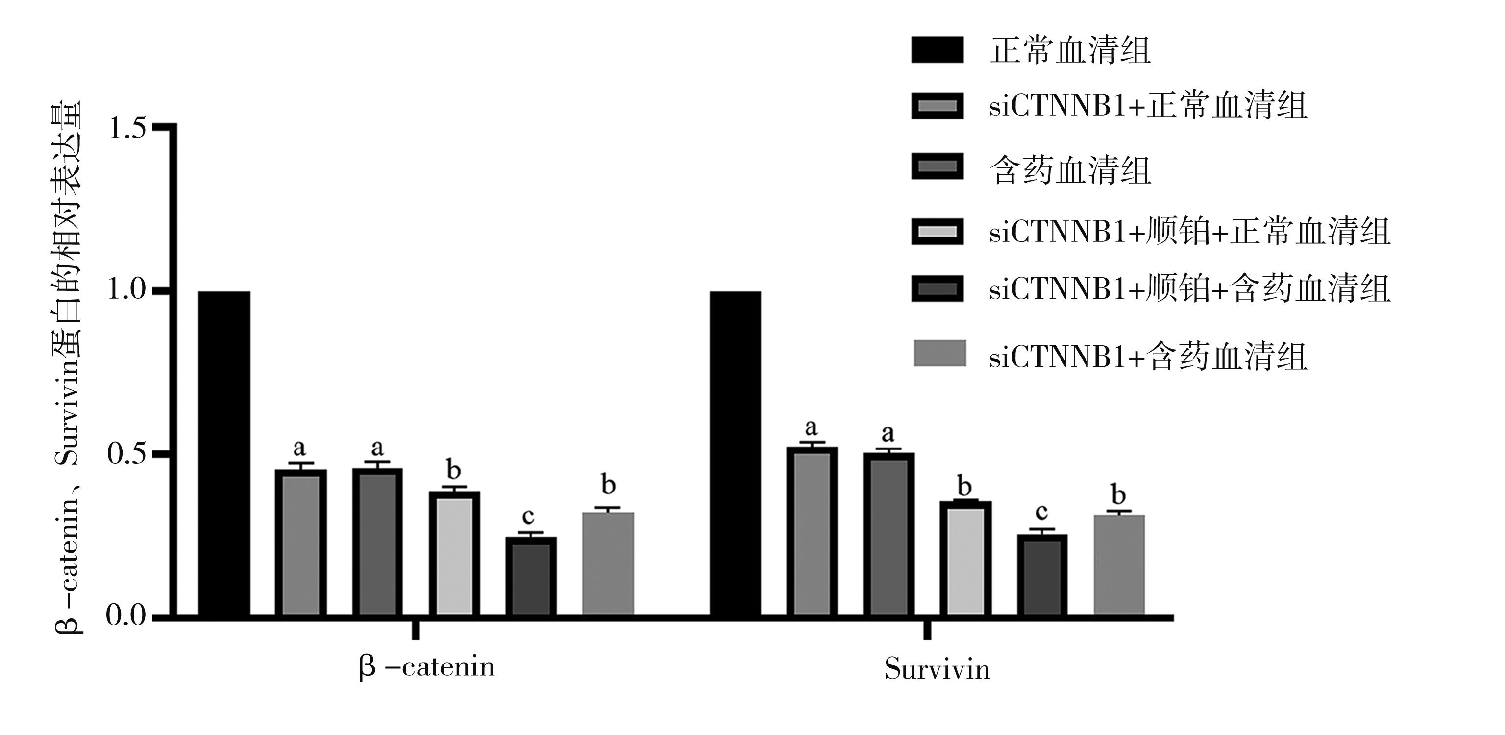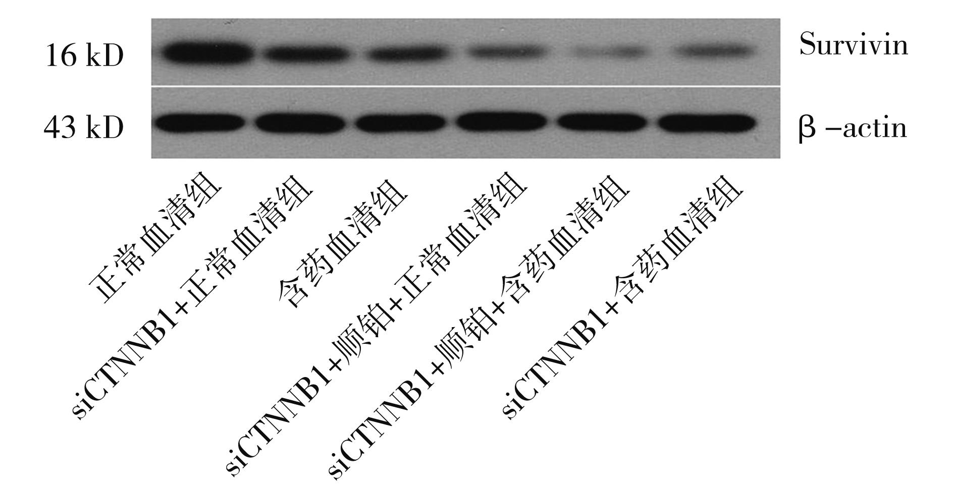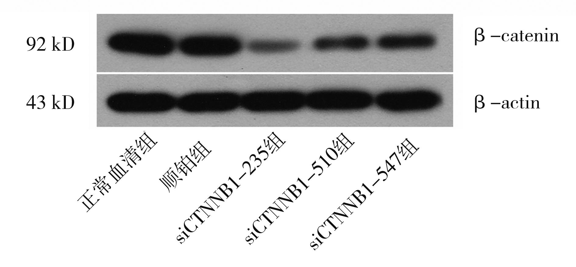 摘要:目的 探讨补中益气汤含药血清协同Siβ-catenin调控Wnt/β-catenin信号通路干预A549/DDP细胞顺铂耐药性的分子机制研究。方法 采用siRNA干扰沉默β-catenin的表达,Western blot检测正常血清组、顺铂组、siCTNNB1-235组、siCTNNB1-510组、siCTNNB1-547组A549/DDP细胞的β-catenin蛋白的相对表达量;干扰β-catenin后,Western blot检测各组A549/DDP细胞β-catenin和Survivin的蛋白表达量,MTT法检测各组A549/DDP细胞对顺铂的IC50,Annexin V/PI染色法检测各组A549/DDP细胞顺铂诱导的凋亡率。结果 相较于正常血清组(1.00),siCTNNB1-235组(0.323±0.021)对β-catenin表达抑制率达67%(P=0.000)。RNAi技术沉默β-catenin后,与正常血清组(1.00)相比,补中益气汤联合顺铂组的Survivin(0.247±0.015)和β-catenin(0.257±0.015)蛋白的表达下调更为明显(P=0.000,P=0.000)。IC50和正常血清组(28.330±1.029) μmol/L相比,单独补中益气汤含药血清(20.350±1.155) μmol/L或单独瞬时转染siCTNNB1-235组(15.577±1.535) μmol/L均可降低A549/DDP细胞顺铂的IC50(P=0.000,P=0.000),2者联合(10.453±0.999) μmol/L使用可进一步降低顺铂的IC50(P=0.000)。与正常血清组(9.130±0.384)%相比,瞬时转染siCTNNB1-235联合顺铂组(64.393±0.244)%和补中益气汤联合顺铂组(70.120±0.400)%的总凋亡率均升高(P=0.000,P=0.000)。结论 补中益气汤含药血清和瞬时转染siβ-catenin在抑制Wnt/β-catenin信号通路改善肺腺癌顺铂耐药性方面具有协同效应,且补中益气汤具有siβ-catenin瞬时转染样效应。