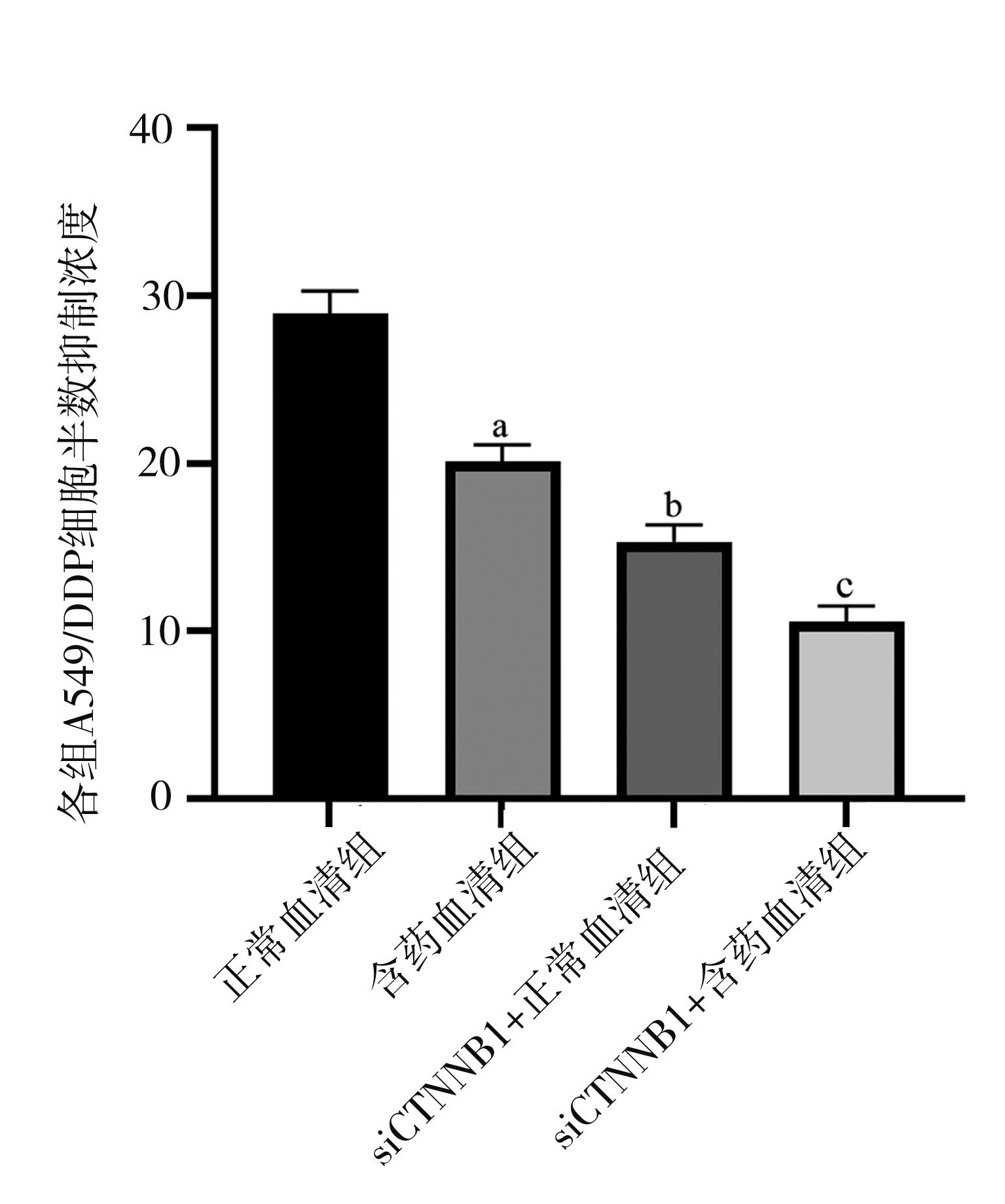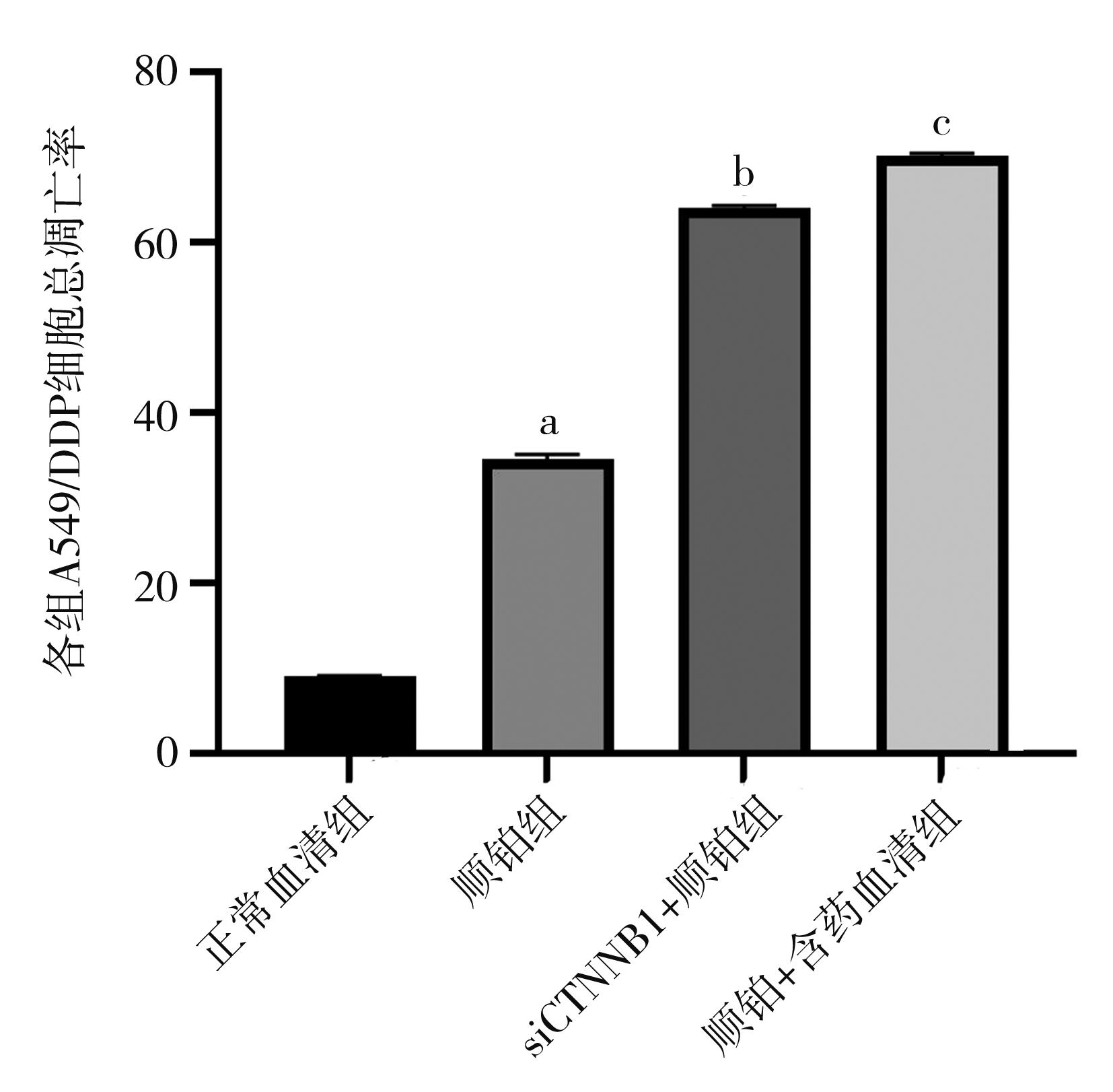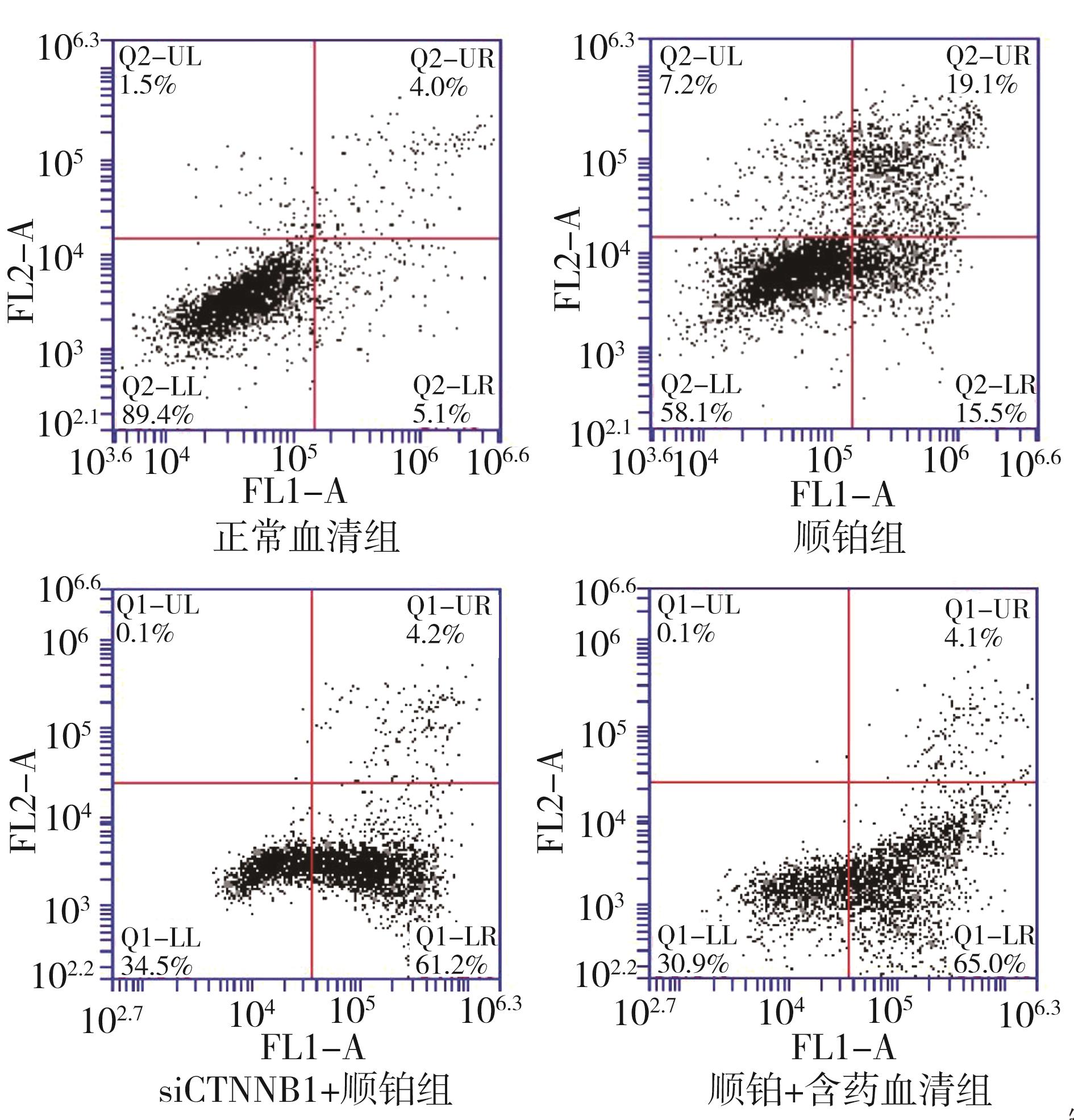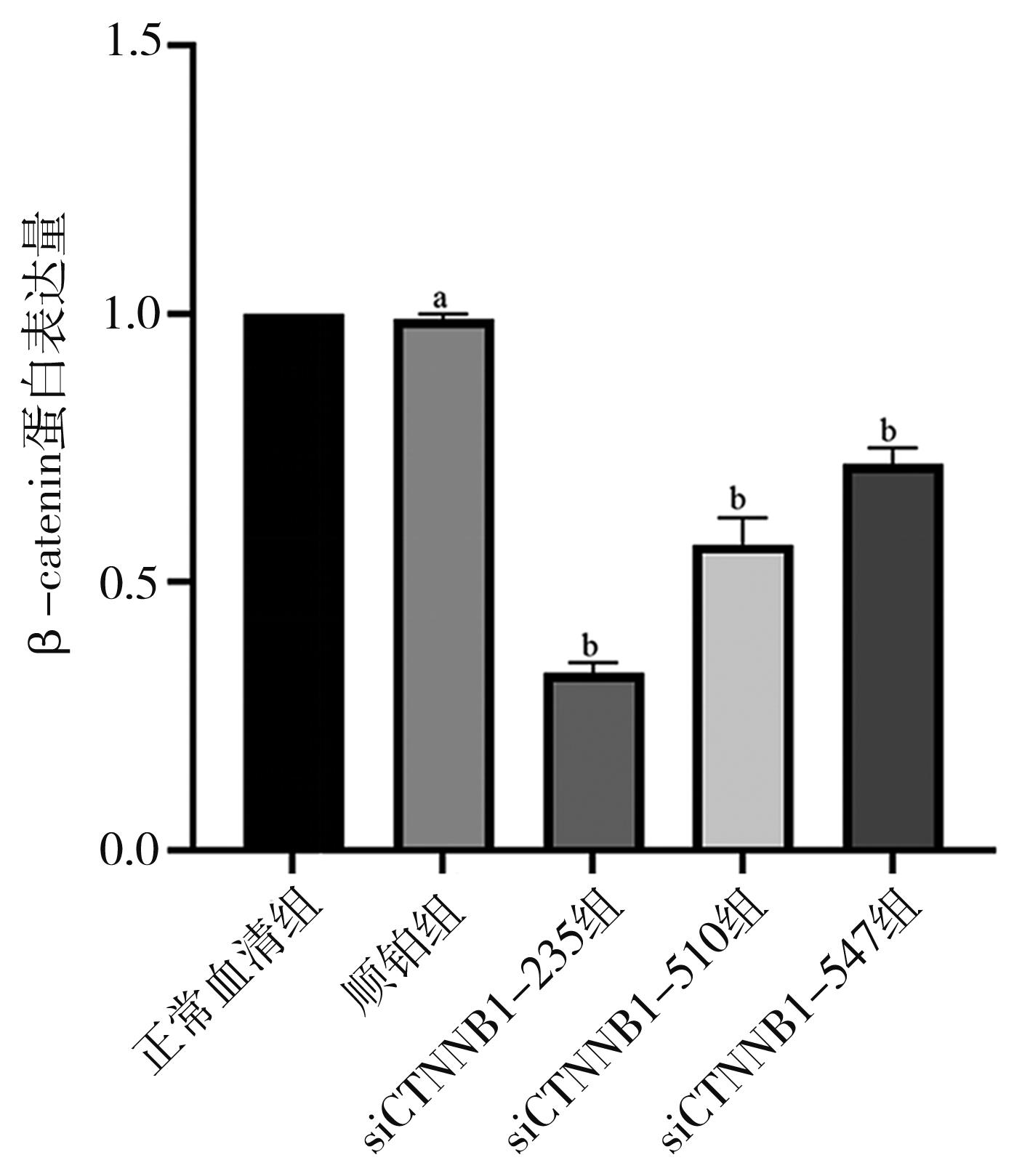 摘要:目的 探讨补中益气汤含药血清协同Siβ-catenin调控Wnt/β-catenin信号通路干预A549/DDP细胞顺铂耐药性的分子机制研究。方法 采用siRNA干扰沉默β-catenin的表达,Western blot检测正常血清组、顺铂组、siCTNNB1-235组、siCTNNB1-510组、siCTNNB1-547组A549/DDP细胞的β-catenin蛋白的相对表达量;干扰β-catenin后,Western blot检测各组A549/DDP细胞β-catenin和Survivin的蛋白表达量,MTT法检测各组A549/DDP细胞对顺铂的IC50,Annexin V/PI染色法检测各组A549/DDP细胞顺铂诱导的凋亡率。结果 相较于正常血清组(1.00),siCTNNB1-235组(0.323±0.021)对β-catenin表达抑制率达67%(P=0.000)。RNAi技术沉默β-catenin后,与正常血清组(1.00)相比,补中益气汤联合顺铂组的Survivin(0.247±0.015)和β-catenin(0.257±0.015)蛋白的表达下调更为明显(P=0.000,P=0.000)。IC50和正常血清组(28.330±1.029) μmol/L相比,单独补中益气汤含药血清(20.350±1.155) μmol/L或单独瞬时转染siCTNNB1-235组(15.577±1.535) μmol/L均可降低A549/DDP细胞顺铂的IC50(P=0.000,P=0.000),2者联合(10.453±0.999) μmol/L使用可进一步降低顺铂的IC50(P=0.000)。与正常血清组(9.130±0.384)%相比,瞬时转染siCTNNB1-235联合顺铂组(64.393±0.244)%和补中益气汤联合顺铂组(70.120±0.400)%的总凋亡率均升高(P=0.000,P=0.000)。结论 补中益气汤含药血清和瞬时转染siβ-catenin在抑制Wnt/β-catenin信号通路改善肺腺癌顺铂耐药性方面具有协同效应,且补中益气汤具有siβ-catenin瞬时转染样效应。