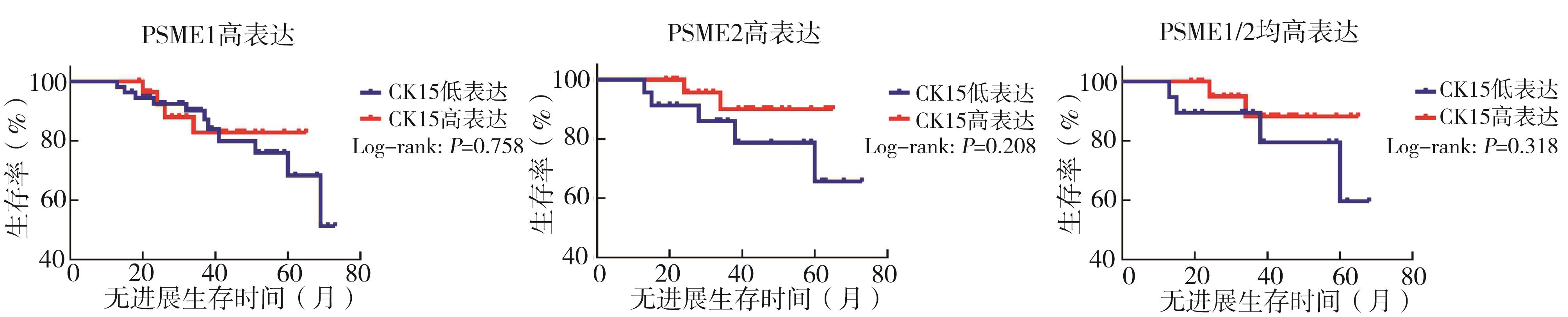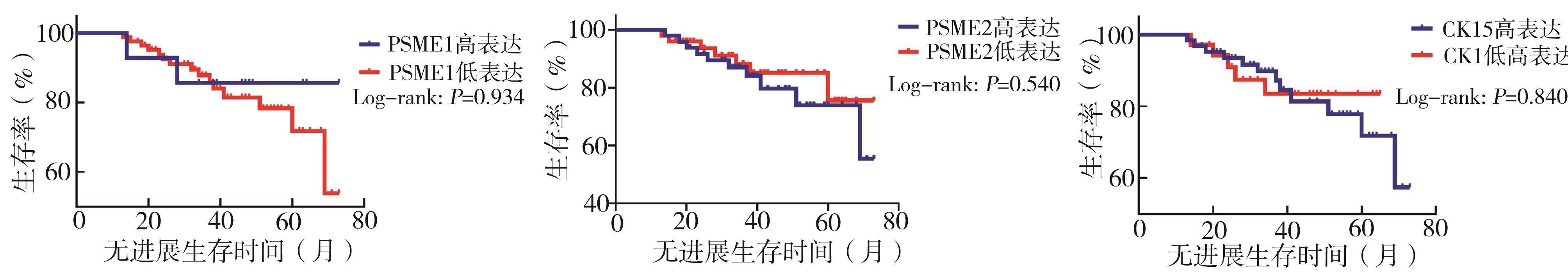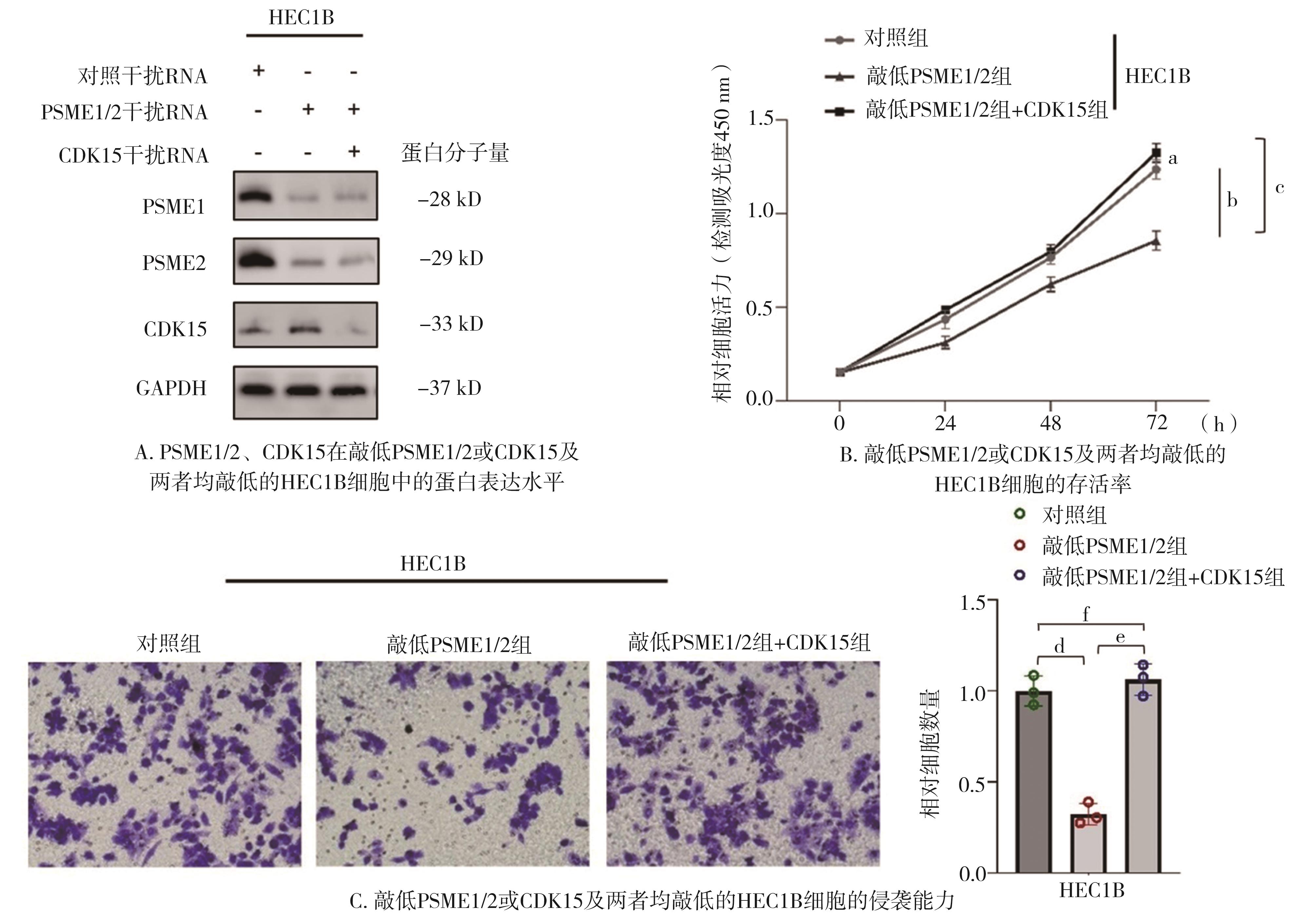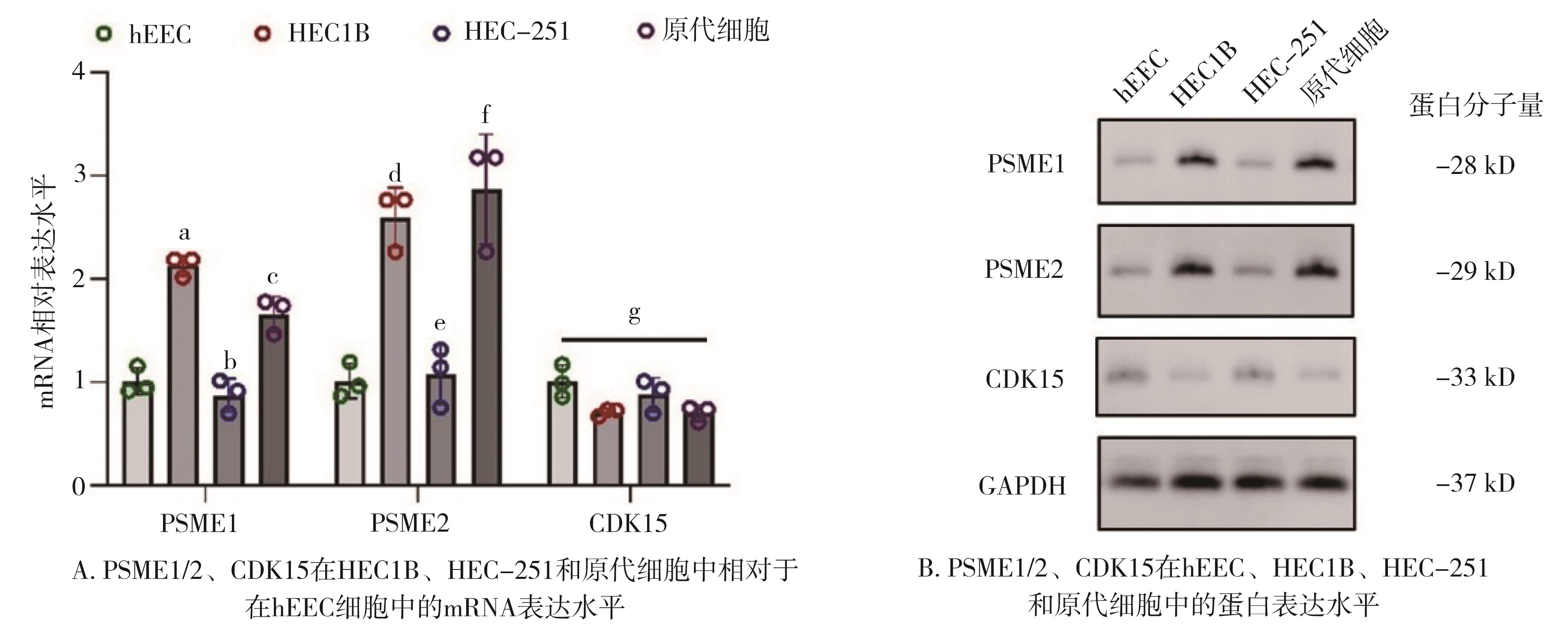 摘要:目的 探索人类蛋白酶体激活剂(proteasome activator subunit,PSME)1/2在子宫内膜癌(endometrial carcinoma,EC)中的表达水平及其对EC细胞增殖和侵袭的影响。方法 检测子宫内膜细胞系和原代细胞中PSME1/2和细胞周期蛋白依赖性激酶15(cyclin-dependentkinase 15,CDK15)的表达,以敲低株分析PSME1/2与CDK15的表达相关性及其对肿瘤增殖和侵袭影响。比较PSME1/2和CDK15在EC组织和癌旁组织中的表达水平差异,并分析其对EC患者预后的影响。结果 与人正常子宫内膜细胞系相比,PMSE1/2在HEC1B(human endometrial adenocarcinoma cells,HEC1B)及原代细胞中mRNA(messenger RNA,mRNA)高表达和蛋白高表达,CDK15蛋白表达量下降。与对照组和双敲组比,CDK15在HEC1B系PSME1/2敲低株的蛋白表达升高,提示CDK15可能受PSME1/2抑制。在EC组织PMSE1/2高表达,CDK15低表达。PSME1/2表达与患者临床资料如年龄、术后诊断分型、分化程度、术后分期等差异无统计学意义(P>0.05)。PSME1/2、CDK15的表达与EC患者的不良预后无明显相关性(P>0.05)。结论 PSME1/2抑制CDK15的表达而促进EC细胞的增殖和侵袭,PSME1/2具有促EC作用。