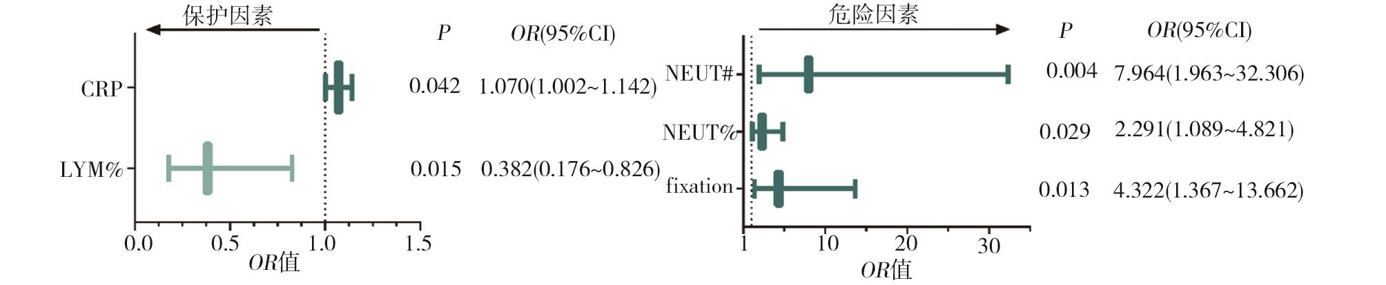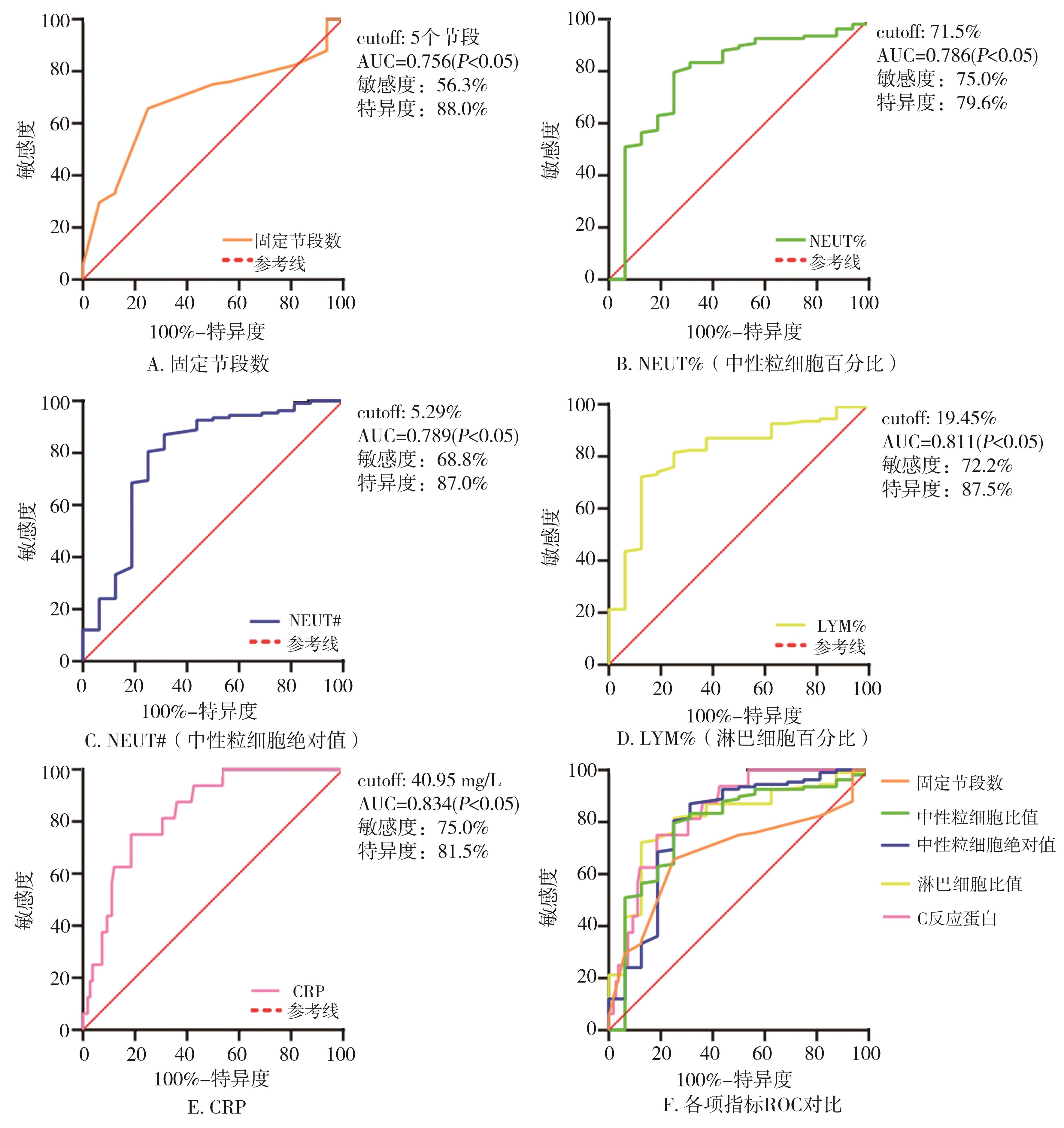 摘要:目的 分析胸腰椎结核患者术后切口愈合不良(poor wound healing,PWH)的风险因素。方法 回顾性纳入重庆医科大学附属第一医院骨科2019年1月至2021年10月接受后入路胸腰椎结核病灶清除+植骨融合内固定术的124例患者,其中16例发生PWH,108例未发生PWH。根据术后是否出现PWH分为PWH组和非PWH组。对比研究2组患者术前资料,包括:性别、年龄、吸烟/饮酒史、是否合并高血压/肺结核/糖尿病、手术固定节段数、体质指数(body mass index,BMI)、平均红细胞体积(mean corpuscular volume,MCV)、平均红细胞血红蛋白含量(mean corpuscular hemoglobin,MCH)、平均红细胞血红蛋白浓度(mean corpuscular hemoglobin concentration,MCHC)、血红蛋白(hemoglobin,Hb)、血小板(platelet,PLT)、中性粒细胞计数和百分比、淋巴细胞计数和百分比、单核细胞计数和百分比、血红蛋白、前白蛋白、白蛋白、红细胞沉降率(erythrocyte sedimentation rate,ESR)和C反应蛋白(C-reactive protein,CRP)。采用单变量分析、多因素二元逻辑回归及受试者工作特征(receiver operating characteristic,ROC)曲线分析探讨影响因素。结果 单变量分析结果发现:合并肺结核(χ2=5.458,P=0.019)、手术固定节段数(Z=-3.407,P=0.001)、PLT(Z=-2.766,P=0.006)、MCV(Z=2.957,P=0.004)、MCH(Z=-3.001,P=0.003)、MCHC(Z=2.379,P=0.019)、中性粒细胞绝对值(Z=-3.723,P<0.001)、中性粒细胞百分比(Z=-3.678,P<0.001)、淋巴细胞百分比(Z=3.798,P<0.001)、Hb(Z=-3.225,P=0.001)、前白蛋白(Z=3.988,P<0.001)、白蛋白(Z=-3.562,P<0.001)、ESR(Z=-2.971,P=0.003)、CRP(Z=-4.305,P<0.001)为明显危险因素。经多因素二元logistic回归分析得出:手术固定节段数、术前中性粒细胞百分比、术前中性粒细胞绝对值、术前淋巴细胞百分比和CRP为胸腰椎结核患者术后PWH的独立危险因素。ROC曲线分析显示,手术固定节段数、术前中性粒细胞百分比、术前中性粒细胞绝对值、术前淋巴细胞百分比和 CRP最佳临界值分别为5个节段、71.5%、5.29×109/L、19.45%和40.95 mg/L。结论 缩短切口长度以减少手术创伤,术前监测中性粒细胞、淋巴细胞以及CRP水平,可减少胸腰椎结核患者术后发生PWH的风险。