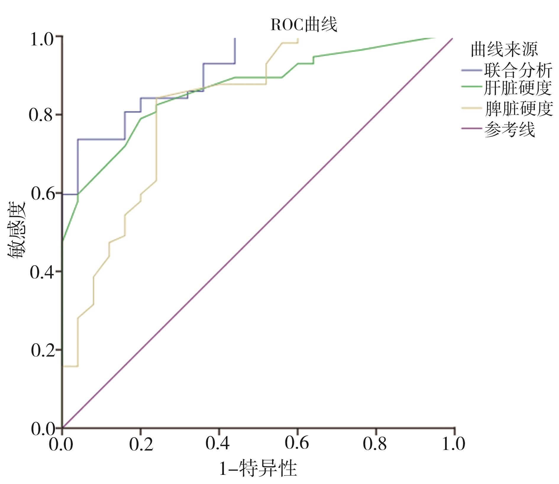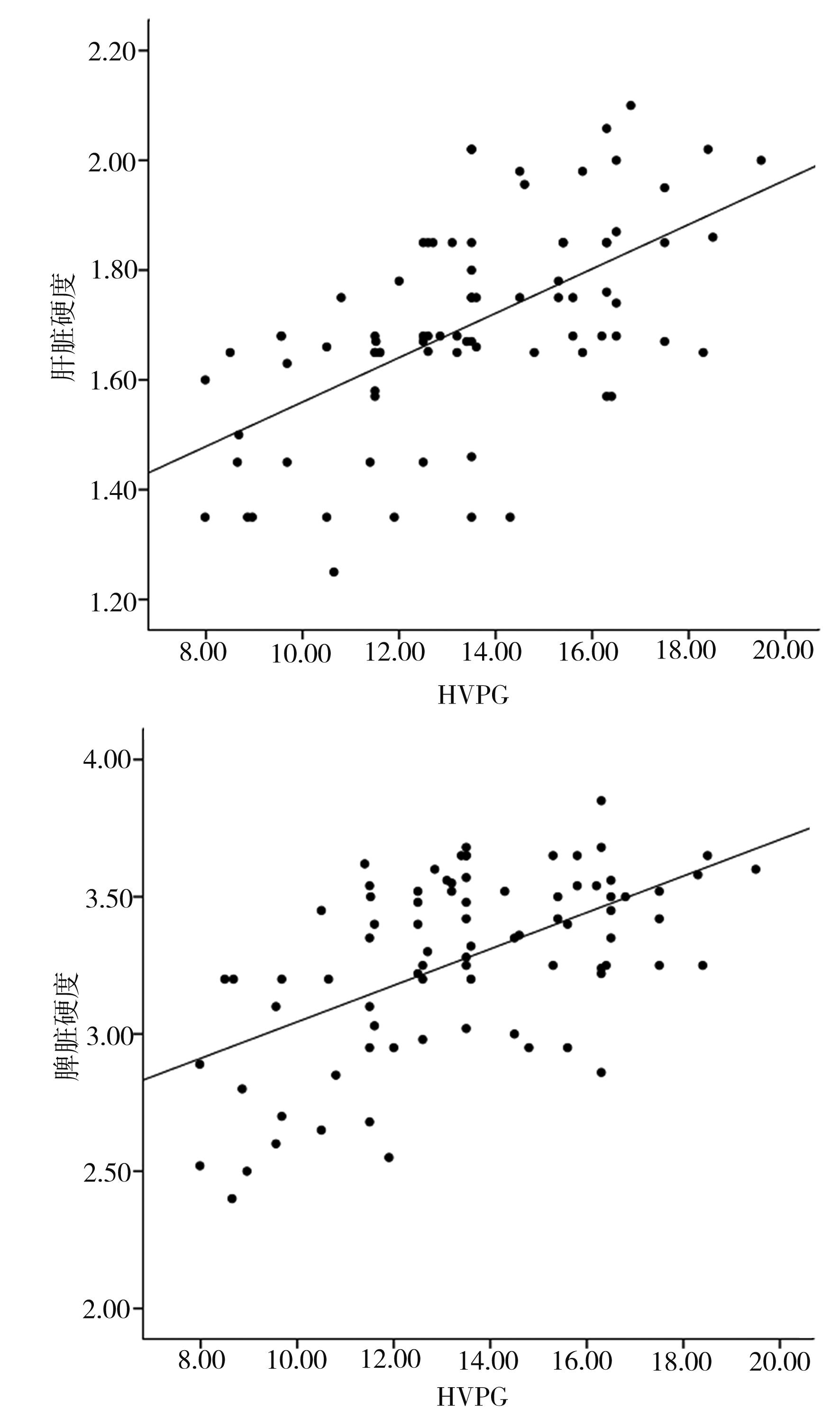 摘要:目的 探究病毒性肝硬化患者肝脾脏硬度变化及与肝静脉压力梯度的相关性。方法 将2020年9月至2021年12月在兰州市第二人民医院超声科进行病毒性肝硬化治疗的82例患者作为研究对象,检测患者肝静脉压力梯度(hepatic venous pressure gradient,HVPG)和肝脾硬度。采用Pearson相关性分析评估病毒性肝硬化患者肝脾脏硬度变化与肝静脉压力梯度的相关性;并采用受试者工作特征(receiver operating characteristic,ROC)曲线评估肝脾脏硬度对肝硬化患者HVPG≥12 mmHg的预测价值。结果 病毒性肝硬化Child-pugh B级和Child-pugh C级患者HVPG(F=16.643,P<0.001)、肝脏硬度(F=14.403,P<0.001)、脾脏硬度(F=11.775,P<0.001)明显高于Child-pugh A级患者。患者HVPG与肝脏硬度和脾脏硬度均呈正相关(r=0.591,0.502,P<0.001)。肝脏硬度、脾脏硬度及联合分析预测肝硬化患者HVPG≥12 mmHg的ROC曲线下面积(area under the curve,AUC)分别为0.866、0.821、0.914。结论 病毒性肝硬化患者肝脾脏硬度与HVPG呈正相关,且对门静脉高压的无创诊断有一定预测价值。