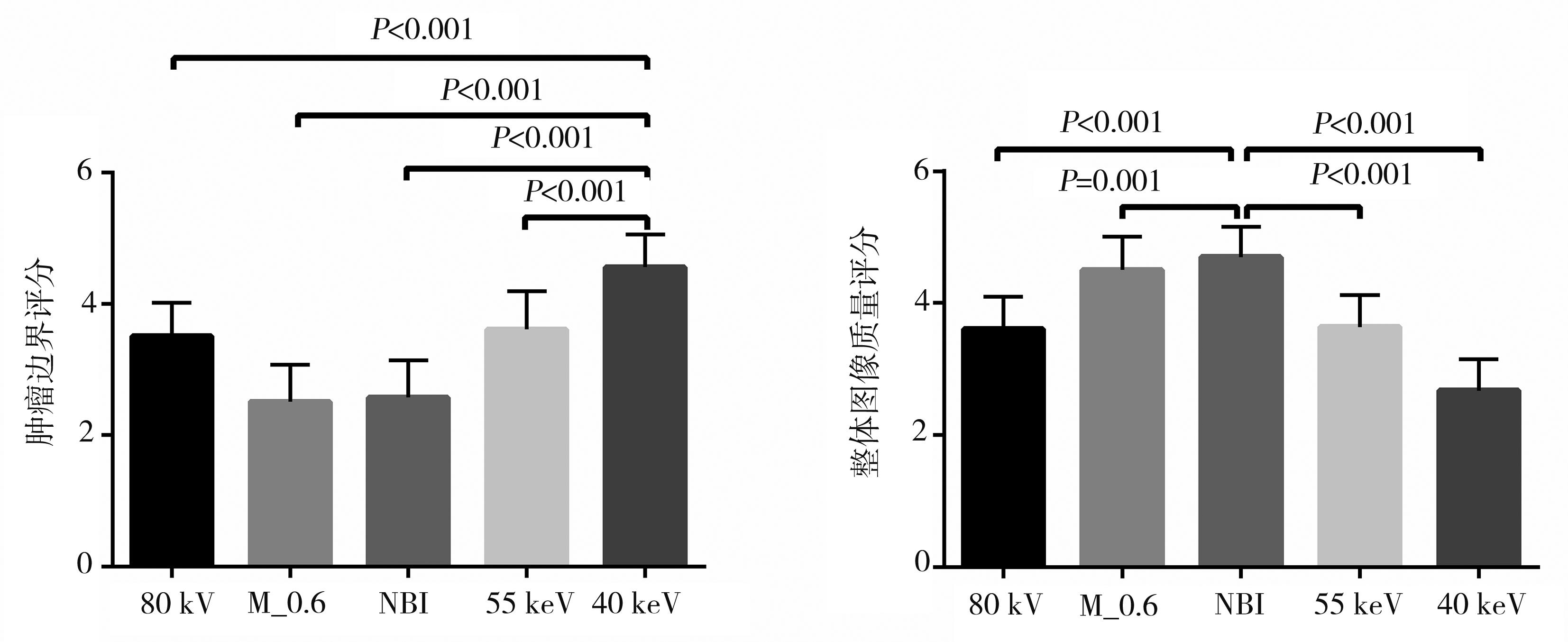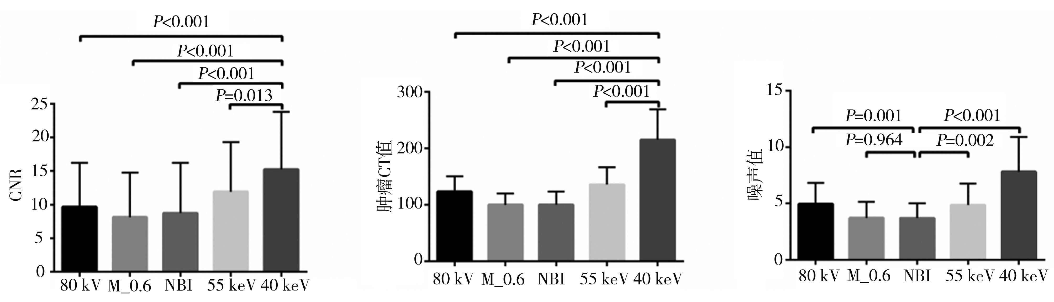 摘要:目的 探讨双能量CT线性融合图像(linear blending imaging,LBI)、非线性融合图像(nonlinear blending image,NBI)和噪声优化的虚拟单能量图像(noise-optimized virtual monoenergetic image,VMI+)技术在喉鳞状细胞癌中的应用价值。方法 回顾性分析2019年6月至2022年3月61例经病理证实为喉鳞状细胞癌患者的双能量CT资料。双能量图像采用LBI[融合系数为1(80 kV)和0.6(M0.6)]、NBI和VMI+(40 keV、55 keV)技术重建。比较5组图像的客观图像质量[对比噪声比(contrast-to-noise ratio,CNR)、肿瘤CT值、噪声]和主观图像质量(肿瘤边界评分和整体图像质量评分)。结果 40 keV的CNR、肿瘤CT值和肿瘤边界评分均明显高于80 kV、M0.6、NBI和55 keV,差异均有统计学意义(均P<0.05)。NBI的整体图像质量评分明显高于80 kV、M0.6、40 keV和55 keV,差异均有统计学意义(均P<0.05)。NBI的噪声明显低于80 kV、40 keV和55 keV,差异均有统计学意义(均P<0.05)。结论 在喉鳞状细胞癌的双能量CT中,采用VMI+技术(40 keV)能提供更好的CNR、肿瘤CT值和肿瘤边界,采用NBI技术能提供更低的噪声和更好的整体图像质量。