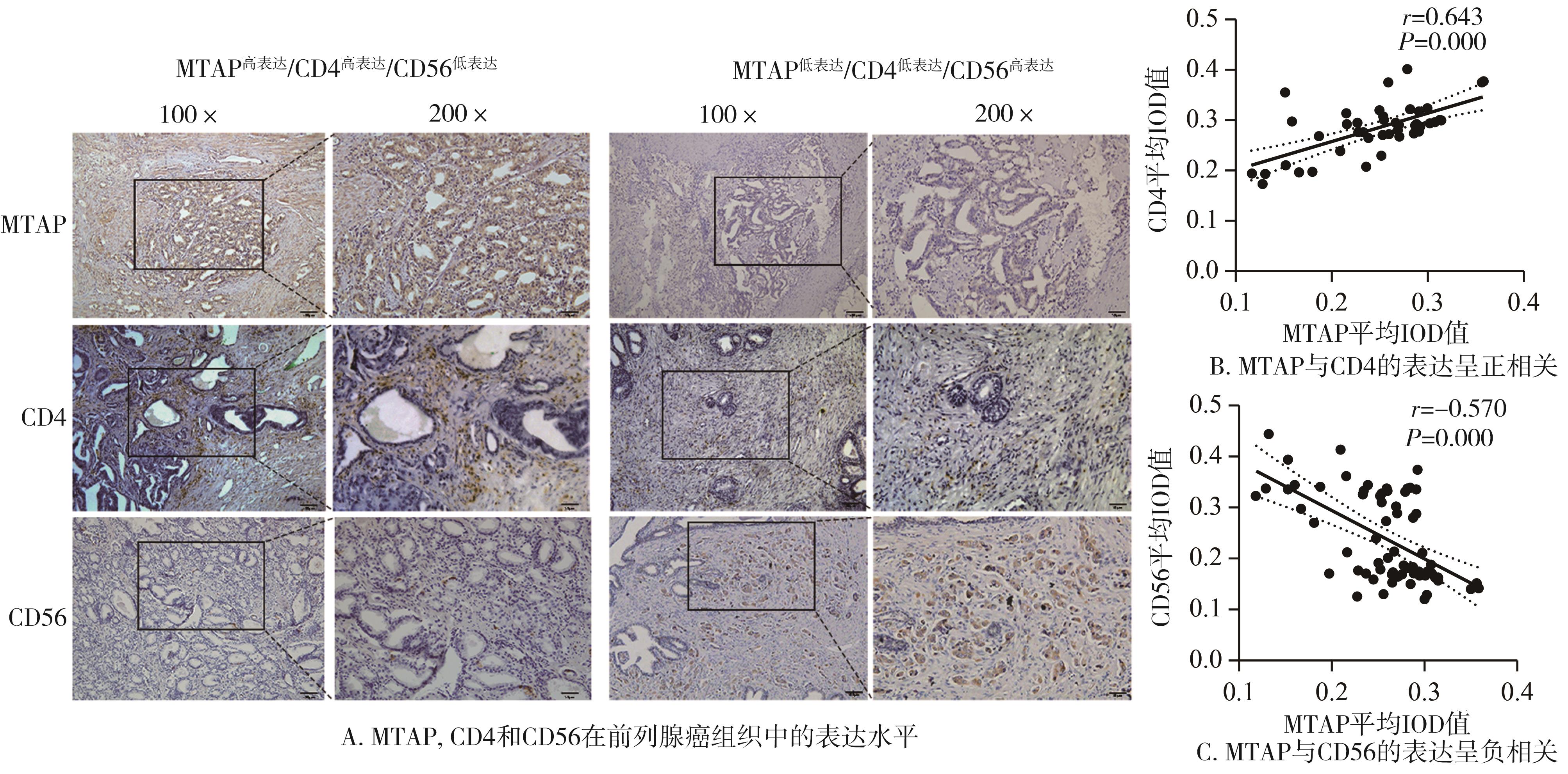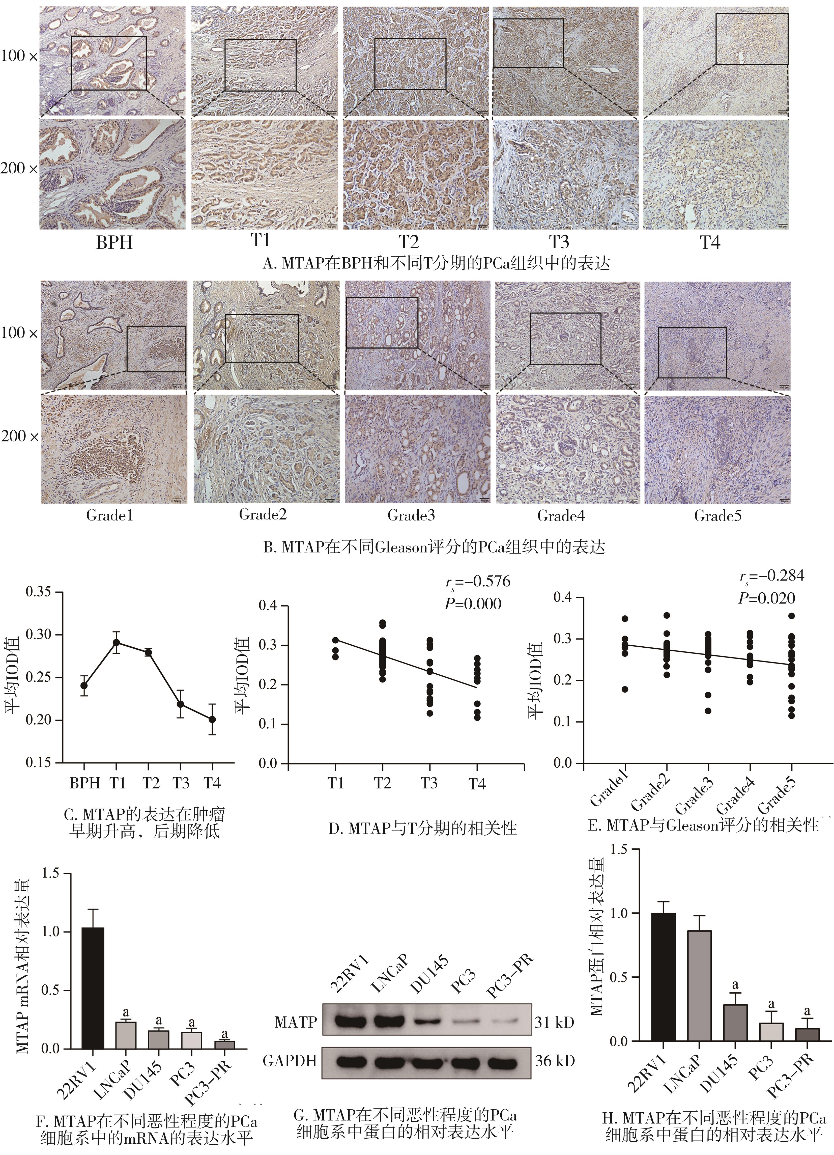 摘要:目的 探究甲硫腺苷磷酸化酶(methylthioadenosine phosphorylase,MTAP)在前列腺癌不同临床阶段的表达差异及其对免疫细胞的影响。方法 从TCGA和GTEx数据库中获取MTAP的表达谱数据,利用生物信息学方法进行泛癌分析。免疫组化验证上述结论并探究MTAP与临床病理指标之间的关联。RT-qPCR和Western blot检测MTAP在不同前列腺癌细胞系中的表达水平,分析MTAP与肿瘤恶性程度之间的关联。生物信息学方法分析前列腺癌中MTAP与免疫细胞的关联并进行免疫组化验证。结果 在前列腺癌中,MTAP的表达在肿瘤发生早期升高后逐渐降低,与T分期和Gleason评分呈负相关(rs=-0.576,P=0.000,rs=-0.284,P=0.020)。MTAP与多种免疫细胞存在相关关系,其中MTAP与CD4+T细胞呈正相关(r=0.643,P=0.000),与NK CD56bright细胞呈负相关(r=-0.570,P=0.000)。结论 前列腺癌中,MTAP的表达呈现早期升高后逐渐下降的趋势,与T分期和Gleason评分呈负相关。MTAP对免疫细胞的浸润和细胞功能的发挥有调节作用,是一种潜在的生物学标志物和免疫治疗靶点。