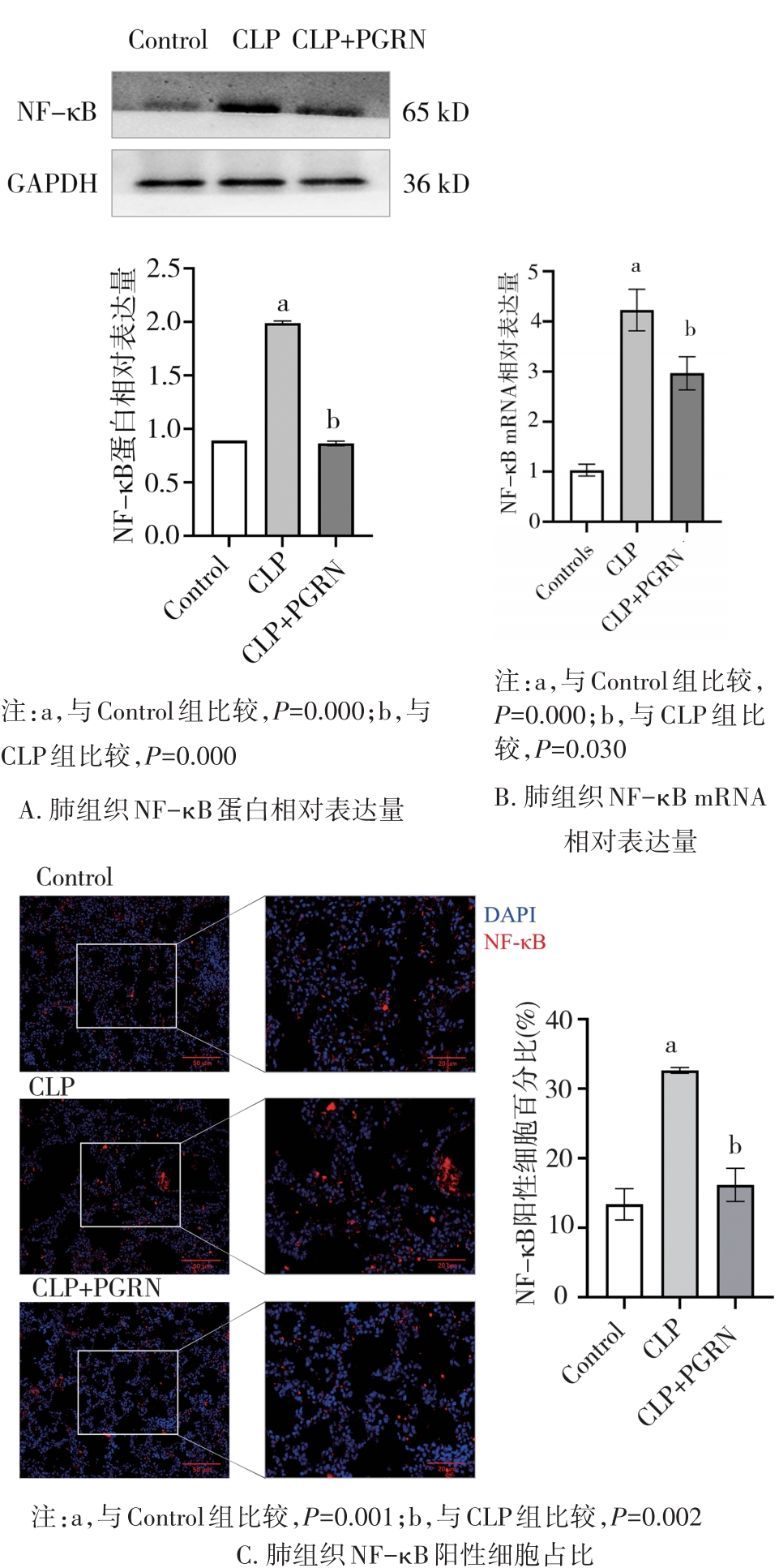 目的 探讨颗粒蛋白前体(progranulin,PGRN)对脓毒症急性肺损伤(acute lung injury,ALI)的影响及可能机制。方法 将C57BL/6小鼠随机分为对照组(Control组)、急性肺损伤组(CLP组)、颗粒蛋白前体治疗组(CLP+PGRN组)。采用盲肠结扎穿刺术(cecal ligation and puncture,CLP)构建小鼠脓毒症ALI模型,CLP+PGRN组在CLP处理半小时后使用PGRN腹腔注射。24 h后麻醉并处死小鼠,取小鼠肺HE染色观察肺组织病理损伤;TUNEL法检测肺部细胞凋亡情况;免疫荧光染色检测肺组织中核转录因子-κB(nuclear factor kappa B,NF-κB)水平;Western blot法检测NF-κB、总p65和磷酸化p65表达水平;RT-qPCR检测NF-κB和炎症细胞因子水平。结果 和Control组相比,CLP组和CLP+PGRN组肺损伤加重,促炎细胞因子升高,肺组织中细胞凋亡增加,NF-κB、p65和p-p65的表达水平明显增加;与CLP组相比,CLP+PGRN组肺组织损伤和凋亡减轻,促炎细胞因子降低,抑炎细胞因子升高,NF-κB、p65和p-p65的表达明显减少。结论 PGRN可以减轻脓毒症小鼠急性肺损伤,其机制可能与抑制NF-κB、p65表达和p65磷酸化有关。